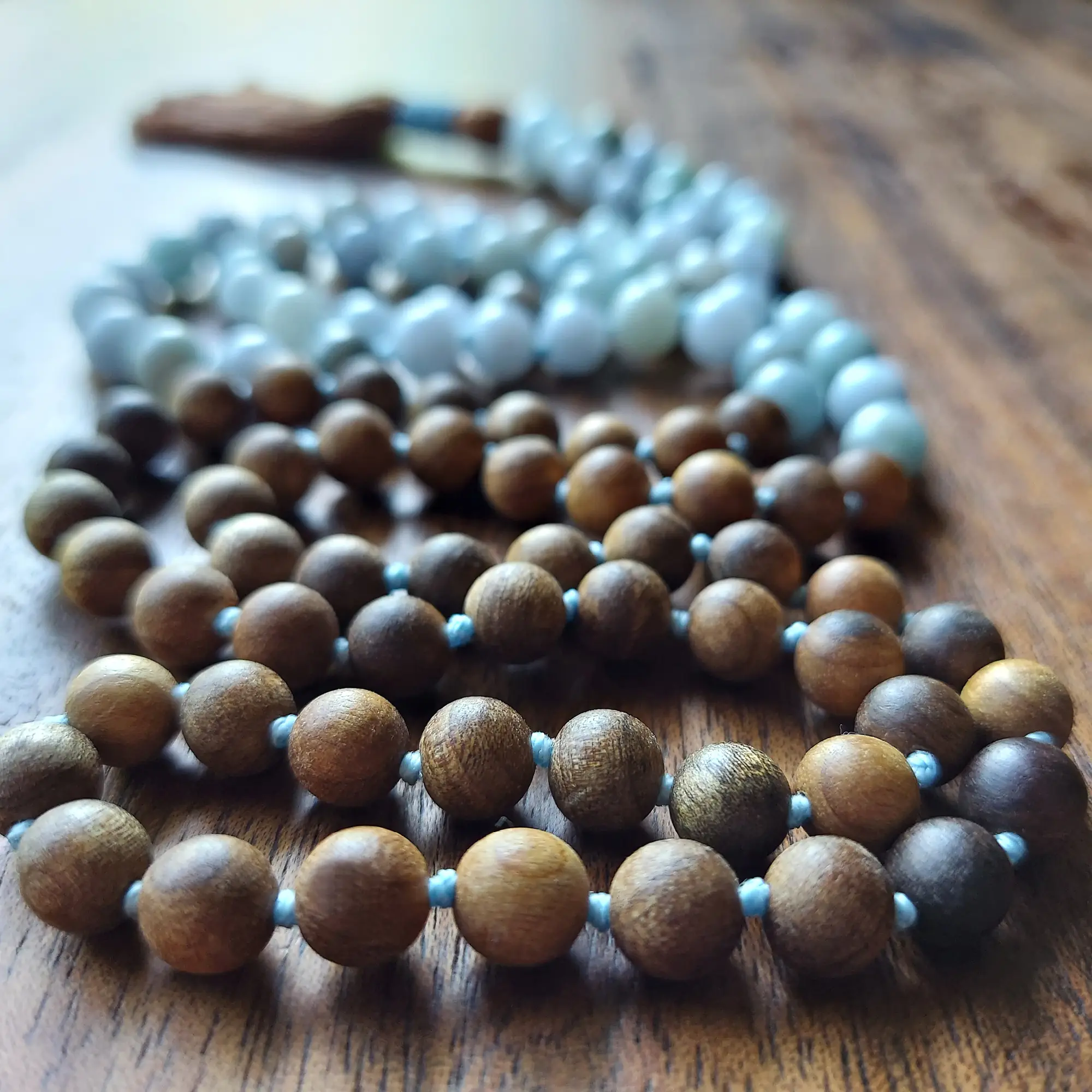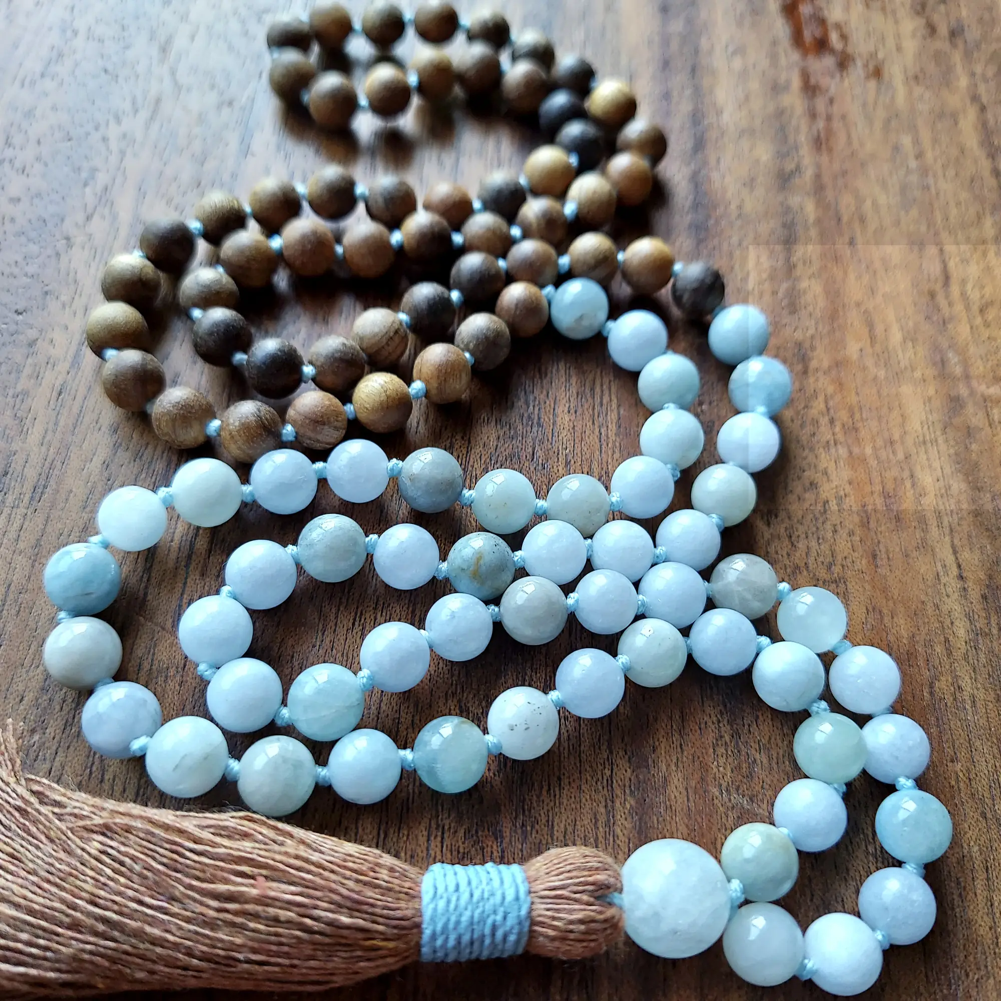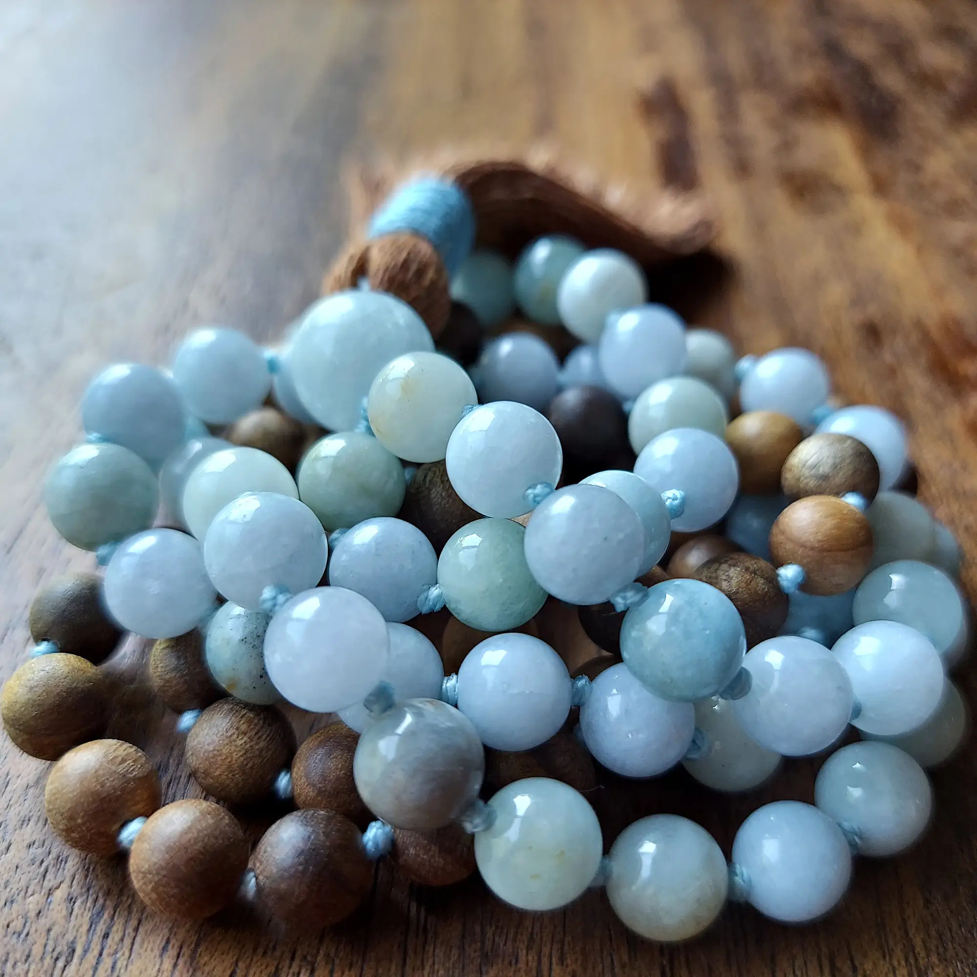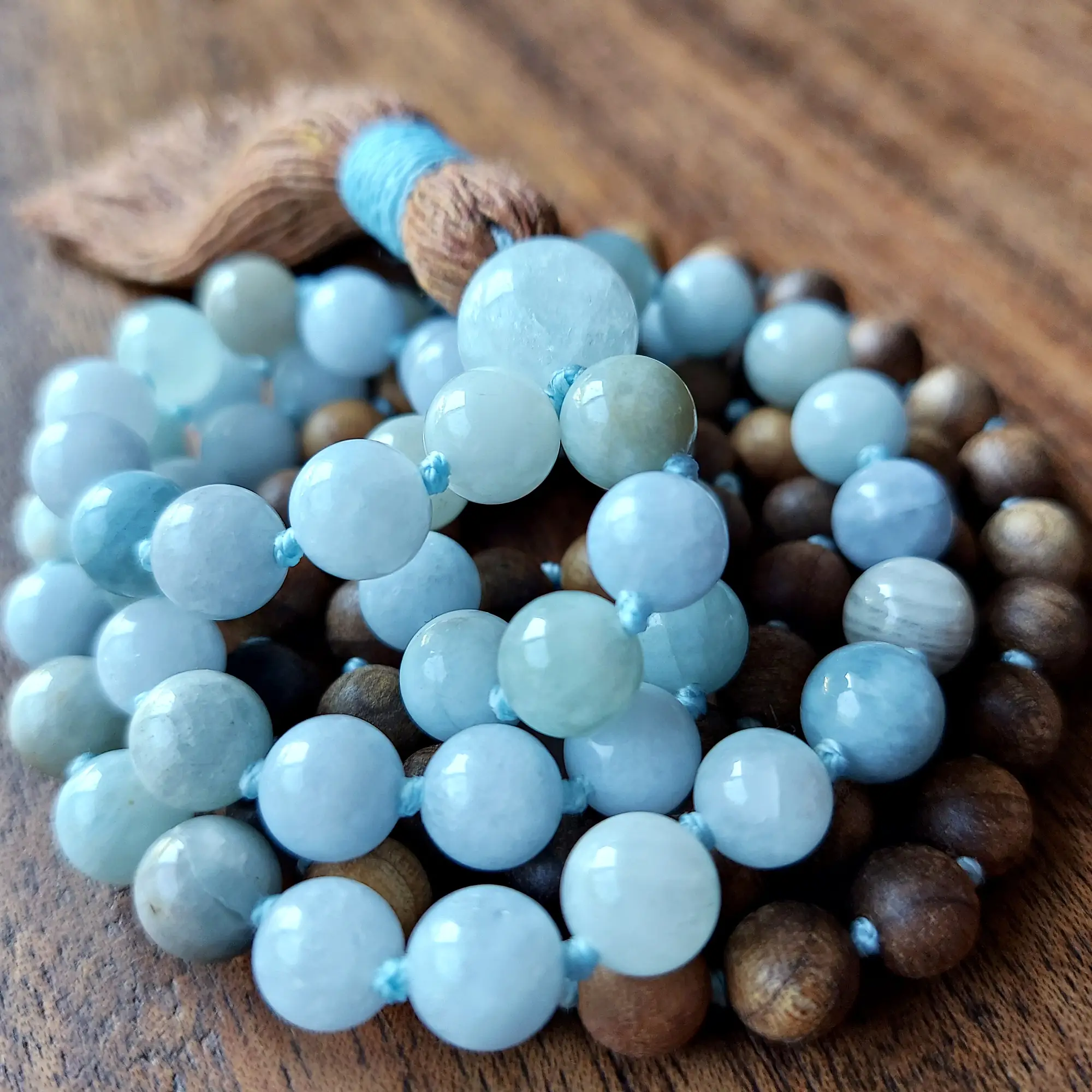 This grounding and ocean-kissed mala necklace features genuine Aquamarine and warm Sandalwood (8mm, raw & opaque, hand-knotted). The palette blends soft sea-glass blues with earthy golden-brown wood ~ sky meeting shore, water meeting earth.