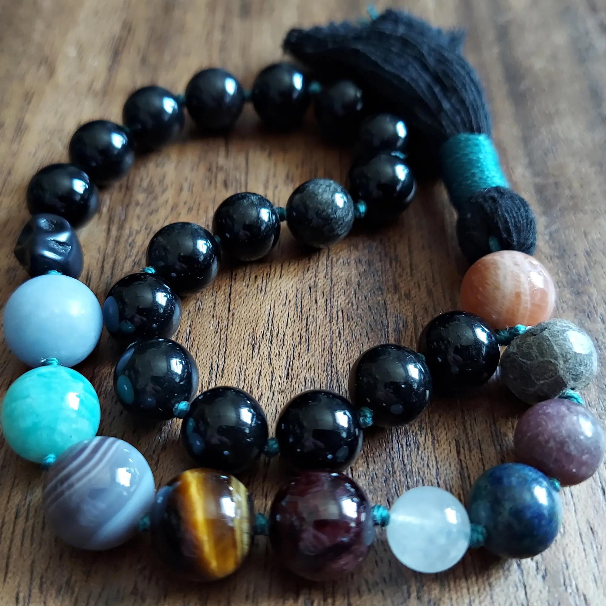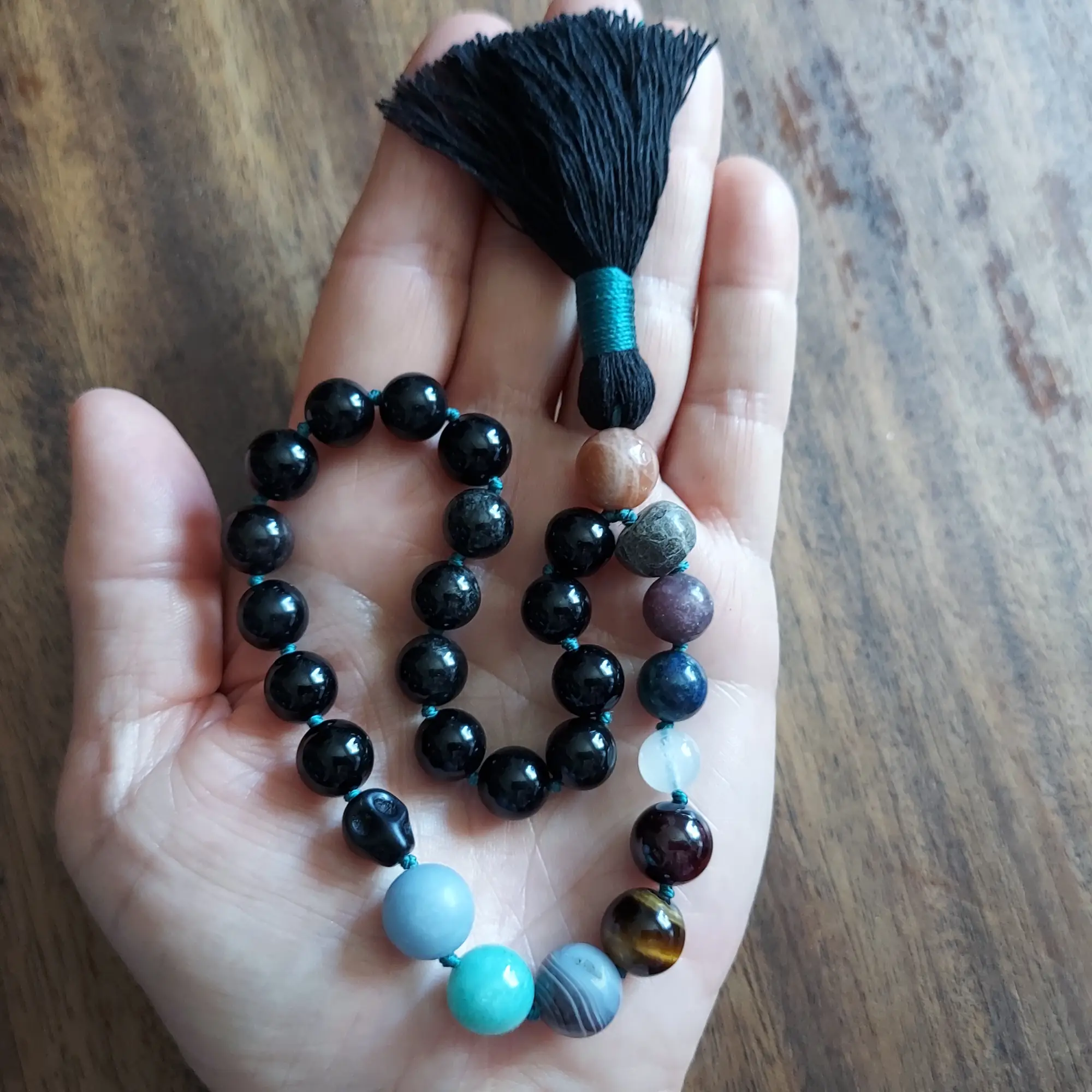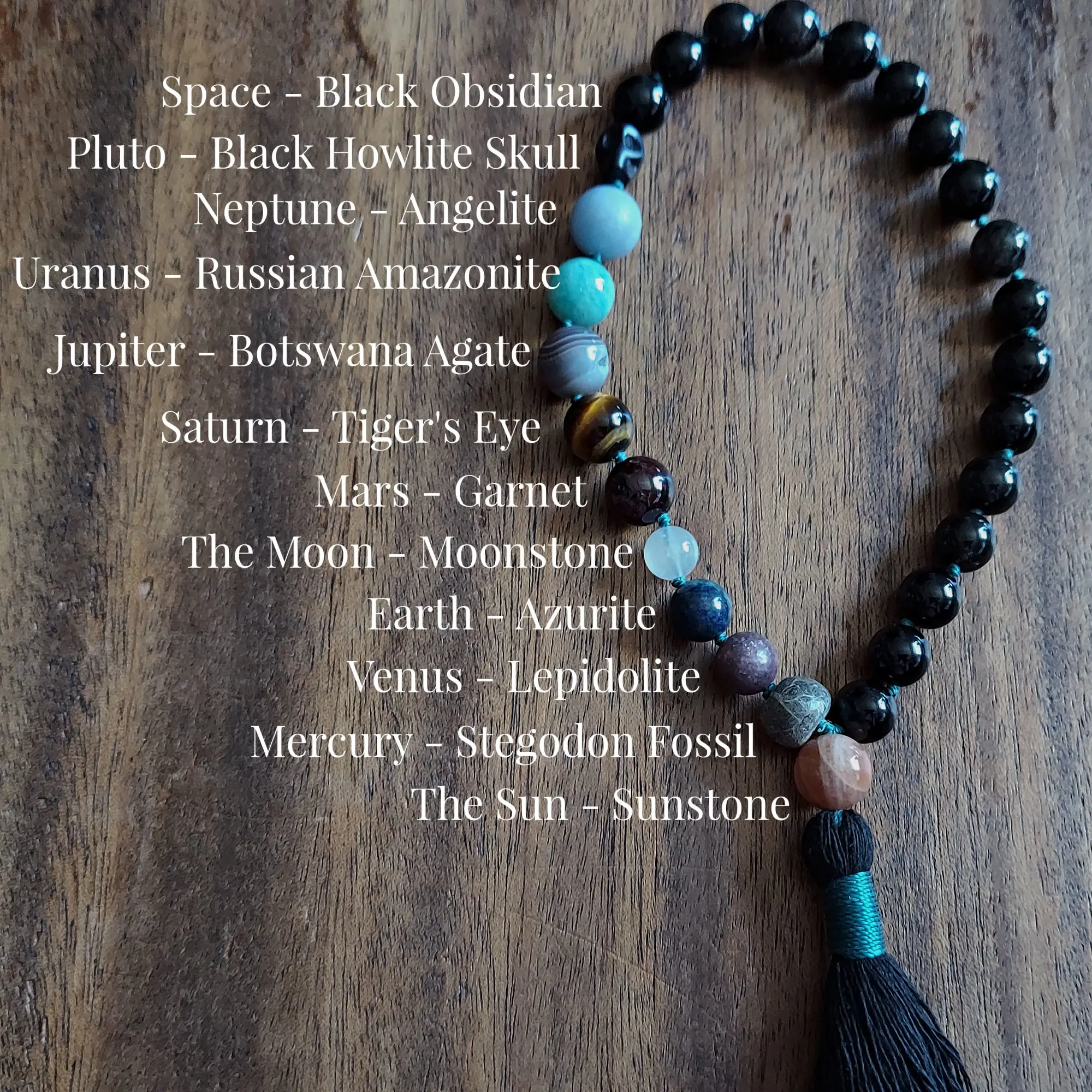 Hold the cosmos in your palm. This one-of-a-kind Solar System Pocket Mala is a miniature galaxy made for your pocket, your altar, or your spiritual travels. A powerful blend of Black Obsidian (10mm) and thoughtfully selected gemstone planets, this 27-bead quarter mala is a prayerful map of your connection to the cosmos.