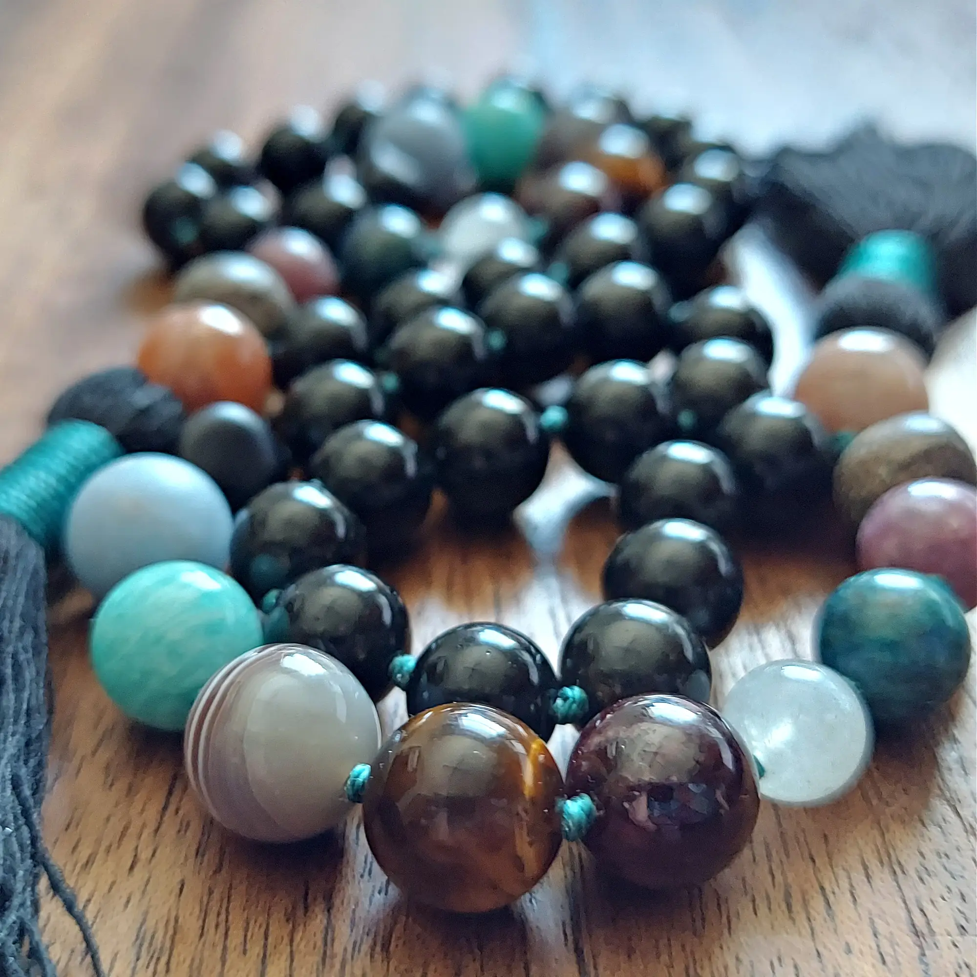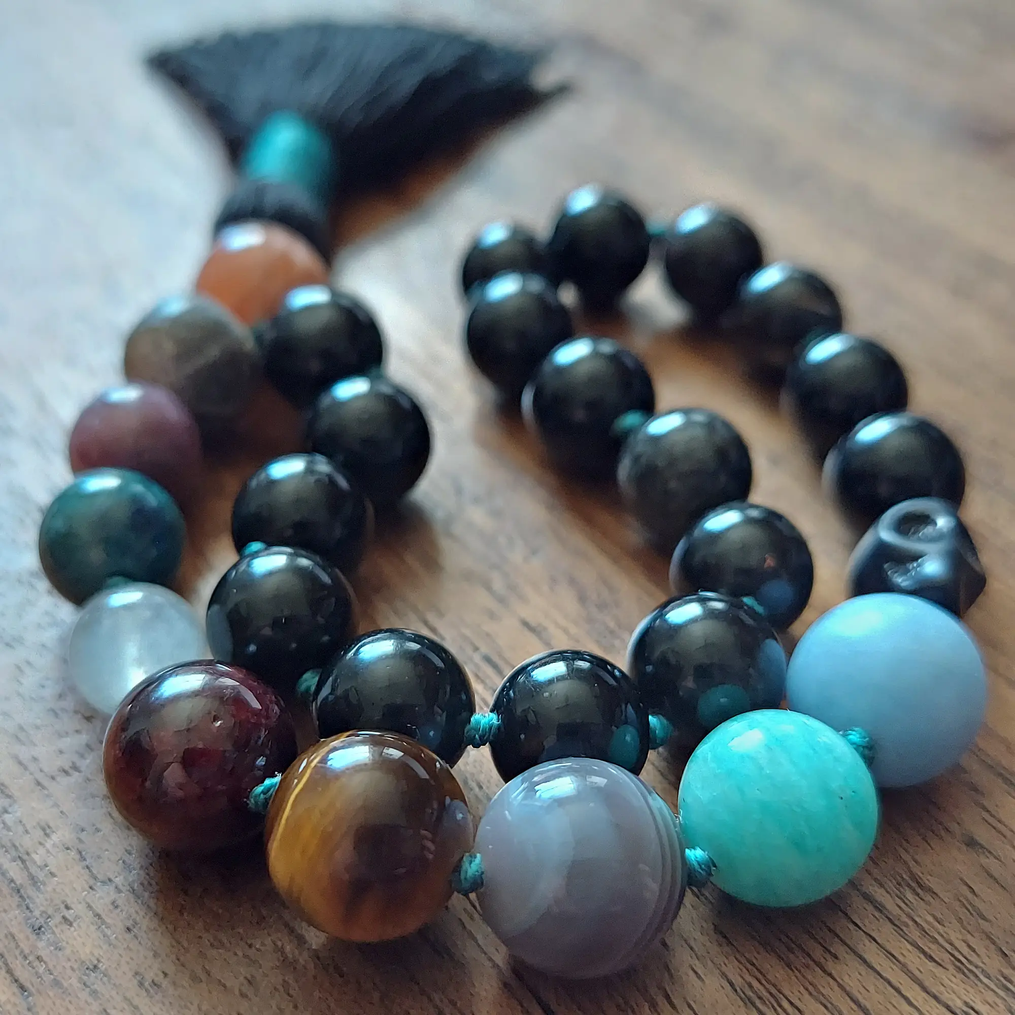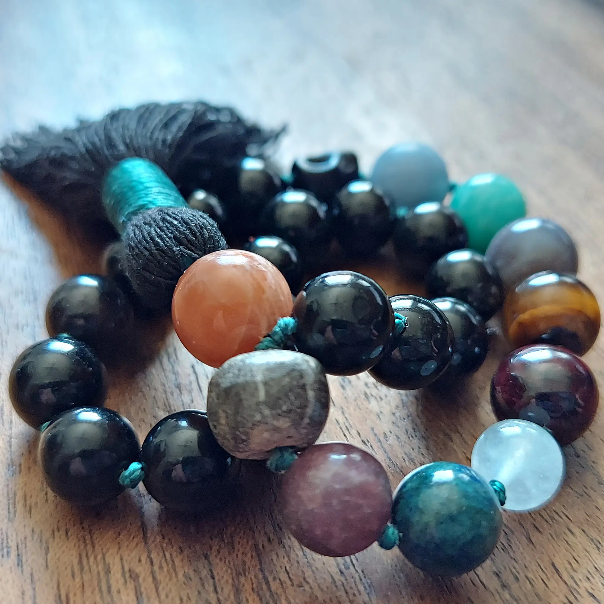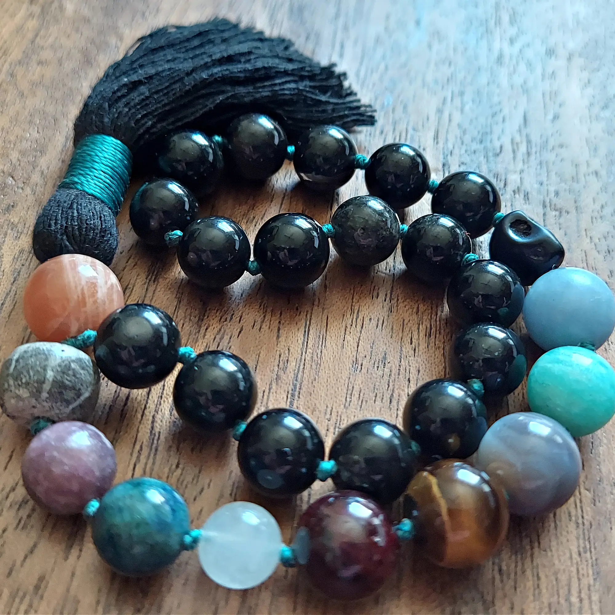 Hold the cosmos in your palm. This one-of-a-kind Solar System Pocket Mala is a miniature galaxy made for your pocket, your altar, or your spiritual travels. A powerful blend of Black Obsidian (10mm) and thoughtfully selected gemstone planets, this 27-bead quarter mala is a prayerful map of your connection to the cosmos.