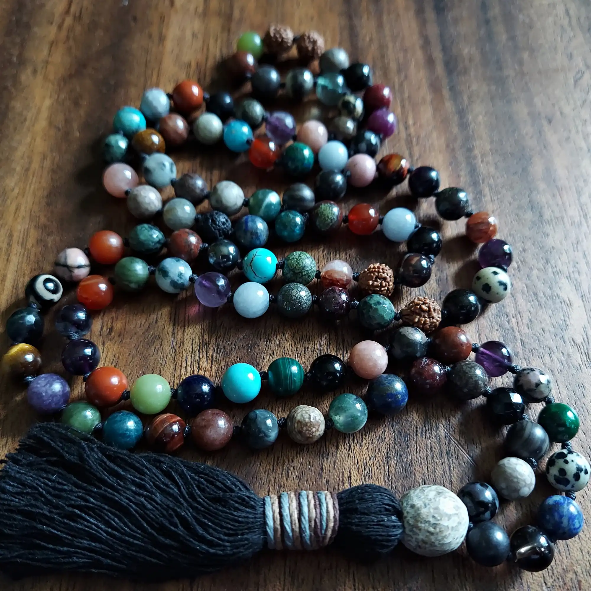 This deep and rich multi-gemstone mala includes a Stegodon Fossil Guru Bead & resonates with all chakras of the body while activating the lower chakras with darker gemstones. The artistry of these beads is reflected in a sublime combination of over 54 different kinds of crystals and gemstones arranged in a one-of-a-kind design that I create especially for you! You will get lost in the mesmerizing diversity of colors, textures, & effects.