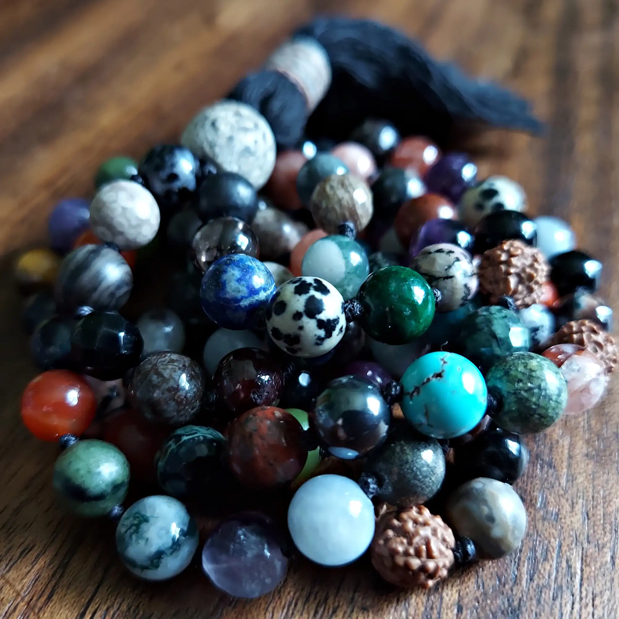 Stegodon Bone Fossil Guru Bead, Shungite, Hematite, Pyrite, Lepidolite, Garnet, Tiger’s Eye, Apatite, Amazonite, Rudraksha Seeds, Sodalite, Lapis Lazuli, Turquoise, Amethyst, Labradorite, Ocean Fossil, Various Obsidians, Mixed Agates, Assorted Quartz, Varied Jades, and Diverse Jaspers.