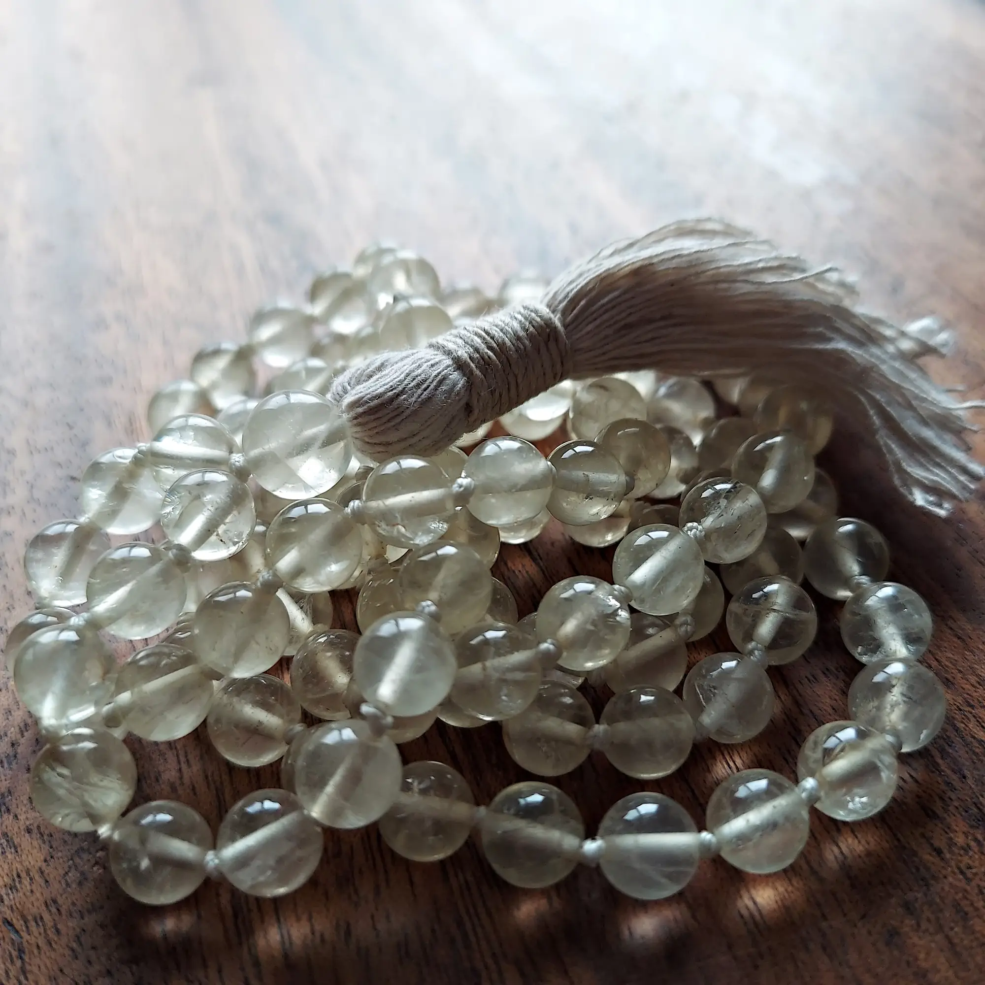 This stunning Bright Light Mala ✨🍋 made with Lemon Quartz beads (8mm, high-quality, hand-knotted) and a fluffy cotton tassel, supports your Solar Plexus Chakra to increase vitality and optimism, and to brighten your day!