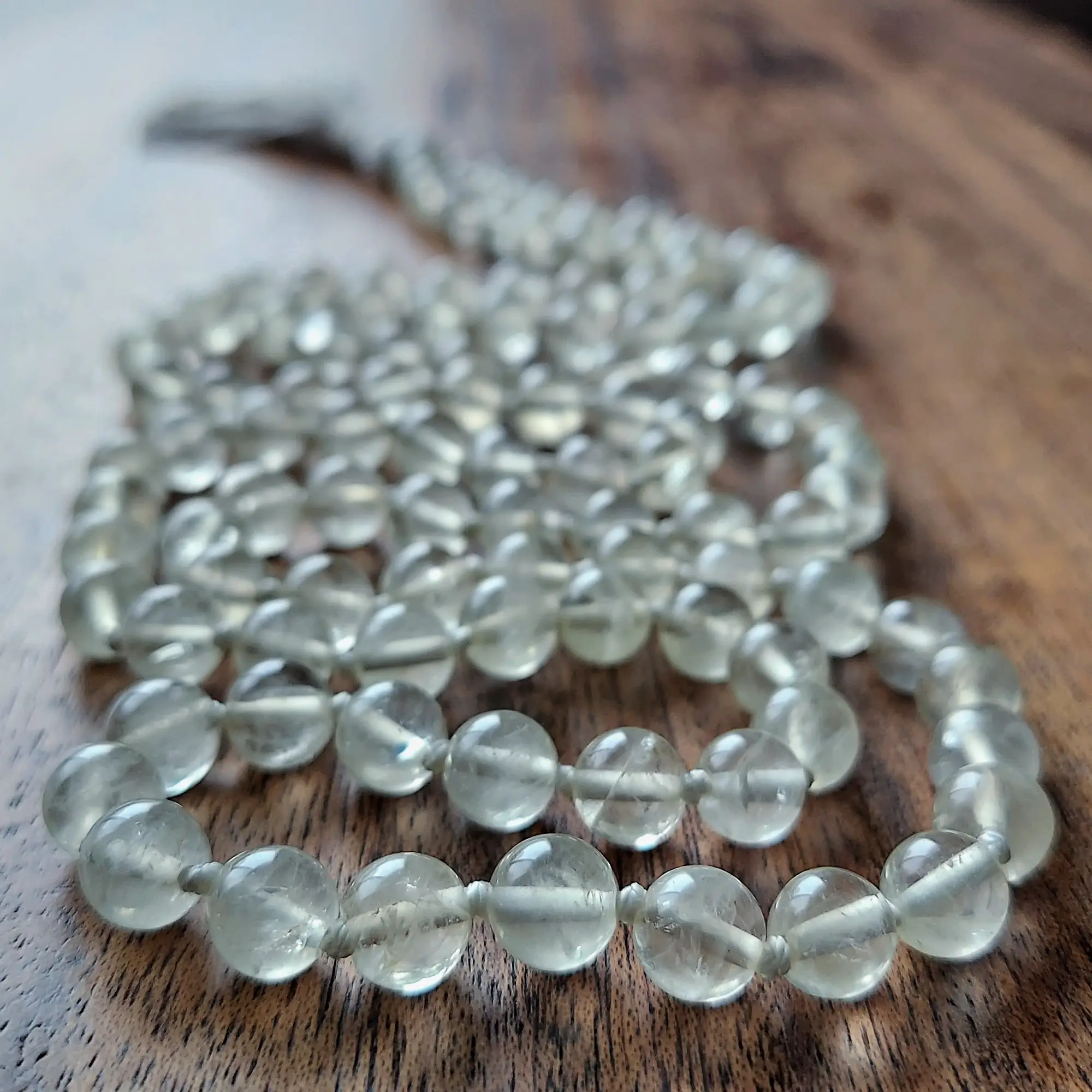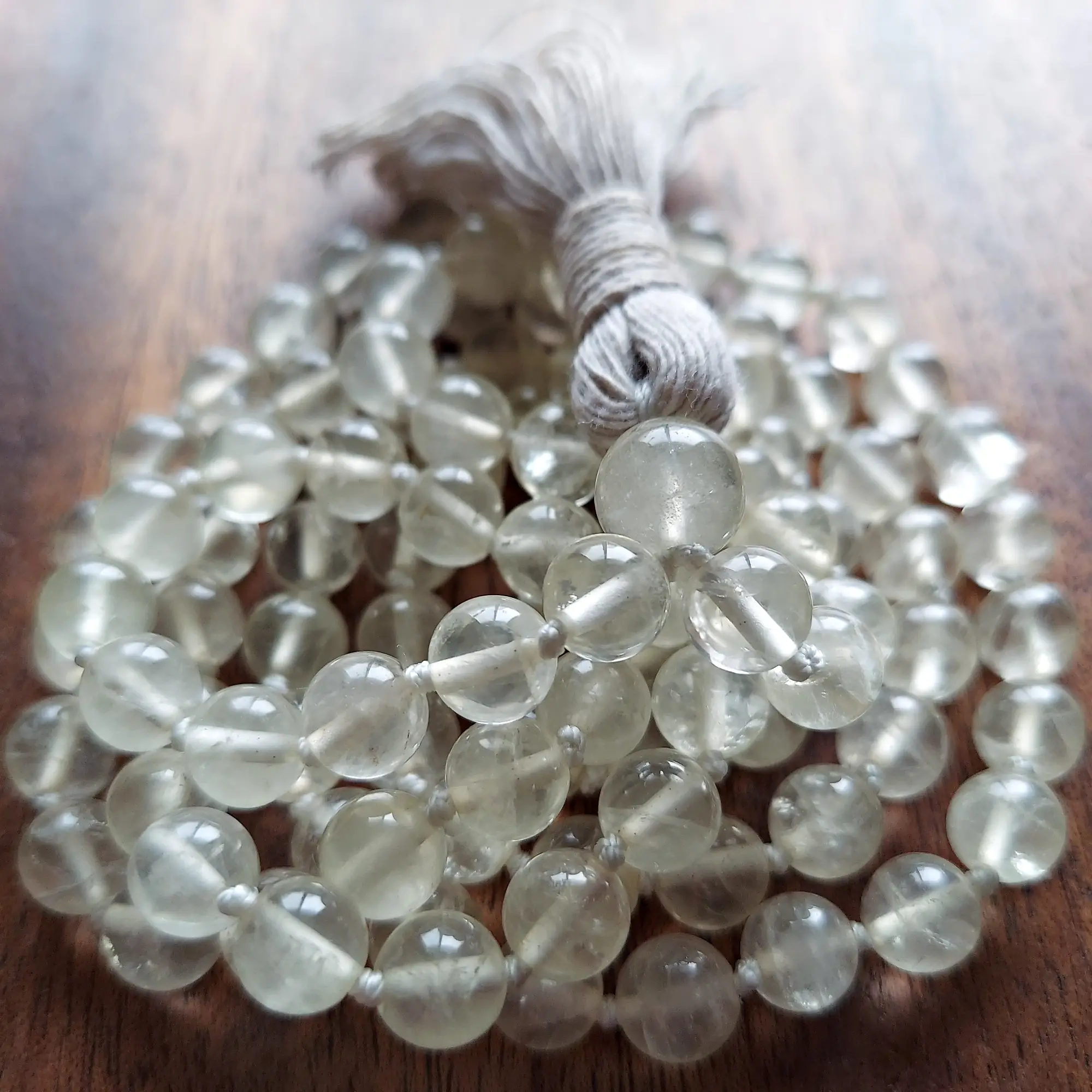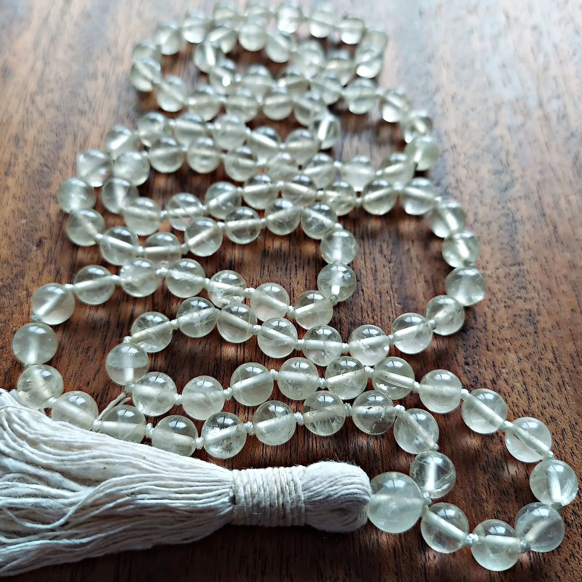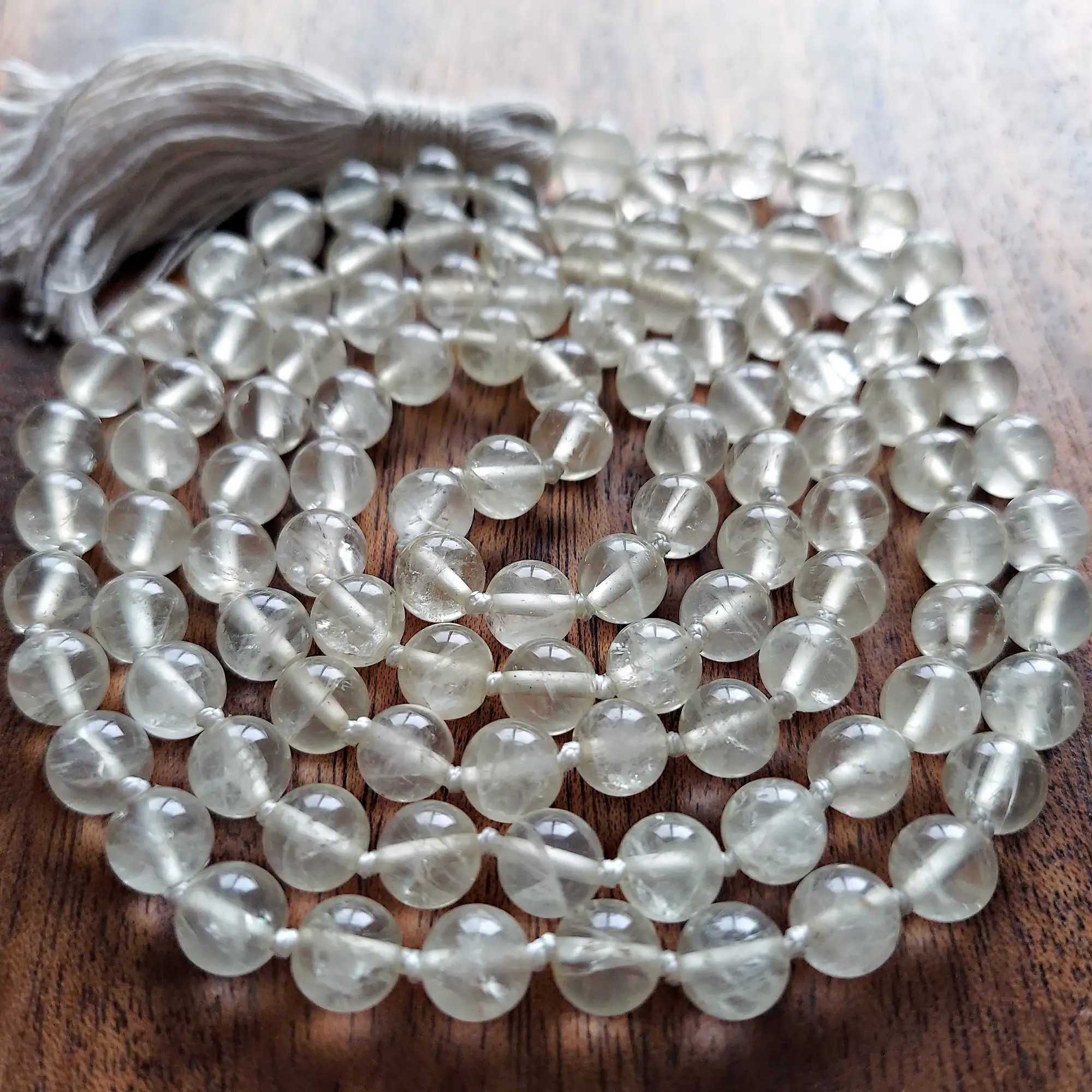Your mala beads will include a cotton tassel and nylon cord for knots, which, unlike silk, does not rot, stretch, or fray. Cotton & nylon are far superior for something we handle and wear daily.