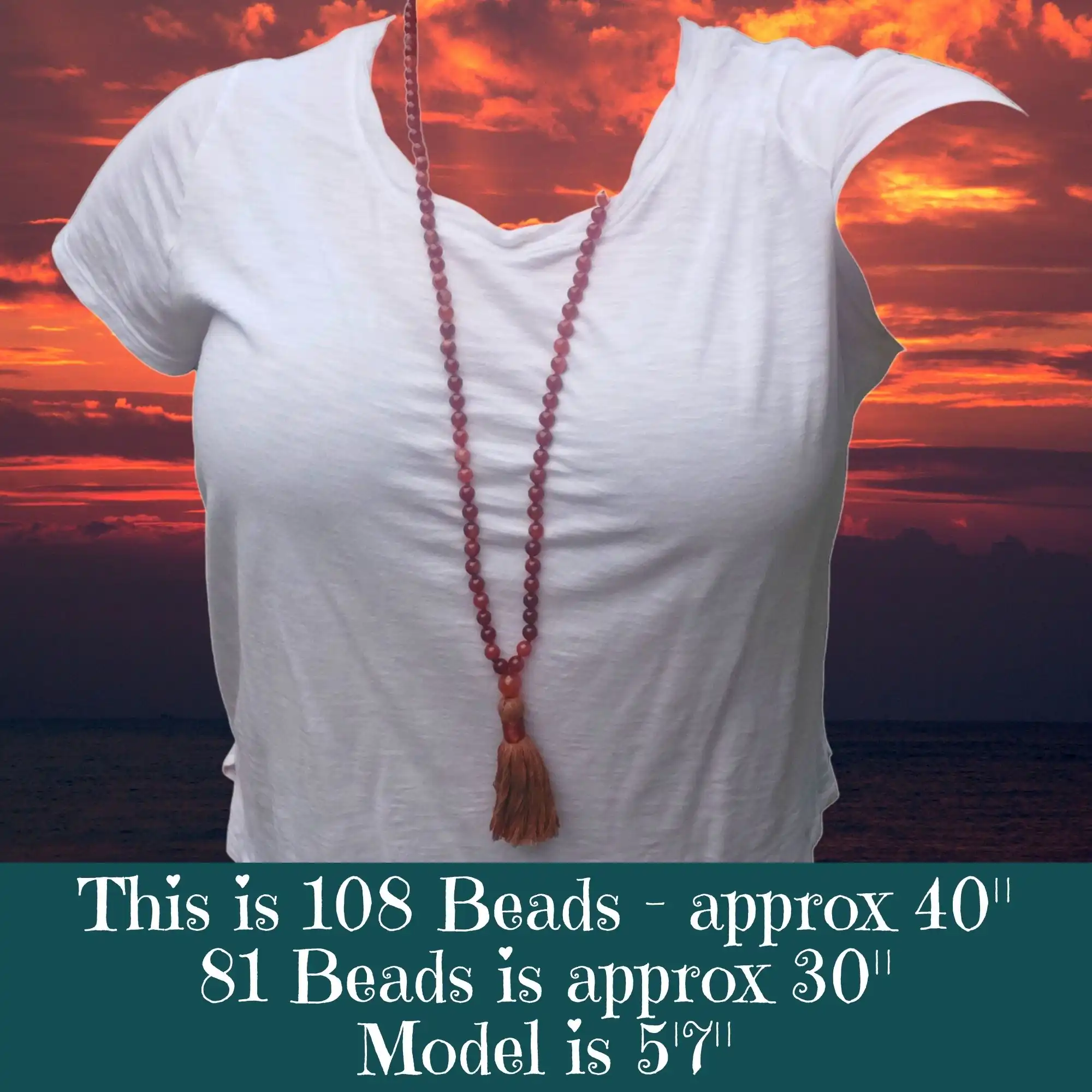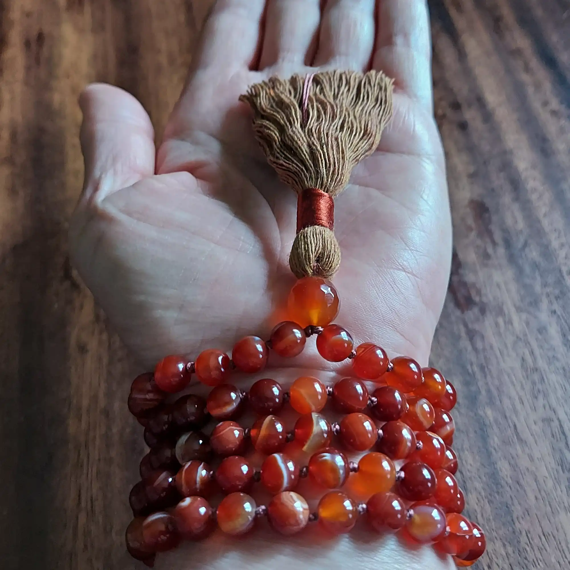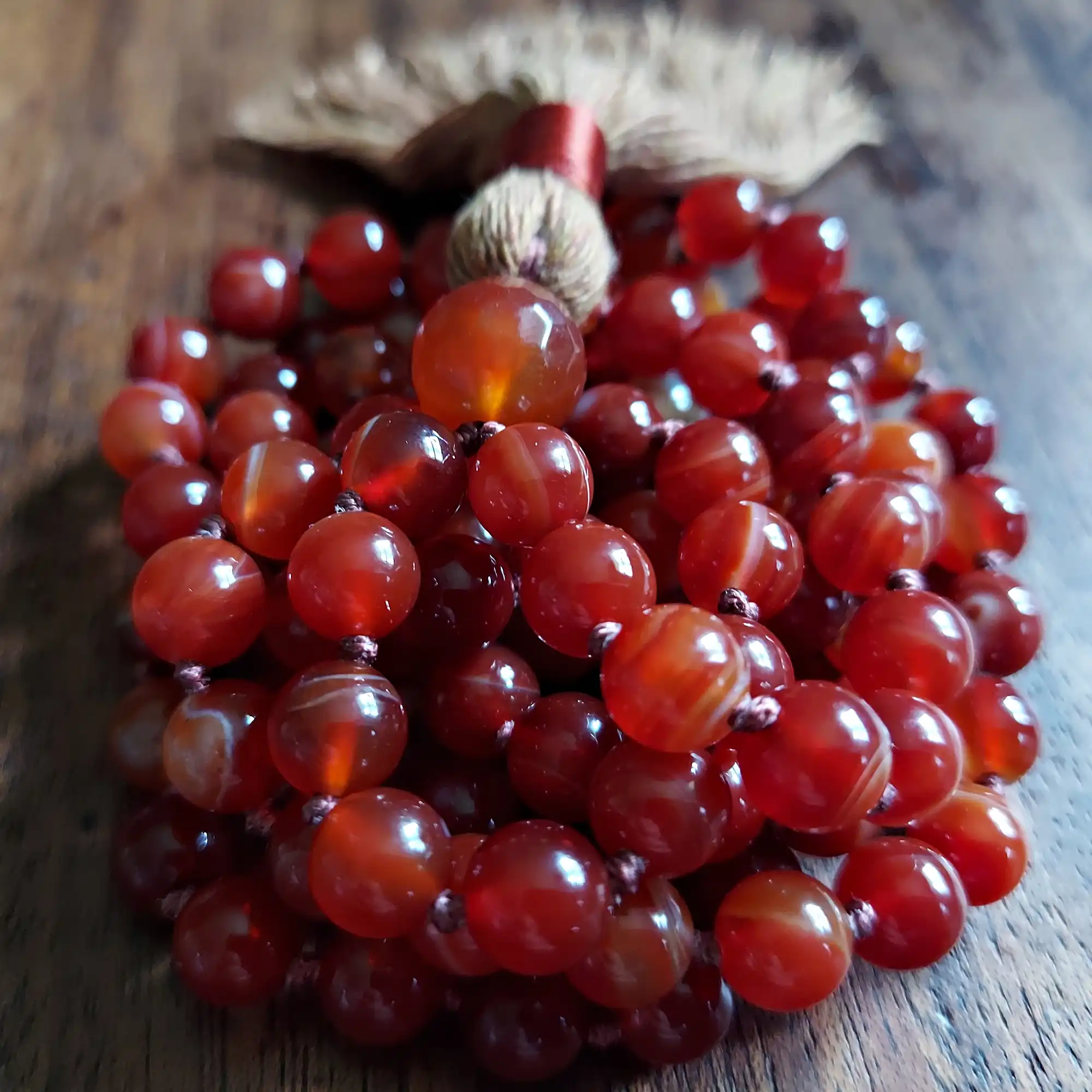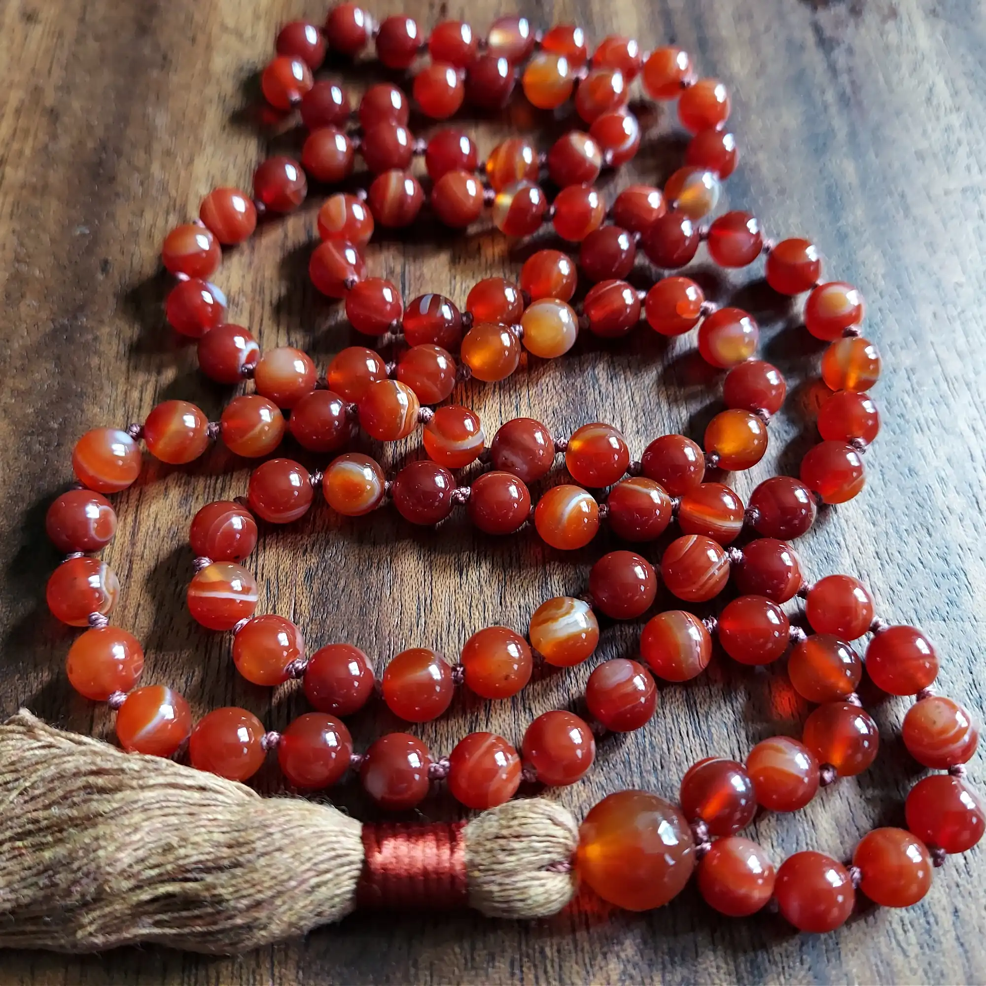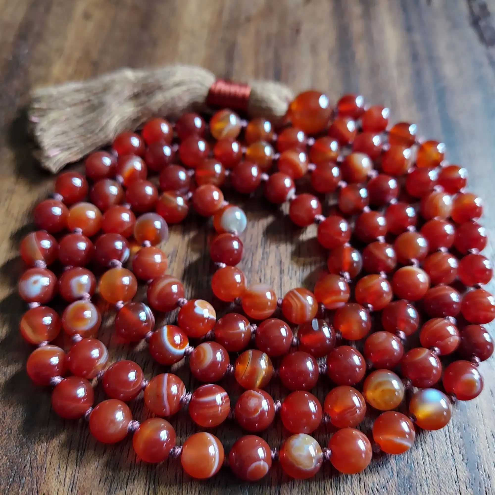 Your mala beads will include a cotton tassel and nylon cord for knots, which, unlike silk, does not rot, stretch, or fray. Cotton & nylon are far superior for something we handle and wear daily.