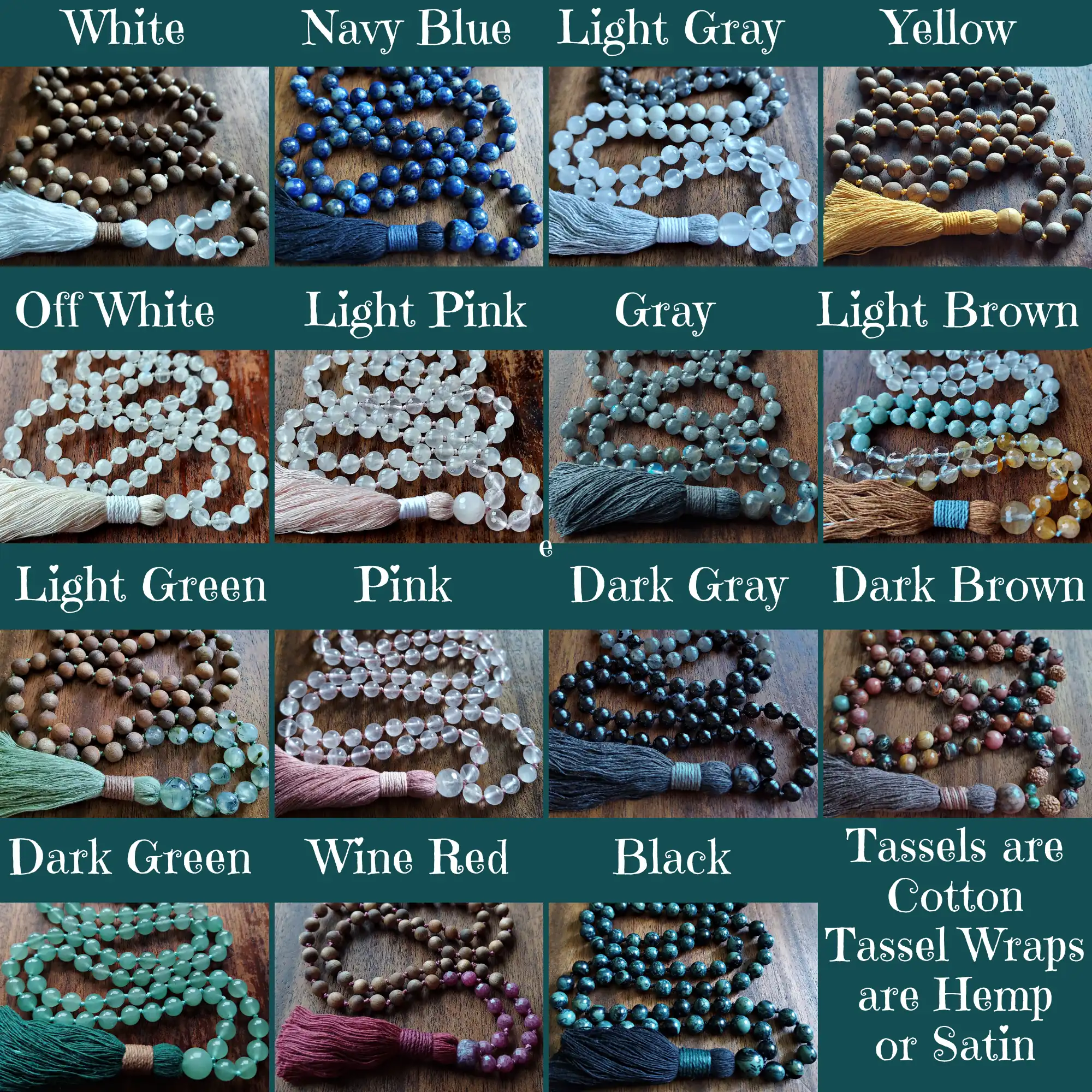 Your mala beads will include a cotton tassel and nylon cord for knots, which, unlike silk, does not rot, stretch, or fray. Cotton & nylon are far superior for something we handle and wear daily.