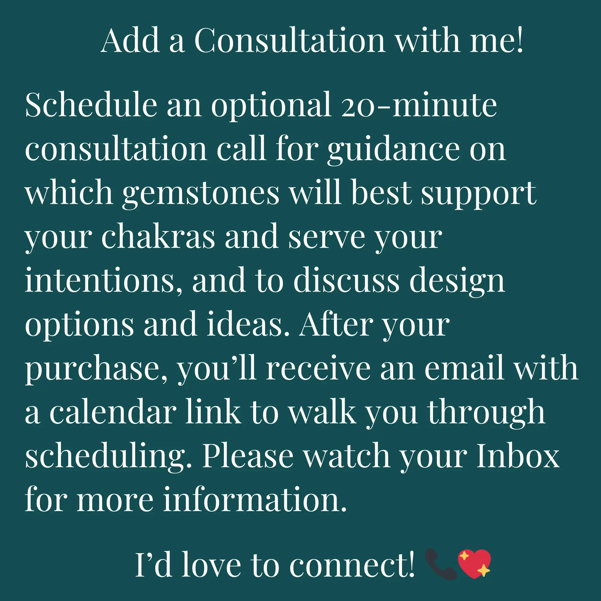 Add a 20-minute video consultation to talk through your vision, choose stones, or receive intuitive support. (Held via Zoom or Google Meet. Just note your preference in Order Notes at the bottom of the Checkout page.)