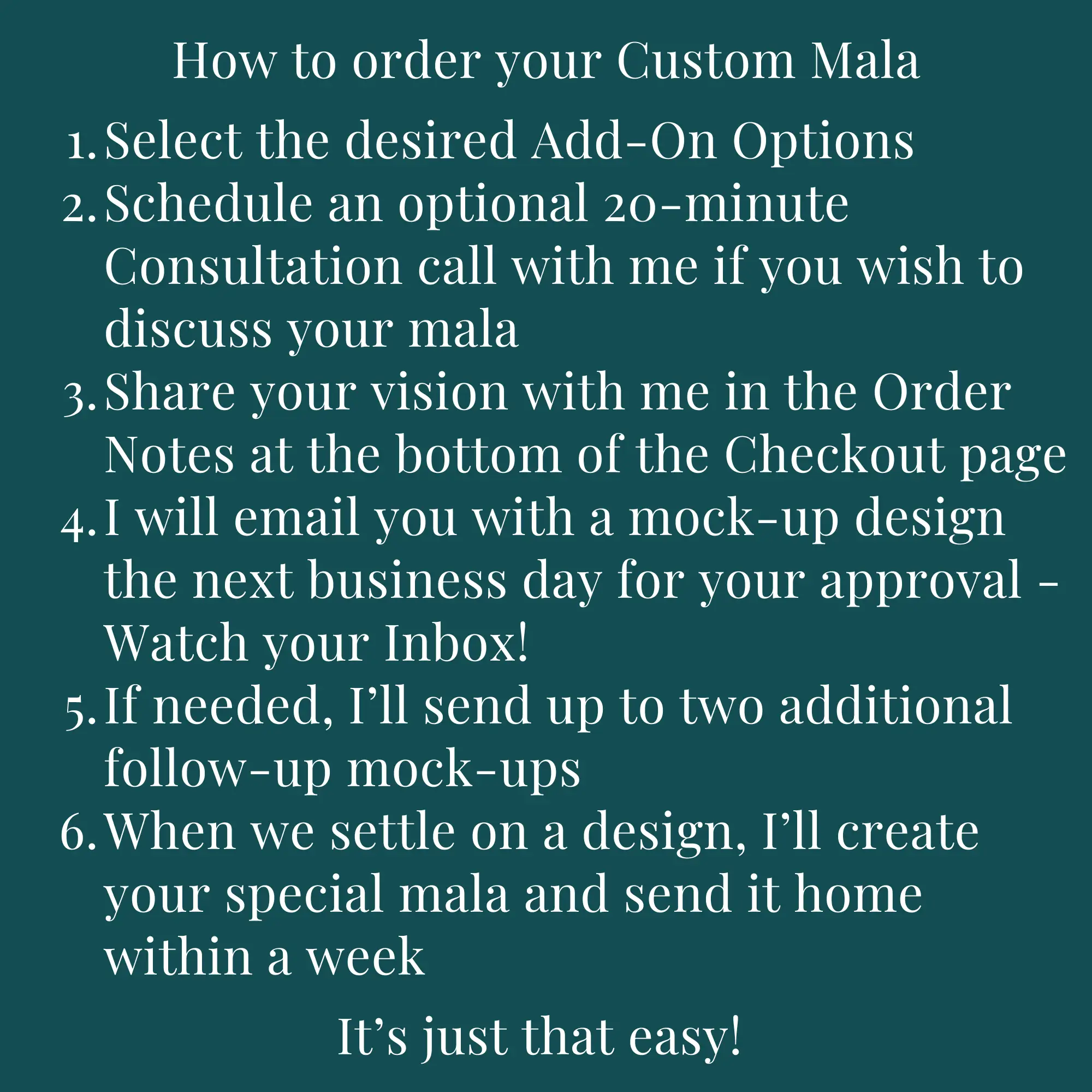 Your all-inclusive mala experience includes a fun and gift-worthy presentation with everything needed for Mala Anointing, Dedication, Use, & Care.