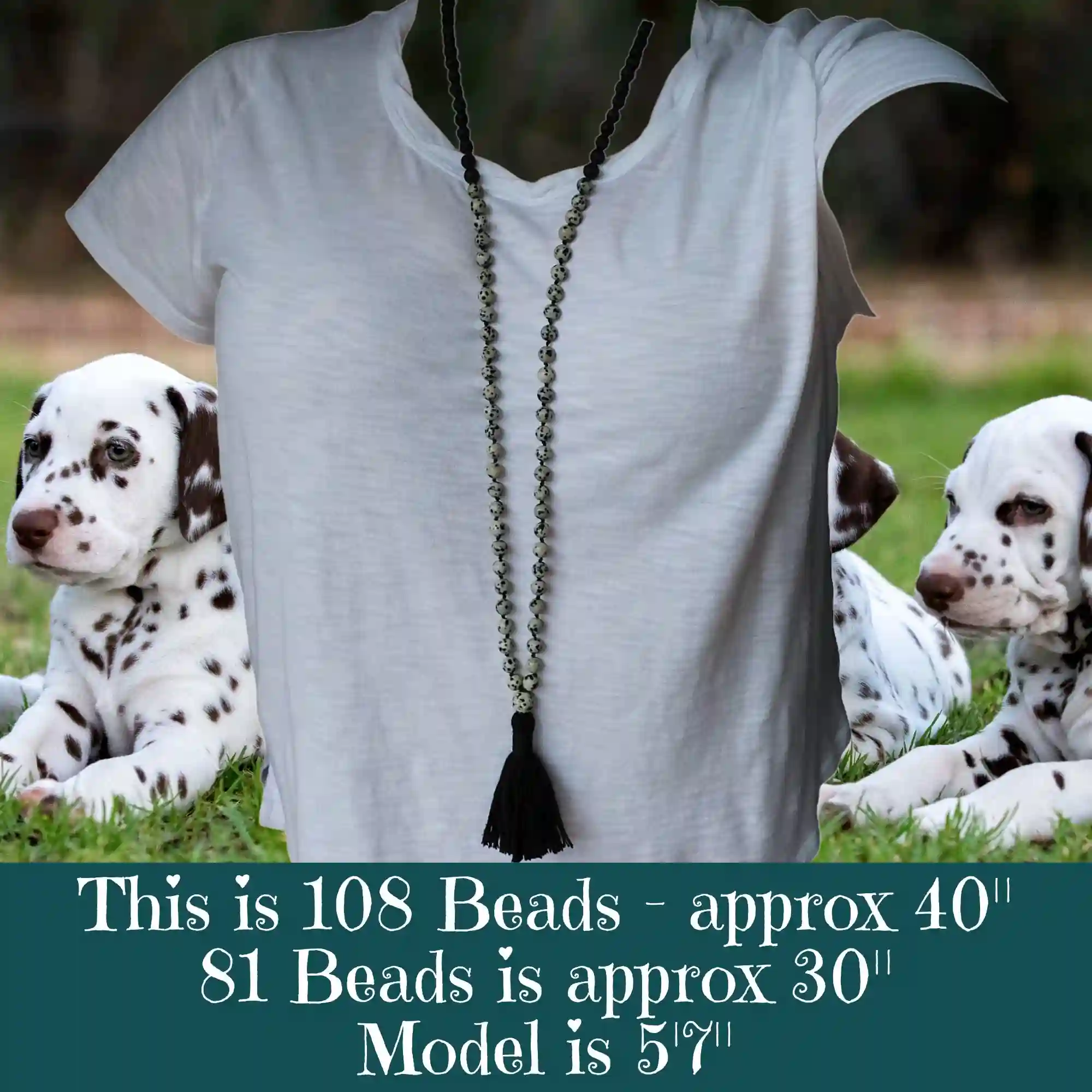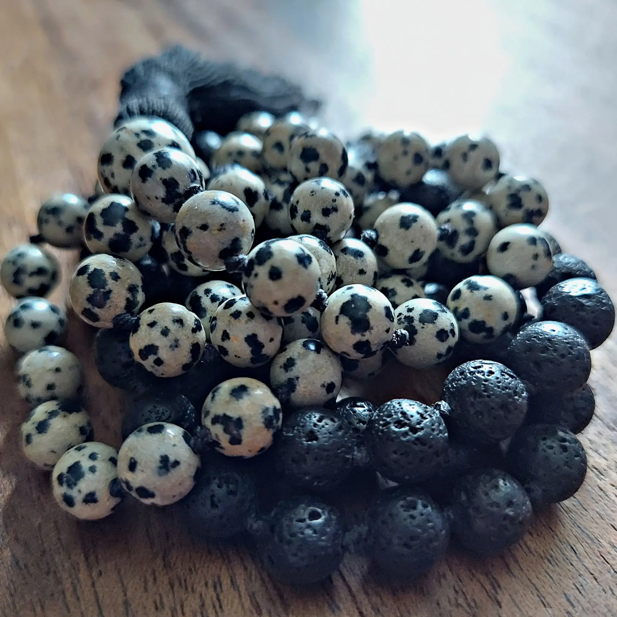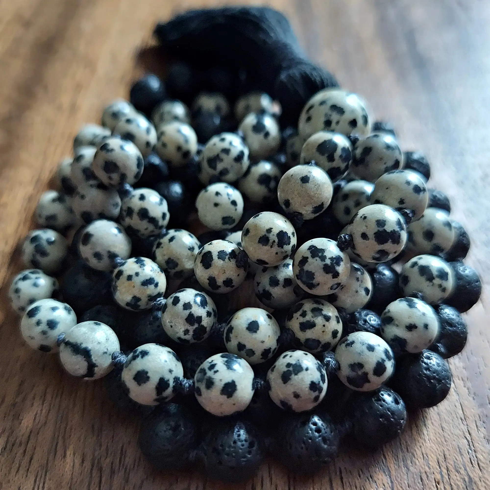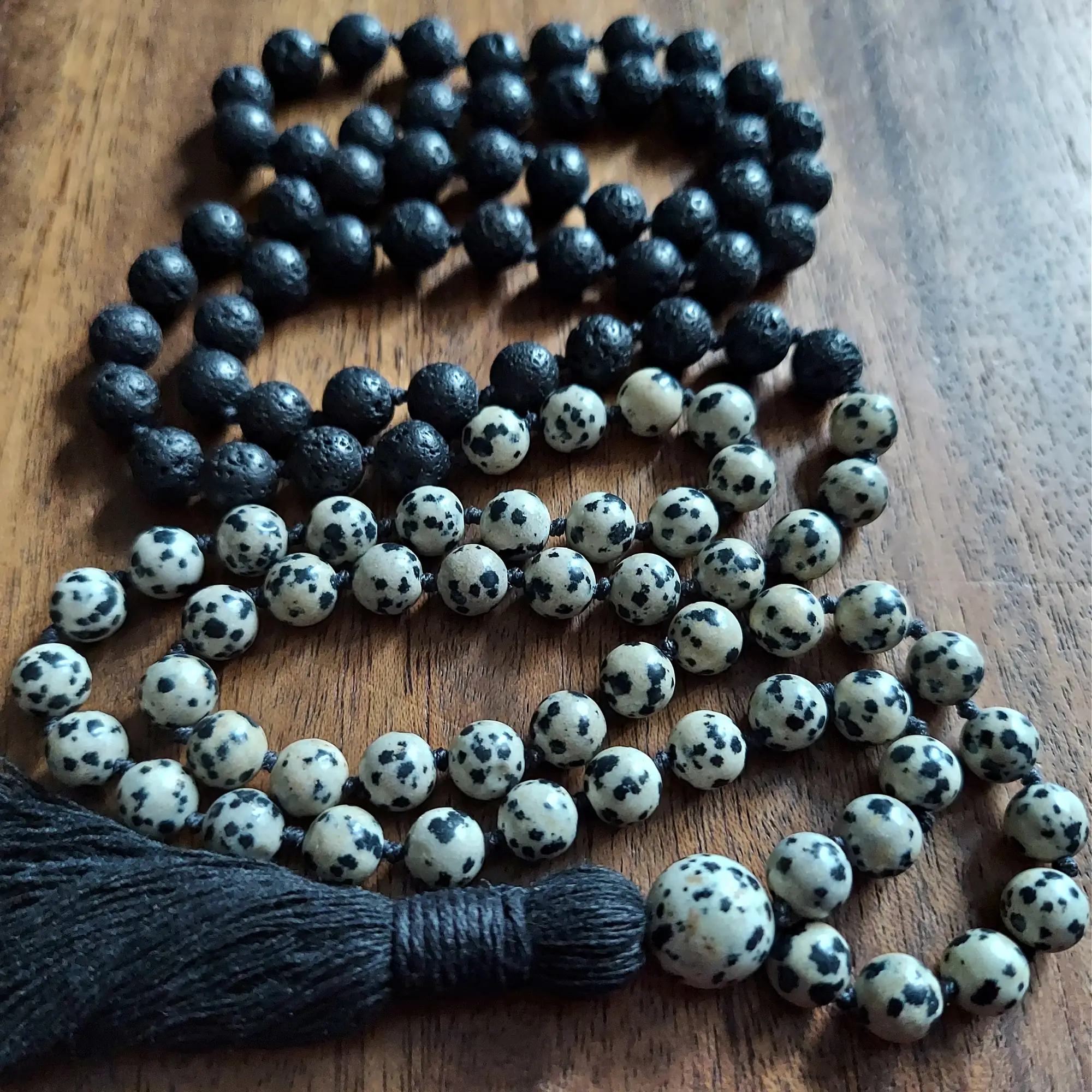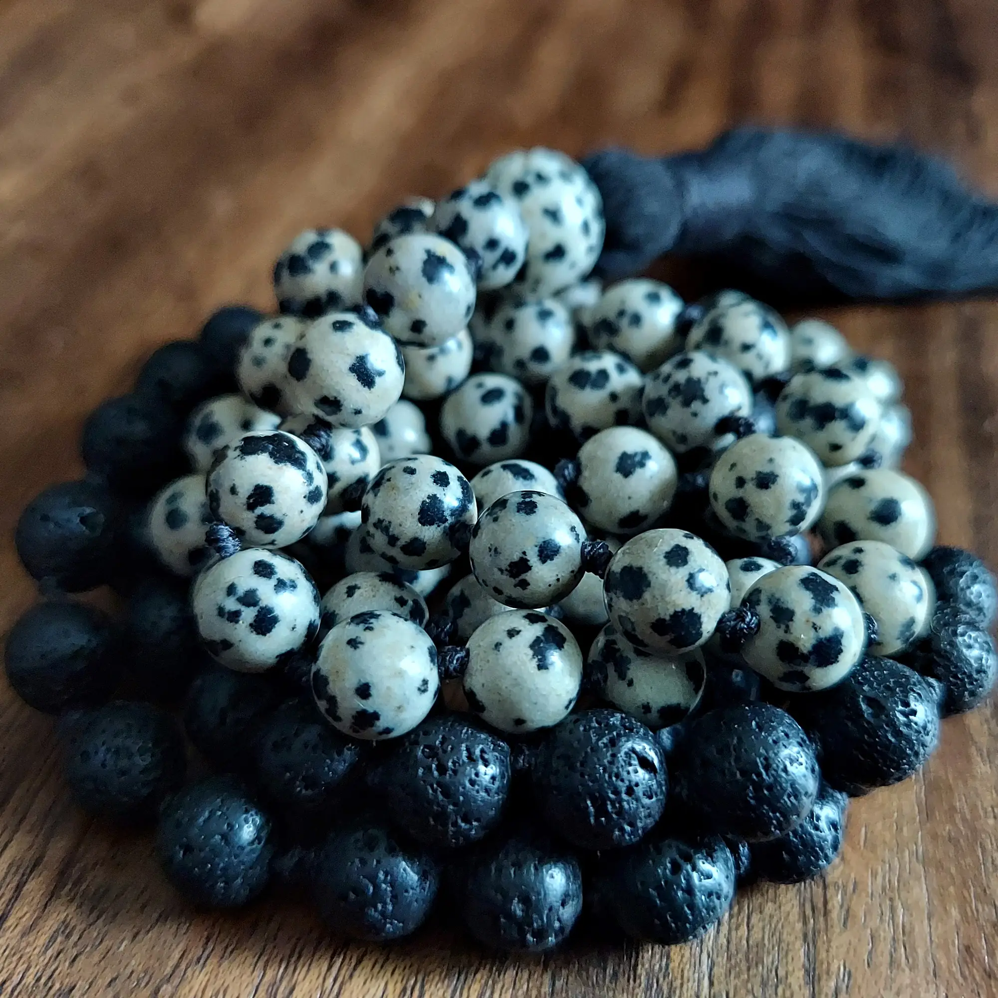 Find balance and inner strength with this gorgeous Dalmatian Jasper & Lava Stone Mala Necklace. This earthy, grounding mala is perfect for anyone seeking peace of mind and lightness of spirit.
