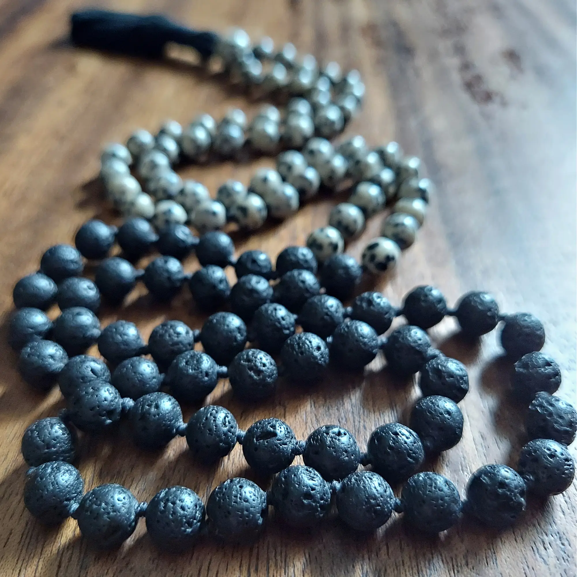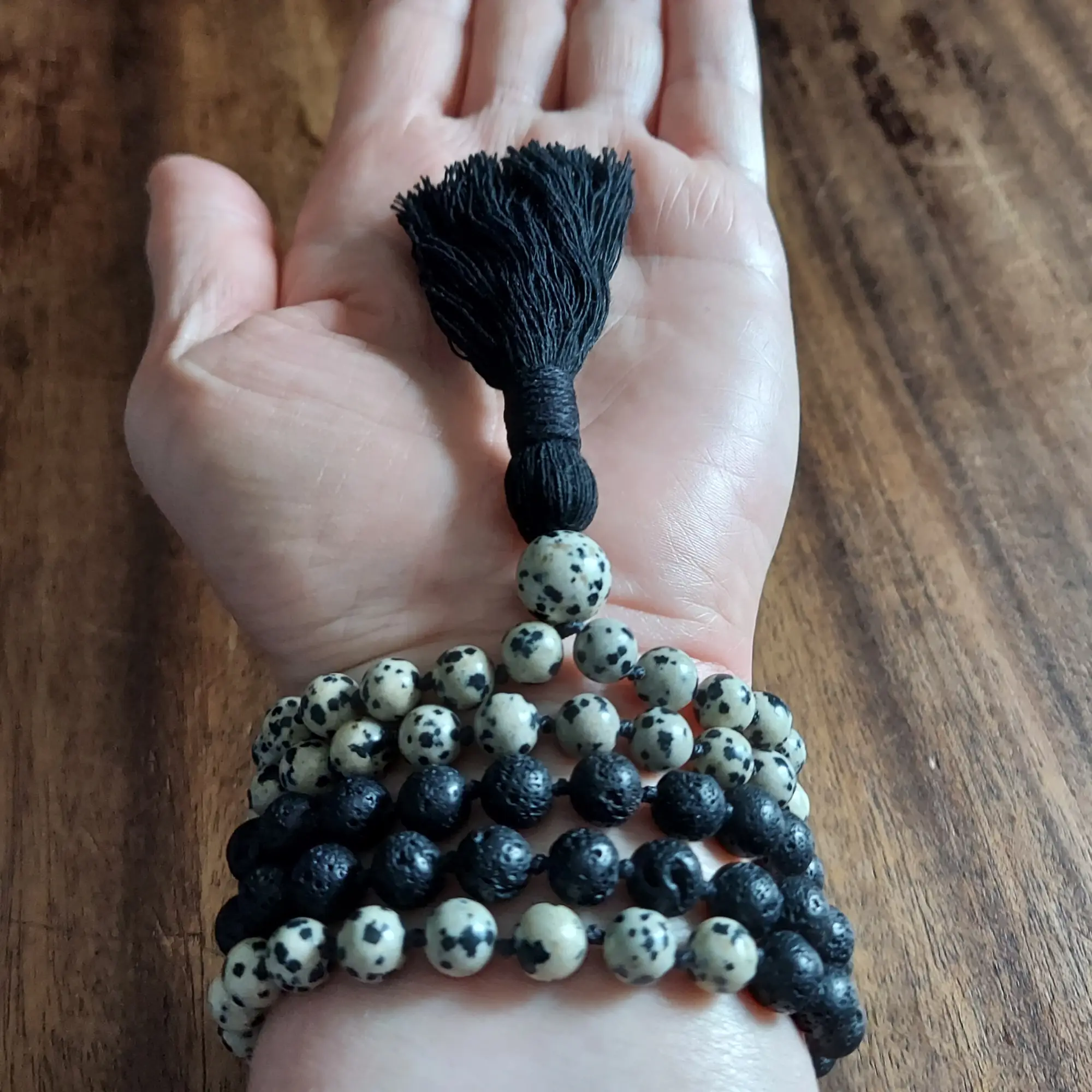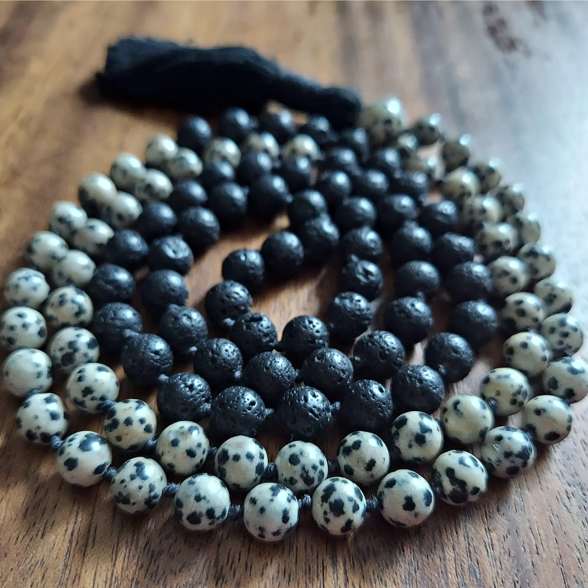 This Dalmatian Jasper & Lava Stone Mala Necklace is perfect for daily wear, meditation, or a thoughtful gift for anyone looking to find balance and embrace their inner strength.