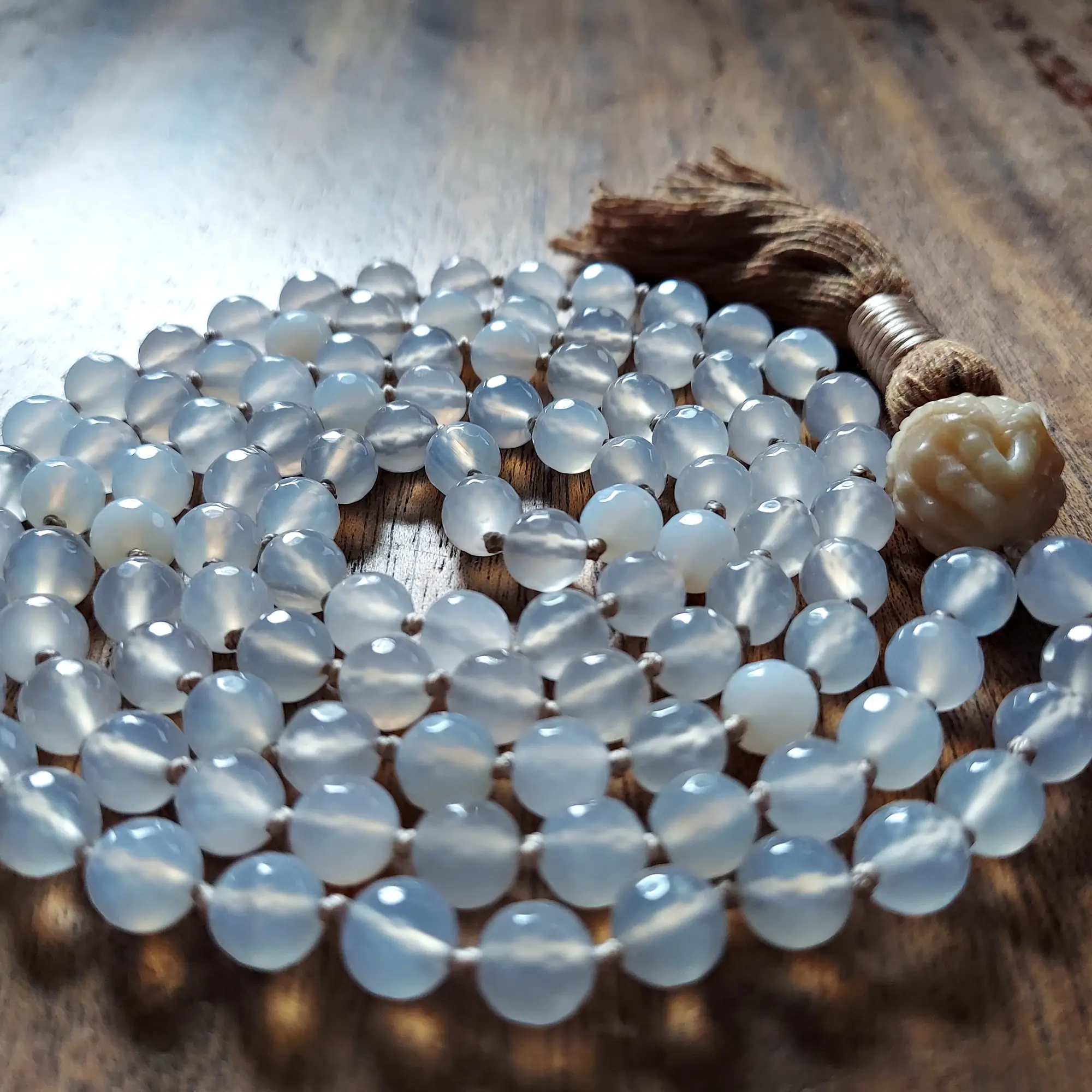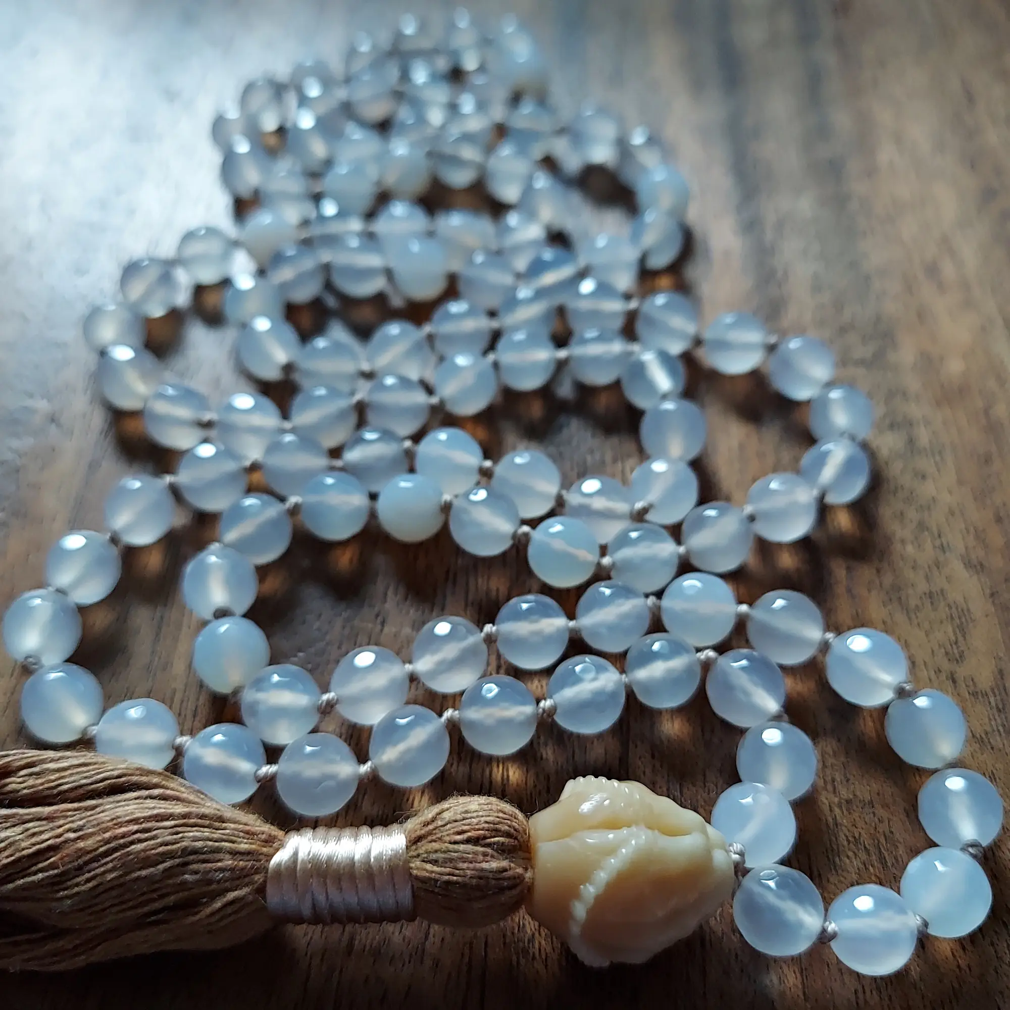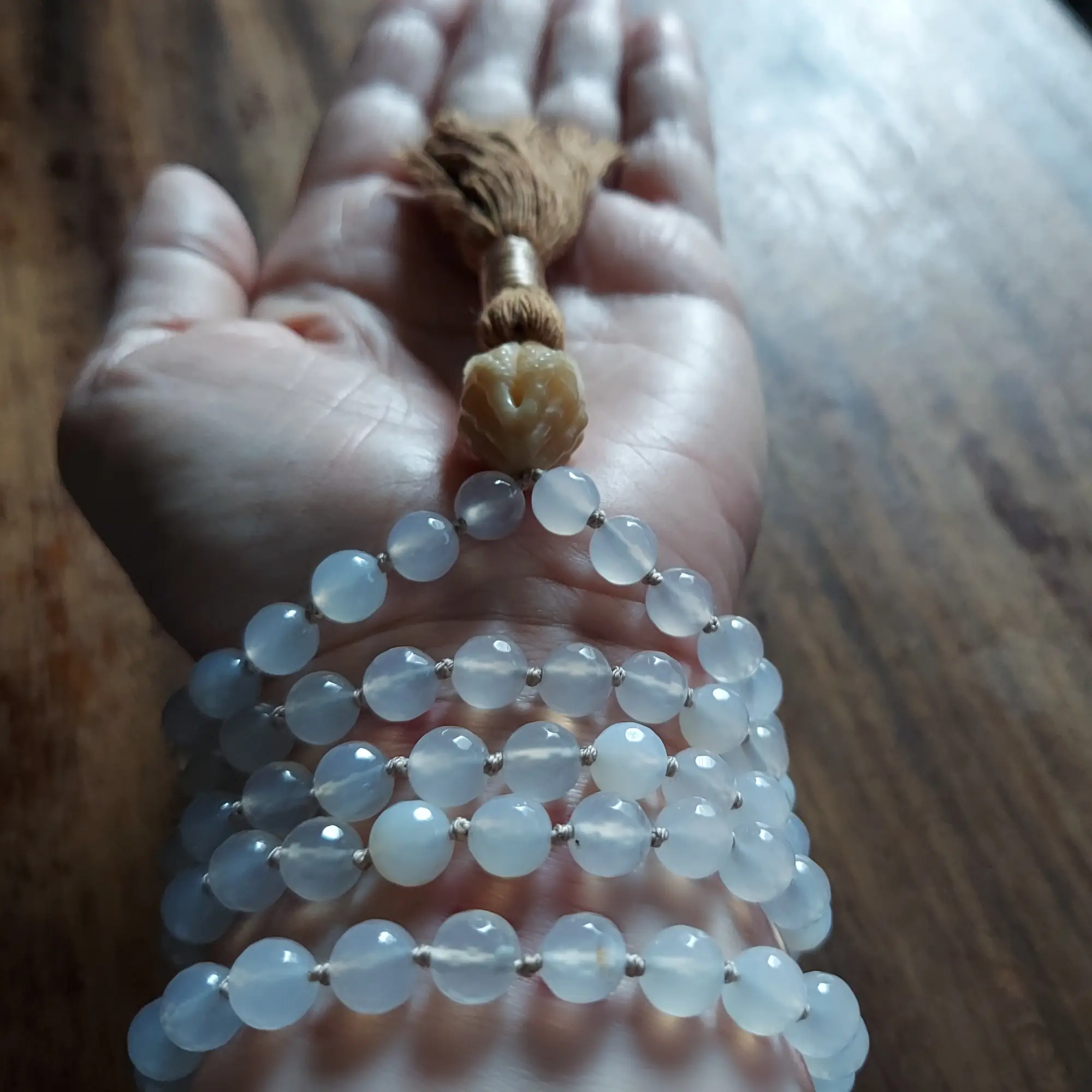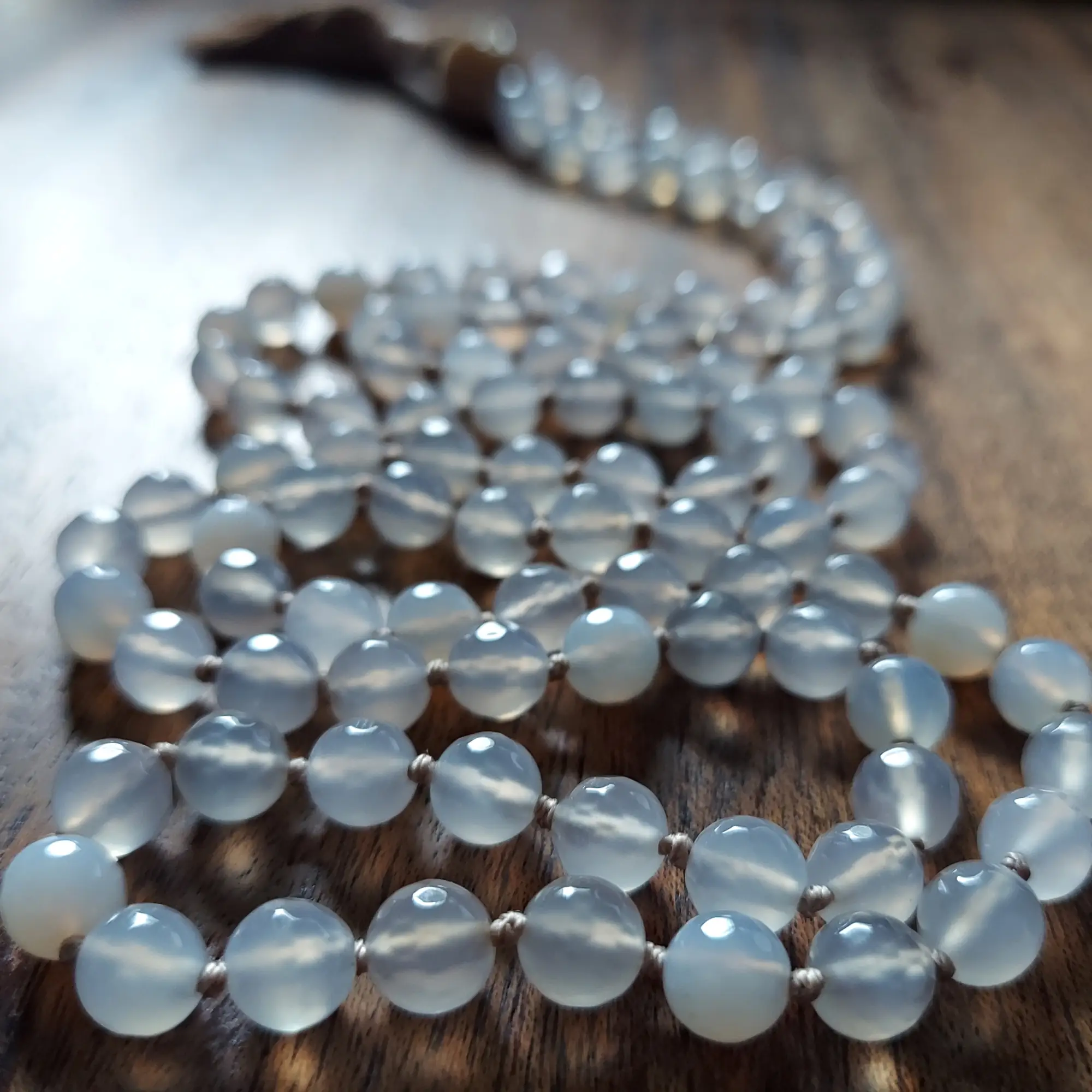Your mala beads will include a cotton tassel and nylon cord for knots, which, unlike silk, does not rot, stretch, or fray. Cotton & nylon are far superior for something we handle and wear daily.