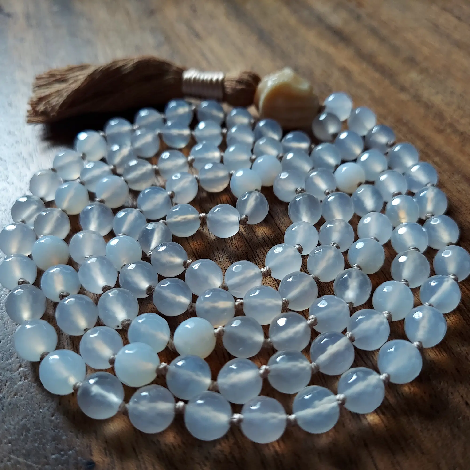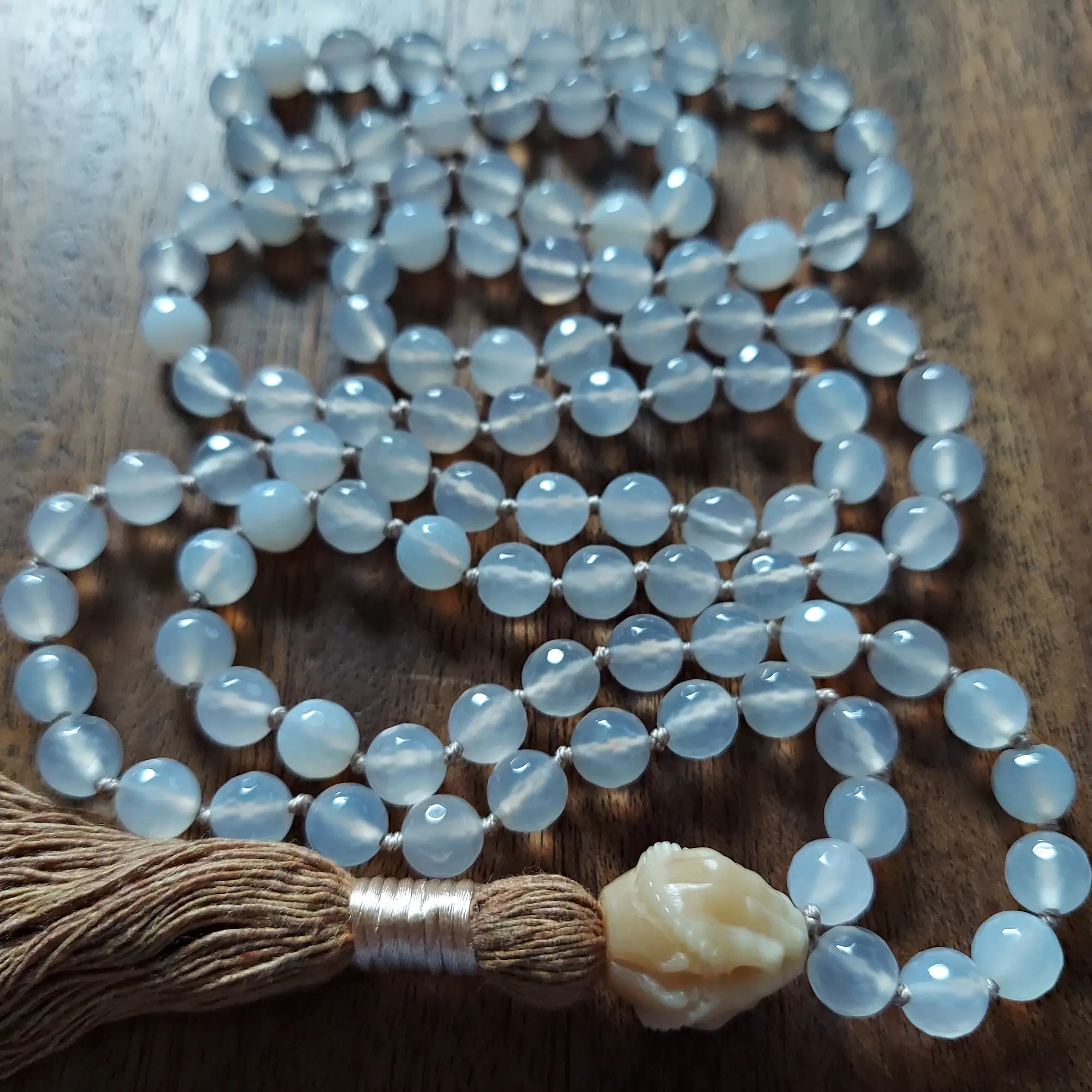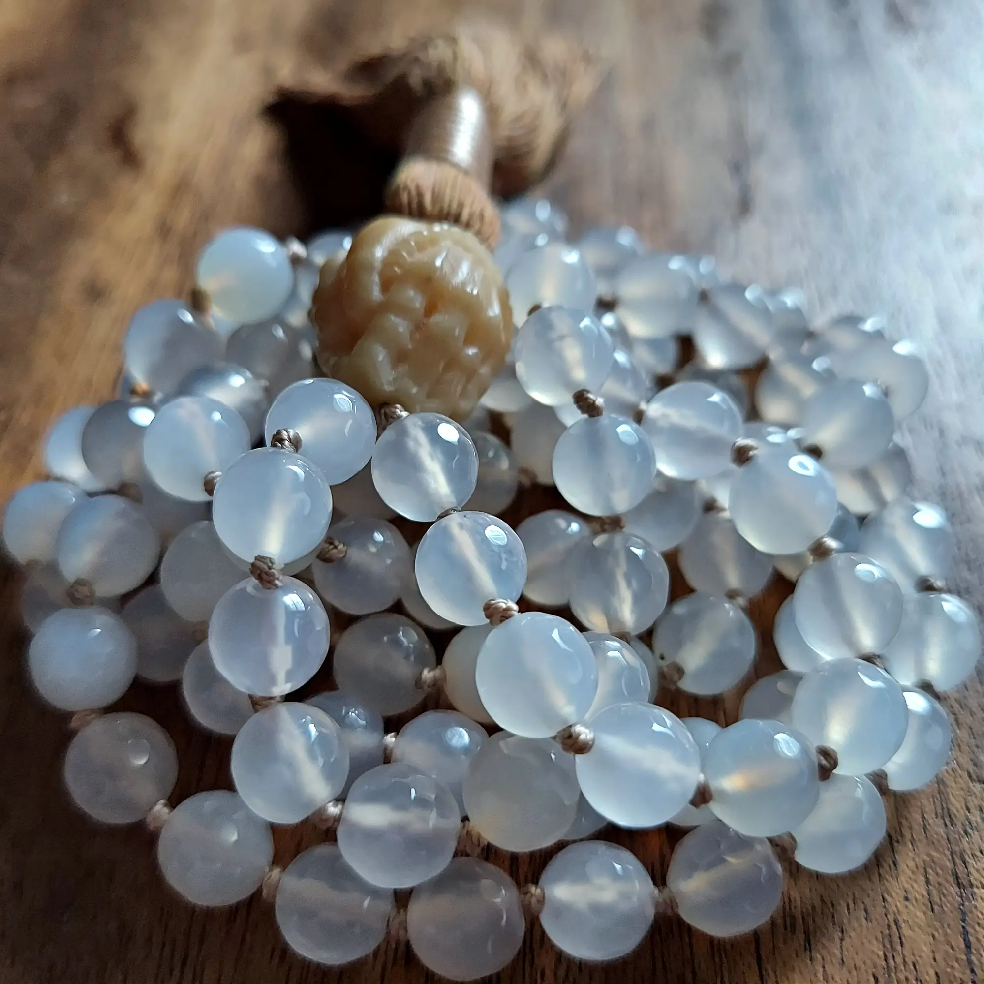 This beautiful 🙏 Devotion in Light Mala Necklace includes White Jade beads (8mm, faceted, hand-knotted), a craved Bodhi Tree Root Guru Bead in the form of praying hands holding a mala, and a cotton tassel.