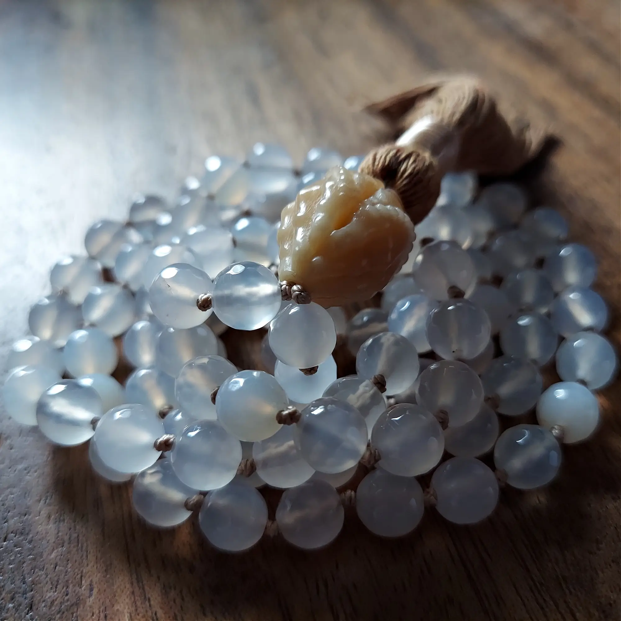 Strung with faceted White Jade that shimmers like moonlight on calm water, this mala soothes the soul and centers the mind. At its heart is a hand-carved Bodhi Root guru bead, lovingly shaped into the prayer hands posture, holding a tiny mala between them—a reverent symbol of awakening, humility, and conscious practice. A golden cotton tassel completes the piece with soft radiance.