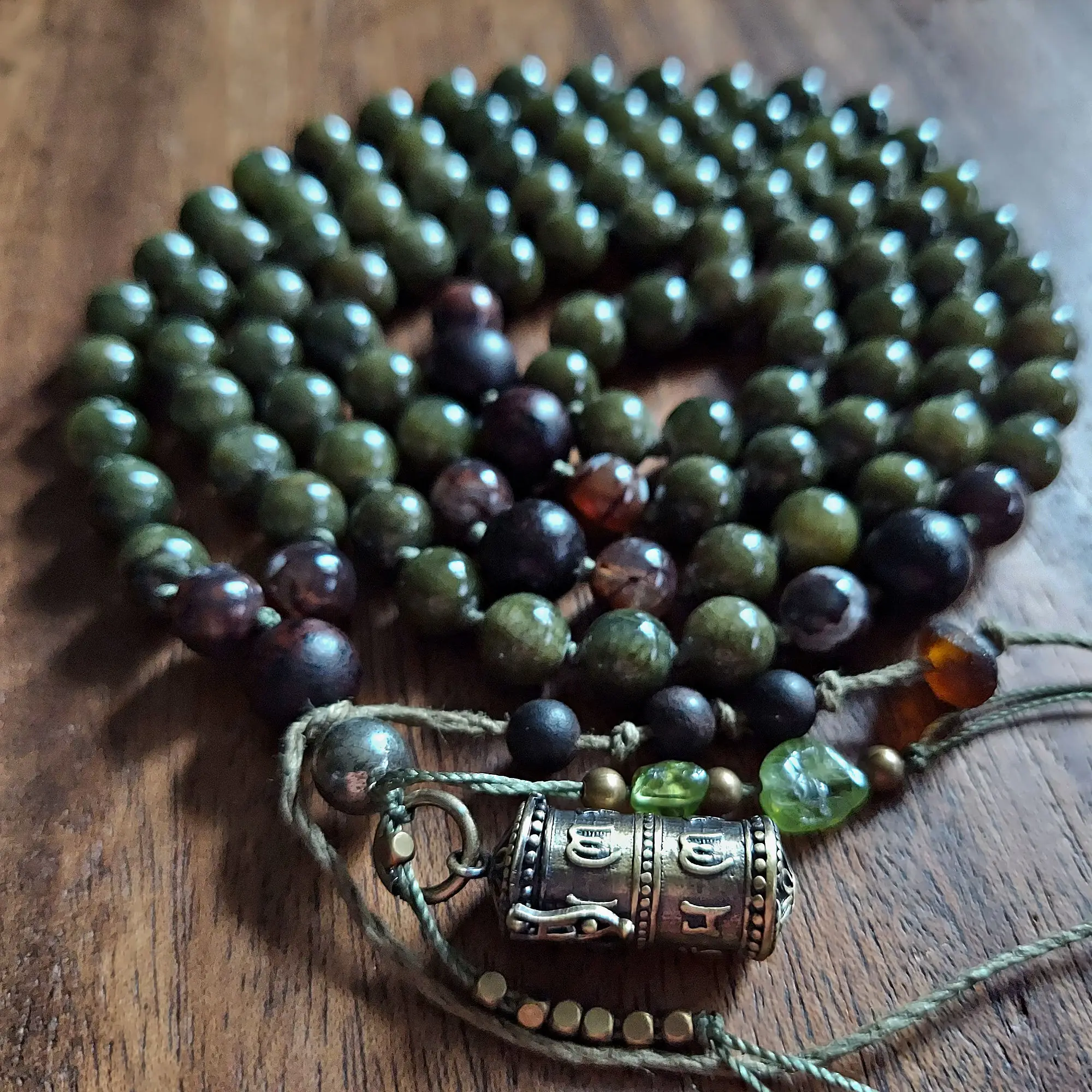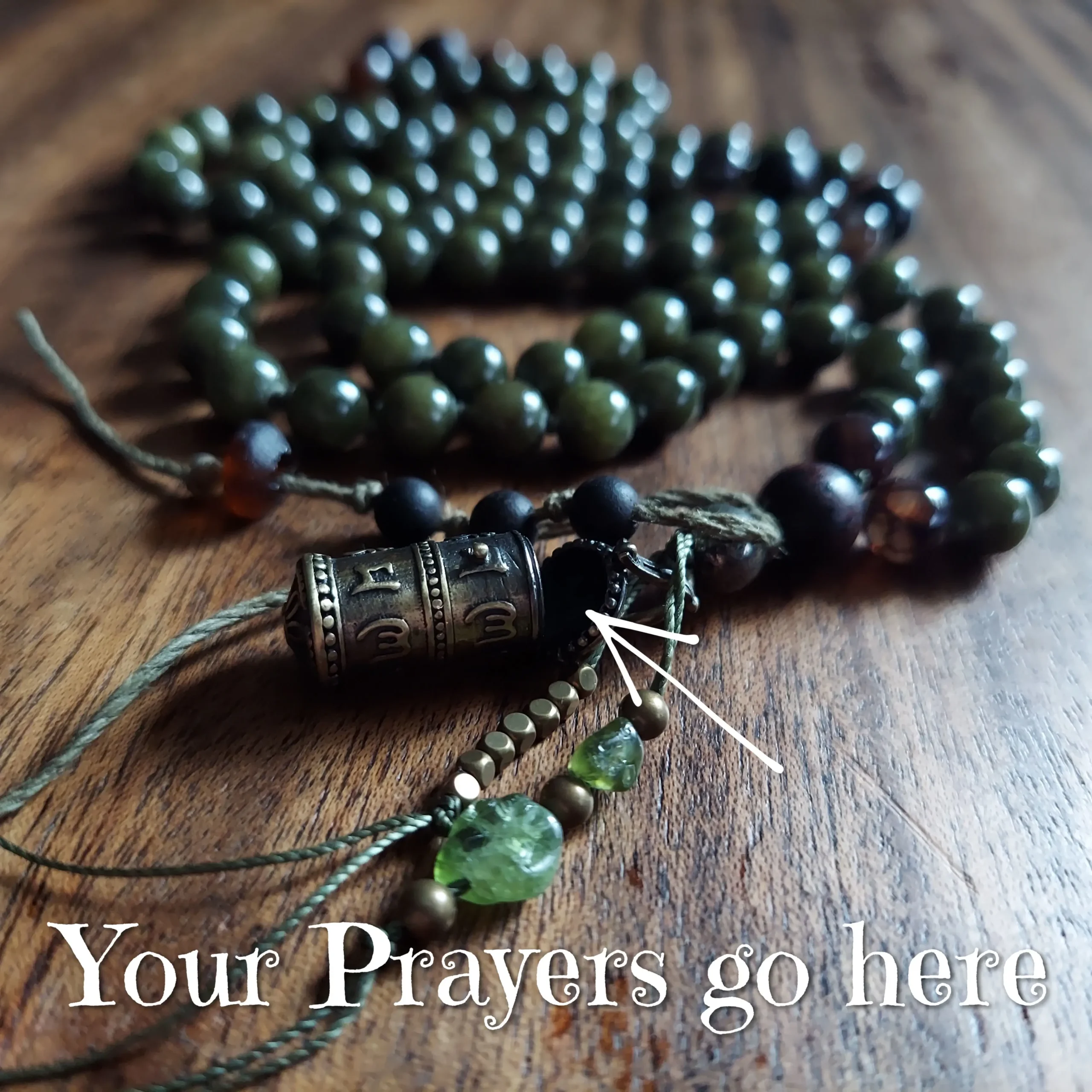 The distinctive string tassel features smaller Ebony Wood beads, Peridot, Copper, old recycled glass, and a Bronze Prayer Box, perfectly designed to hold your prayers and blessings. Each Prayer Box also includes a printed copy of the Prayer of Saint Francis of Assisi, bringing added peace and divine guidance to your practice.