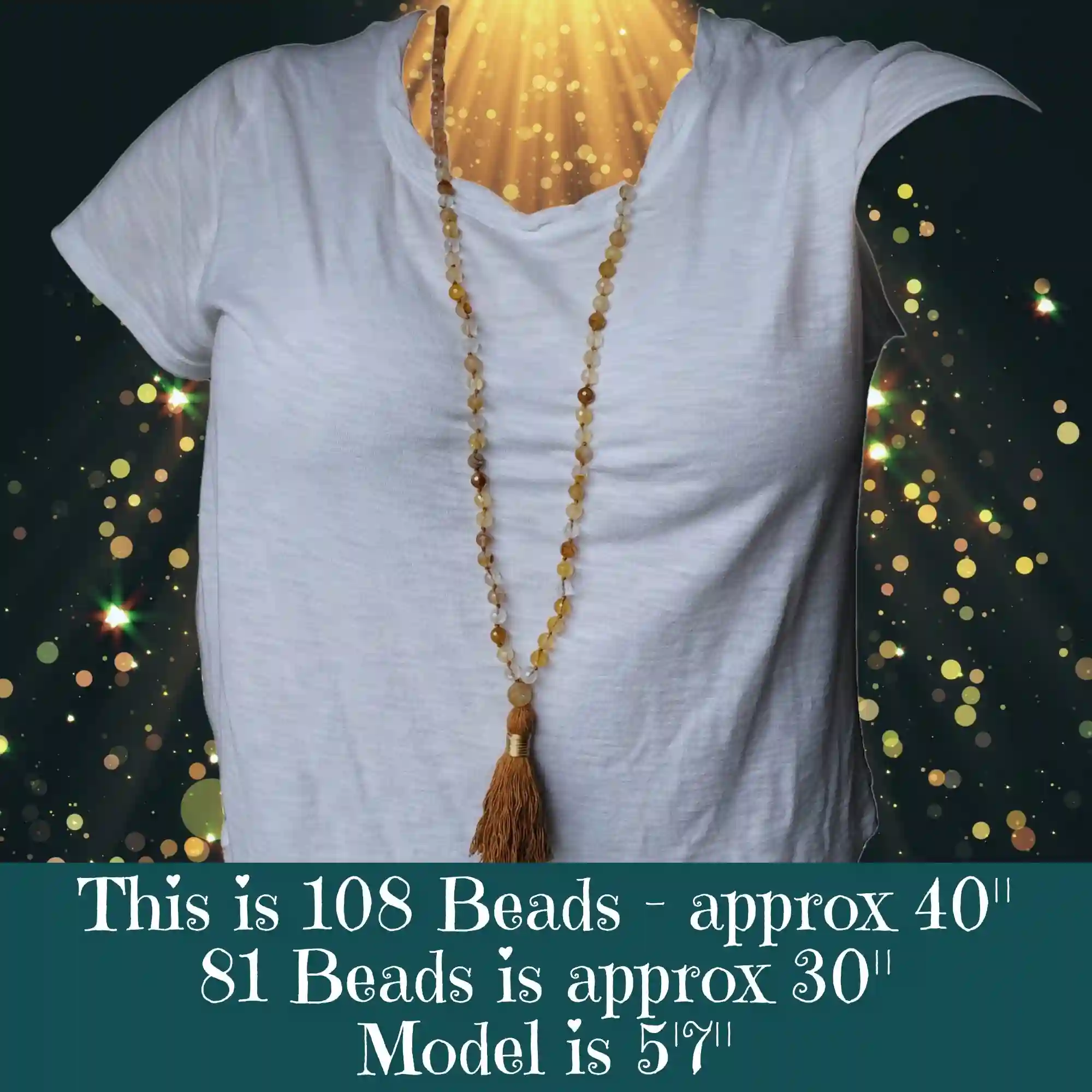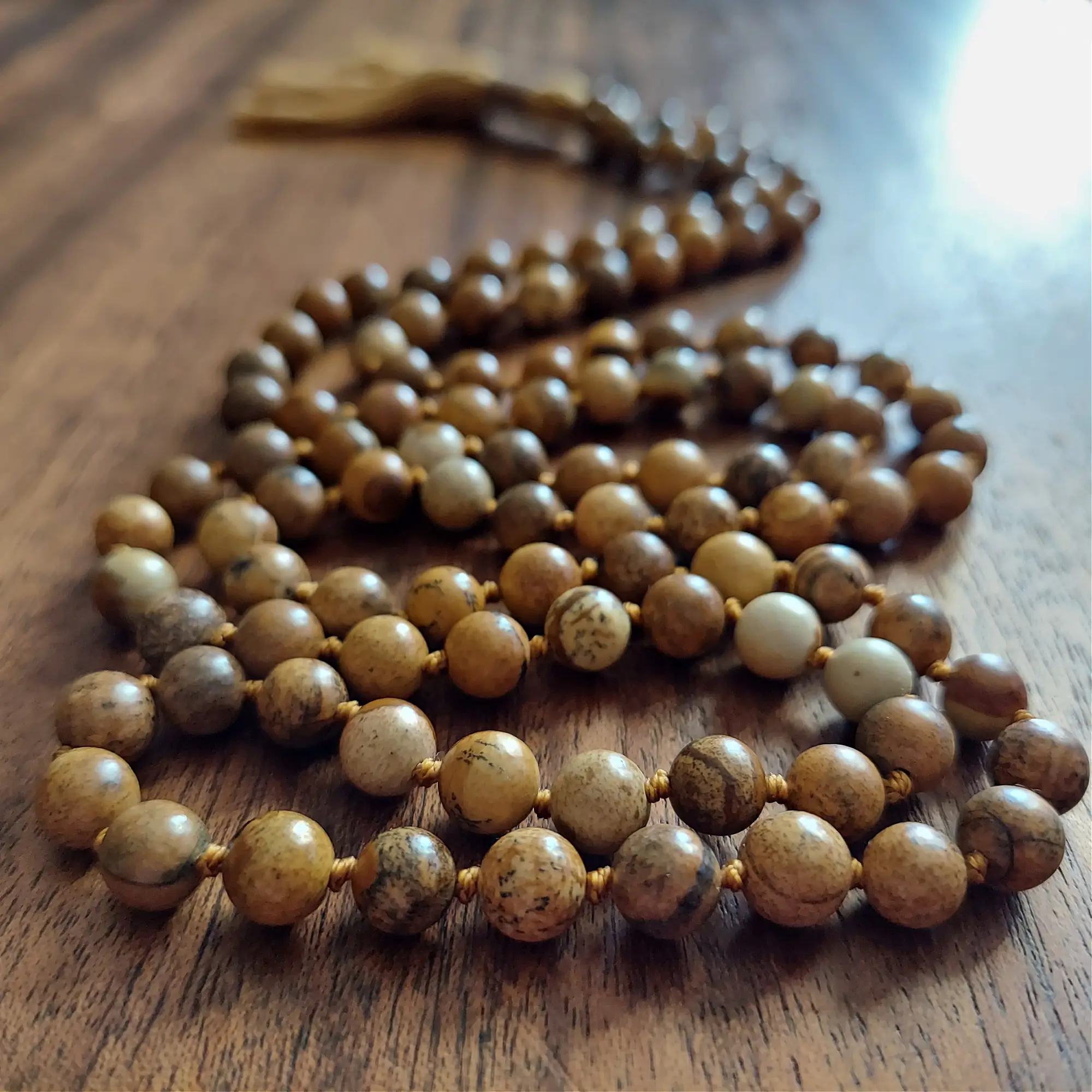 Your mala beads will include a cotton tassel and nylon cord for knots, which, unlike silk, does not rot, stretch, or fray. Cotton & nylon are far superior for something we handle and wear daily.