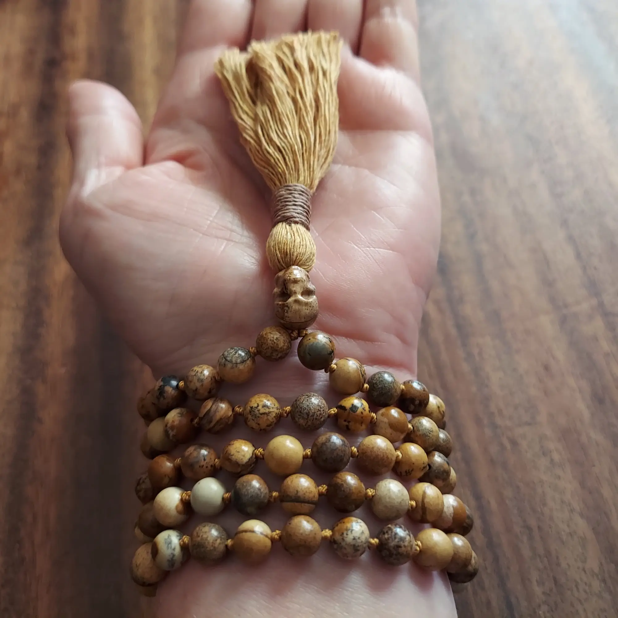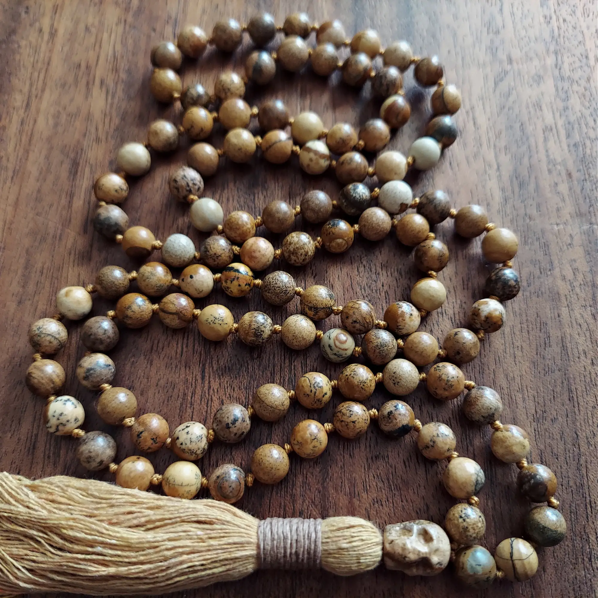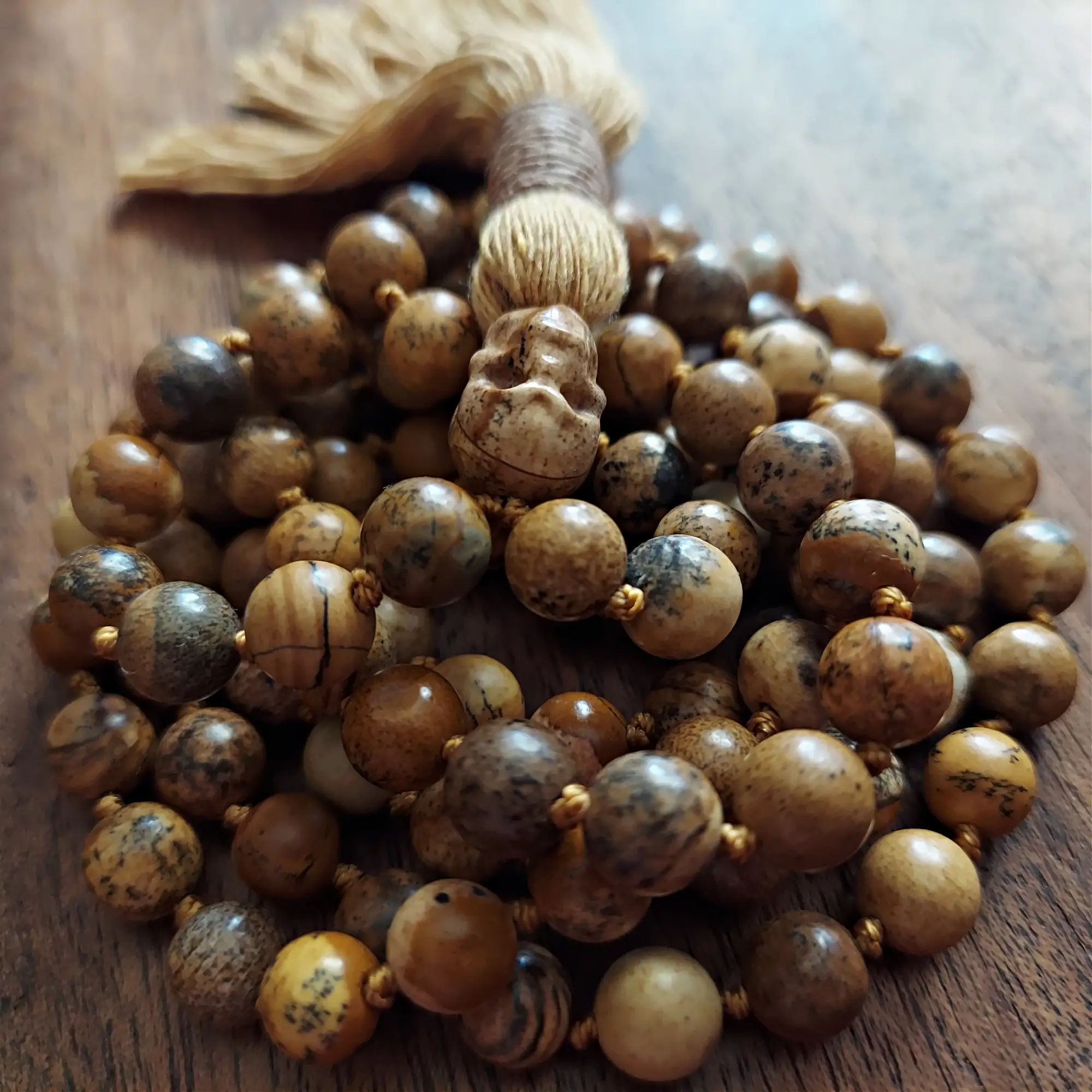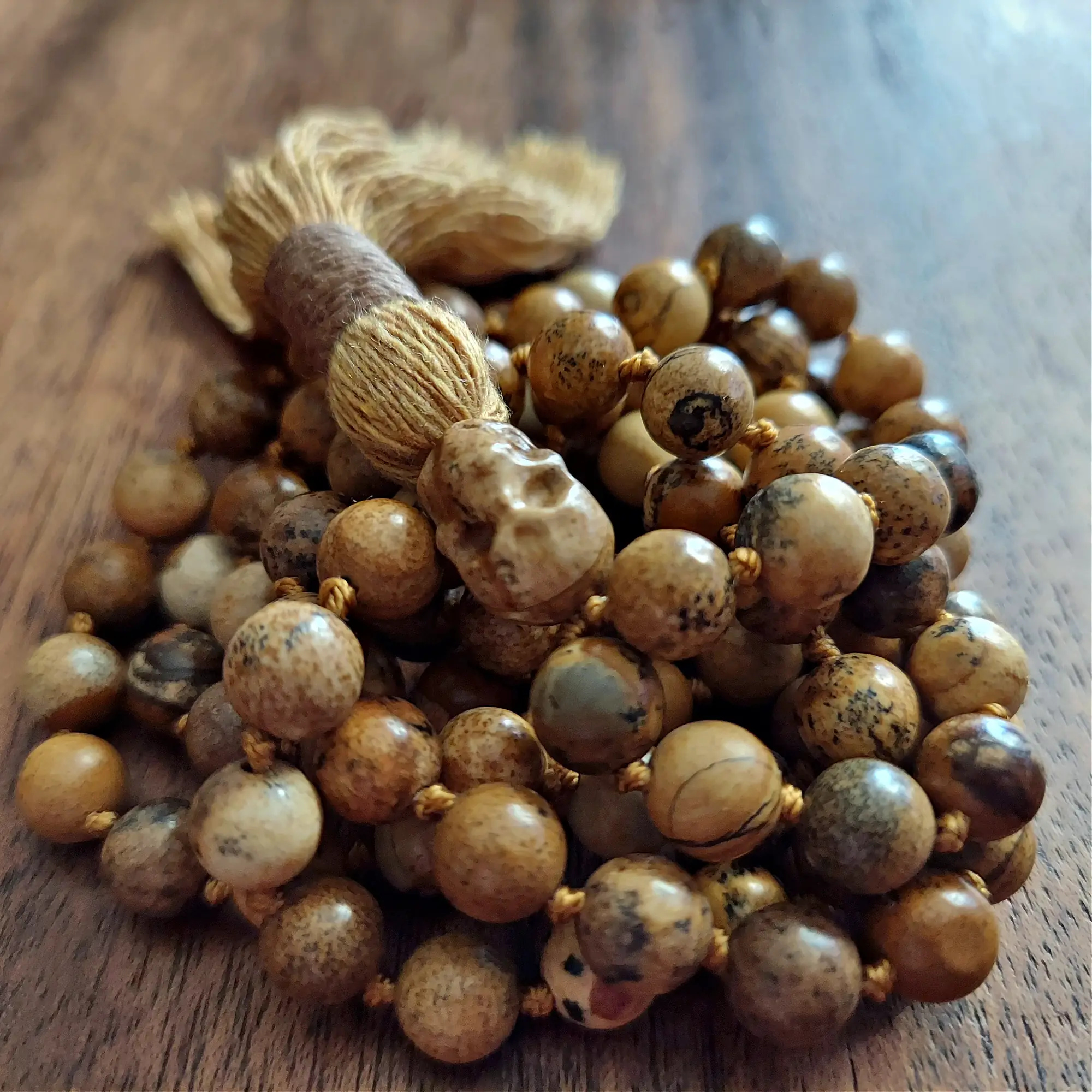 Embrace Grounding, Protection, and Inner Strength with the Picture Jasper Skull Mala