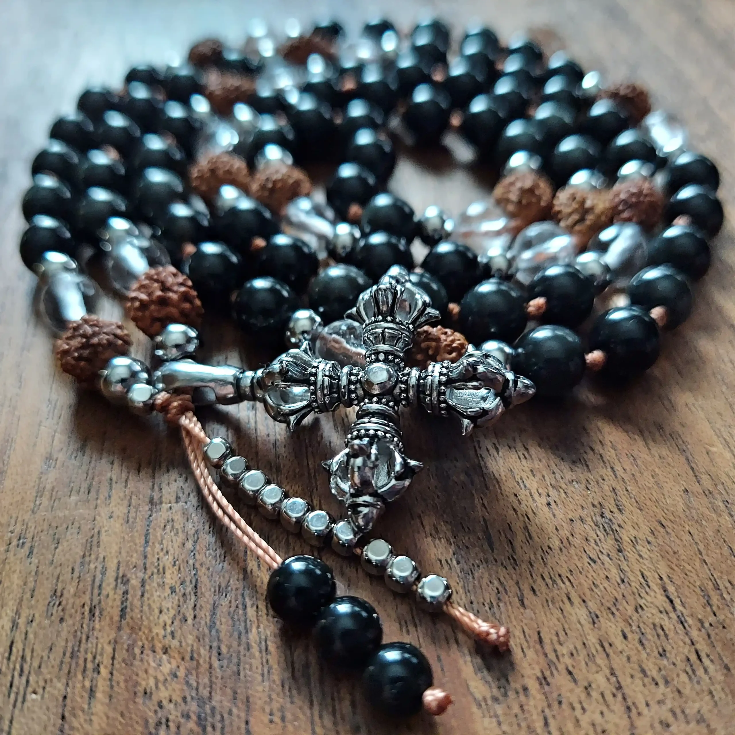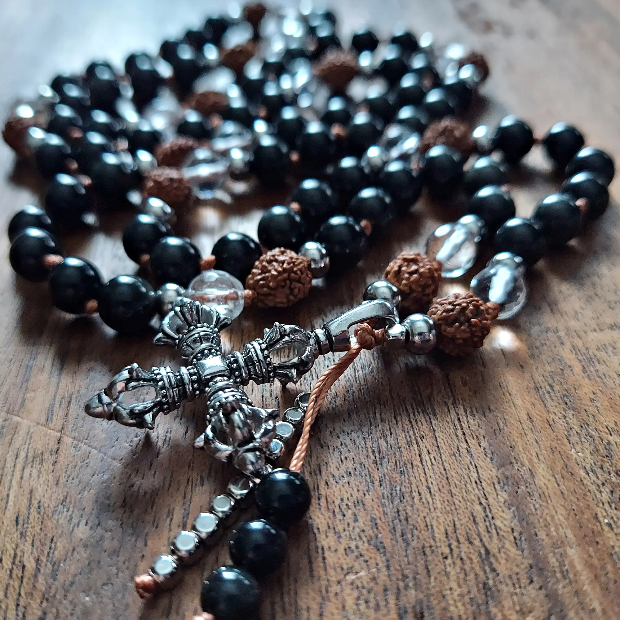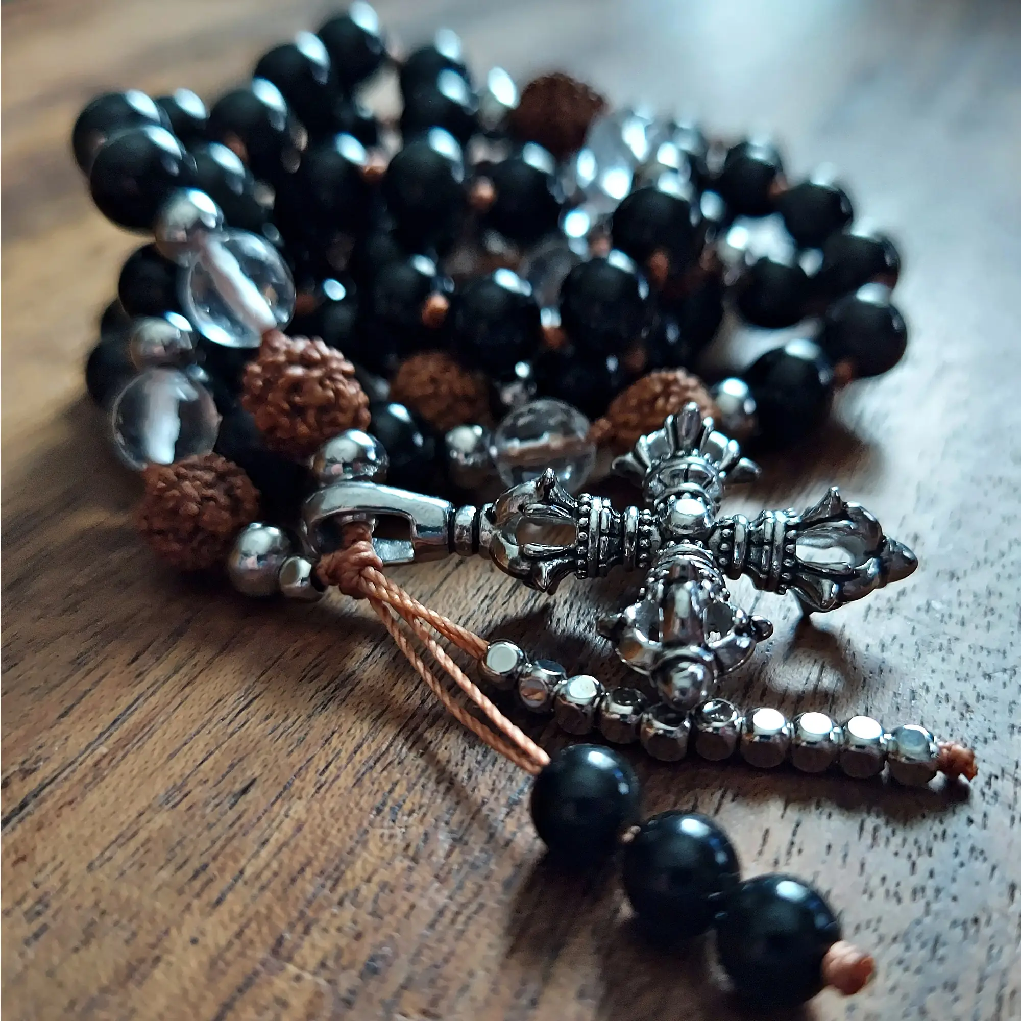 Anchor your spirit and embrace unyielding protection with the Guardian Strength Mala, crafted with Obsidian, Clear Quartz, sacred Rudraksha beads, and stainless steel accents. Featuring a bold double Vajra pendant and a sleek Obsidian-and-stainless-steel dragon tail tassel, this mala is a steadfast ally for clarity, grounding, and spiritual empowerment.