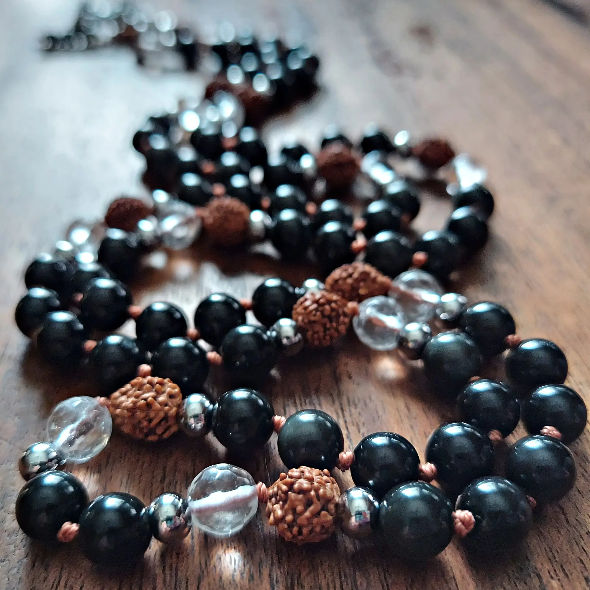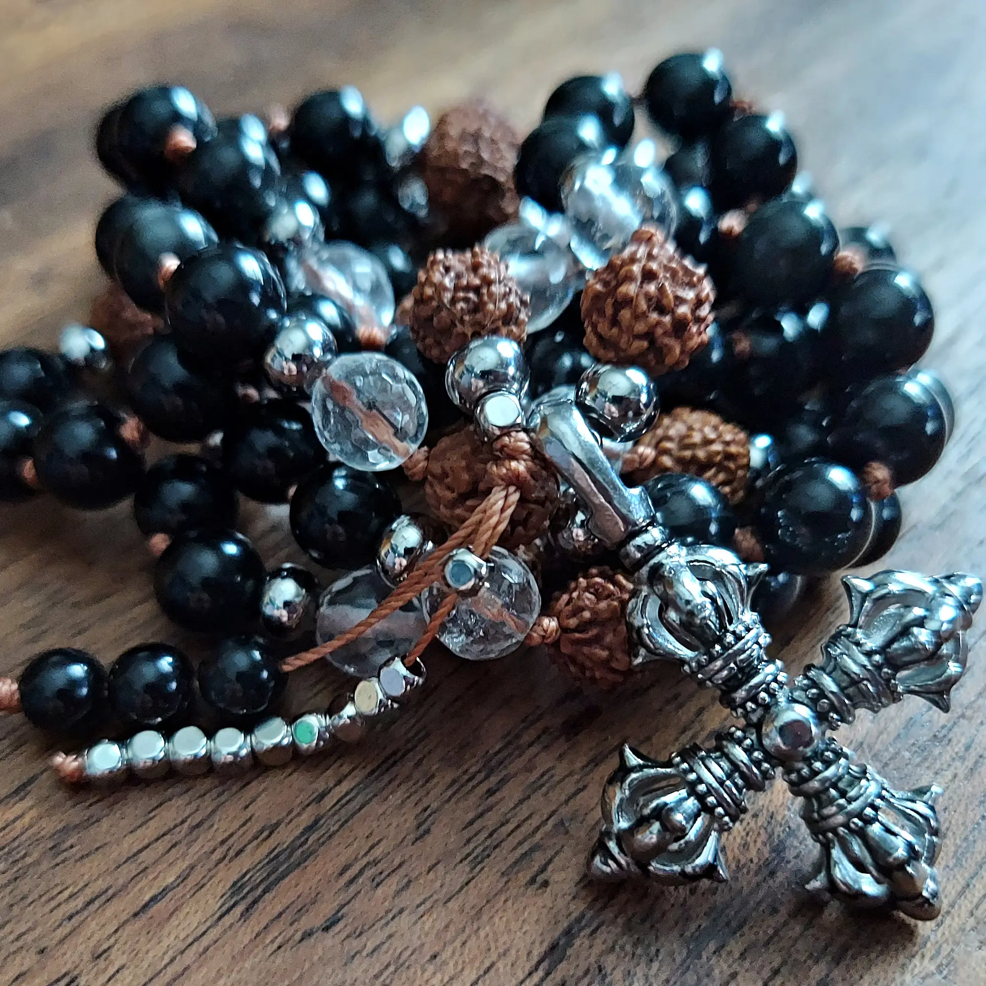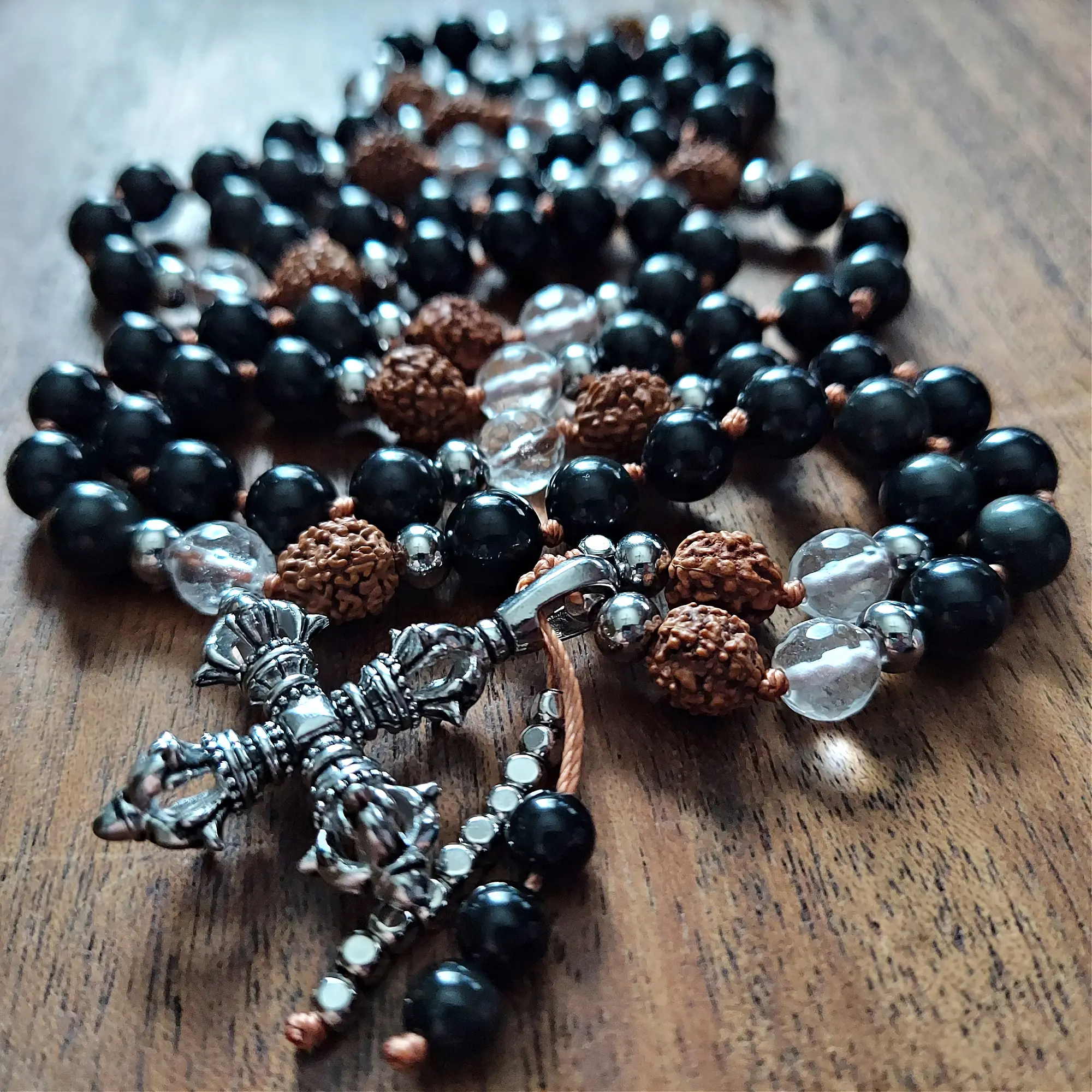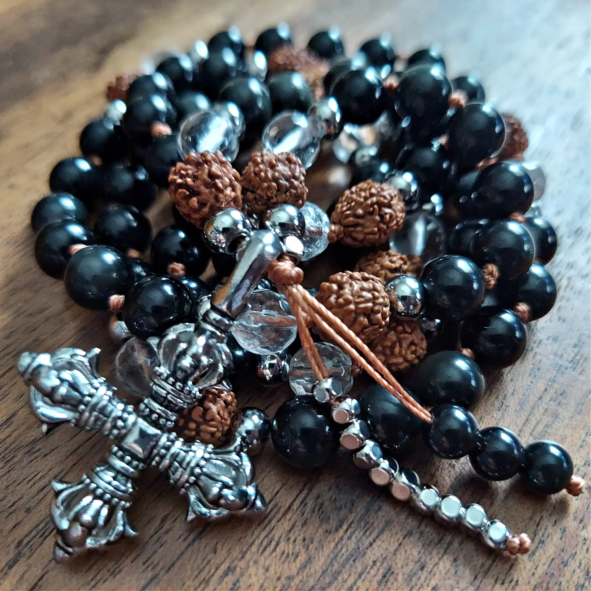 Anchor your spirit and embrace unyielding protection with the Guardian Strength Mala, crafted with Obsidian, Clear Quartz, sacred Rudraksha beads, and stainless steel accents. Featuring a bold double Vajra pendant and a sleek Obsidian-and-stainless-steel dragon tail tassel, this mala is a steadfast ally for clarity, grounding, and spiritual empowerment.