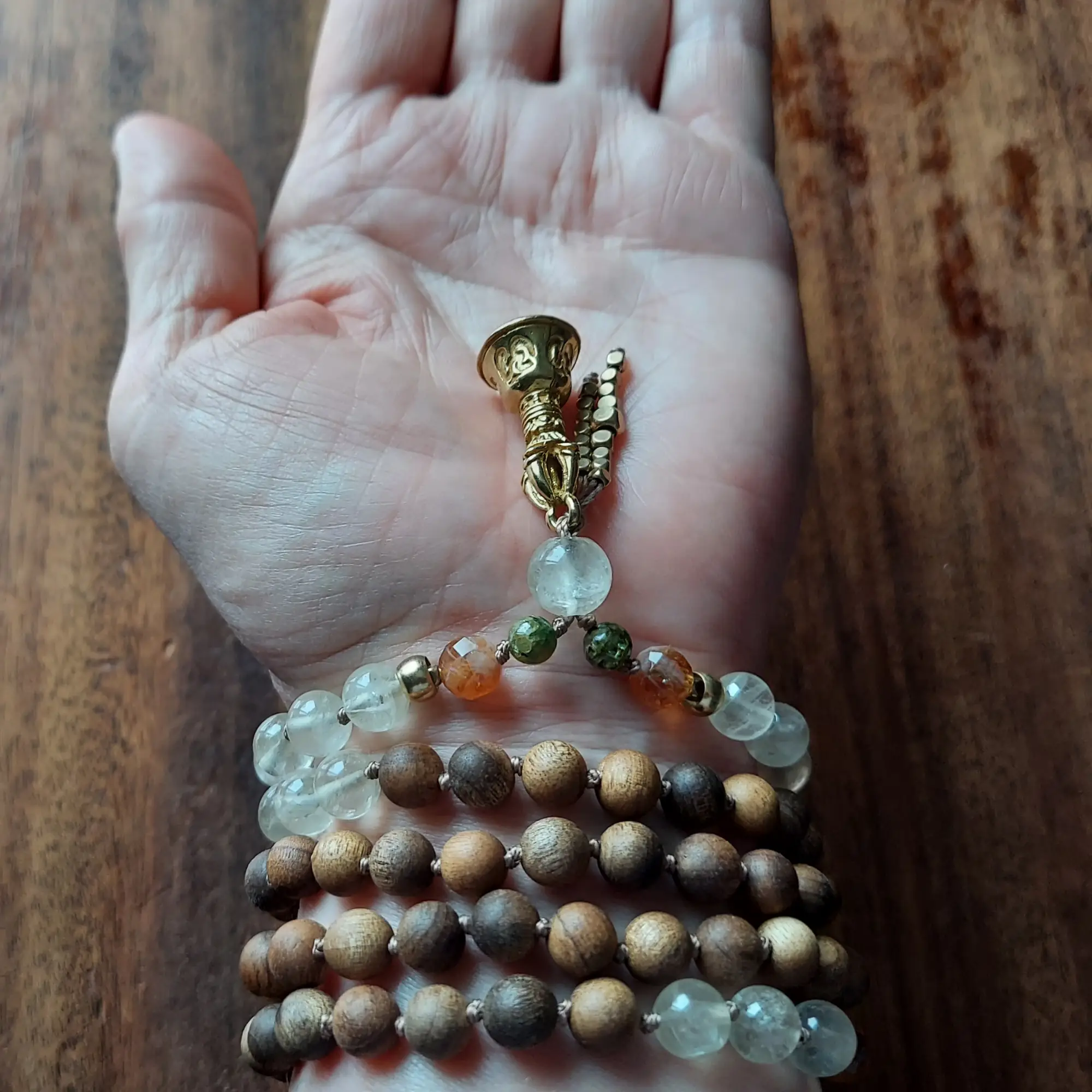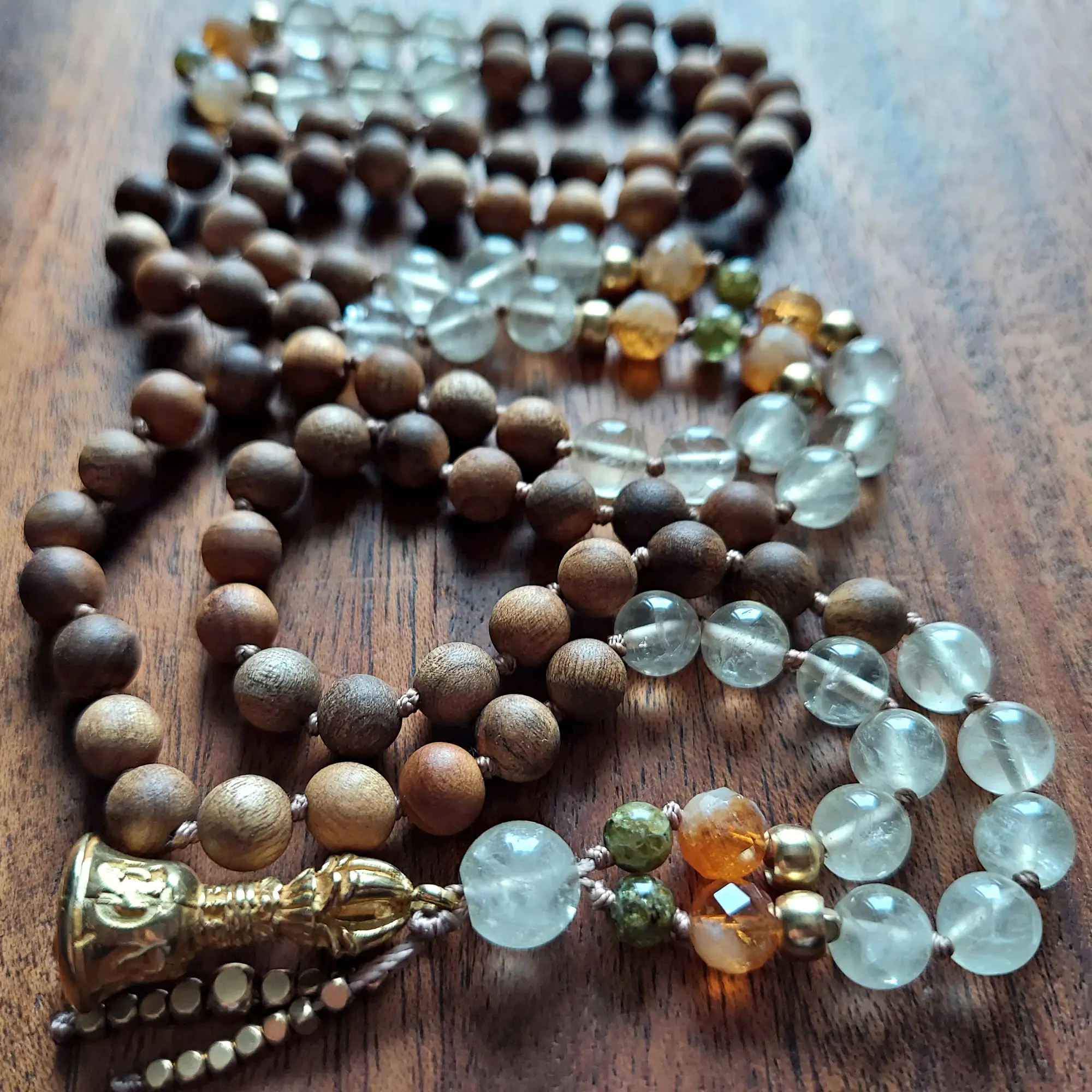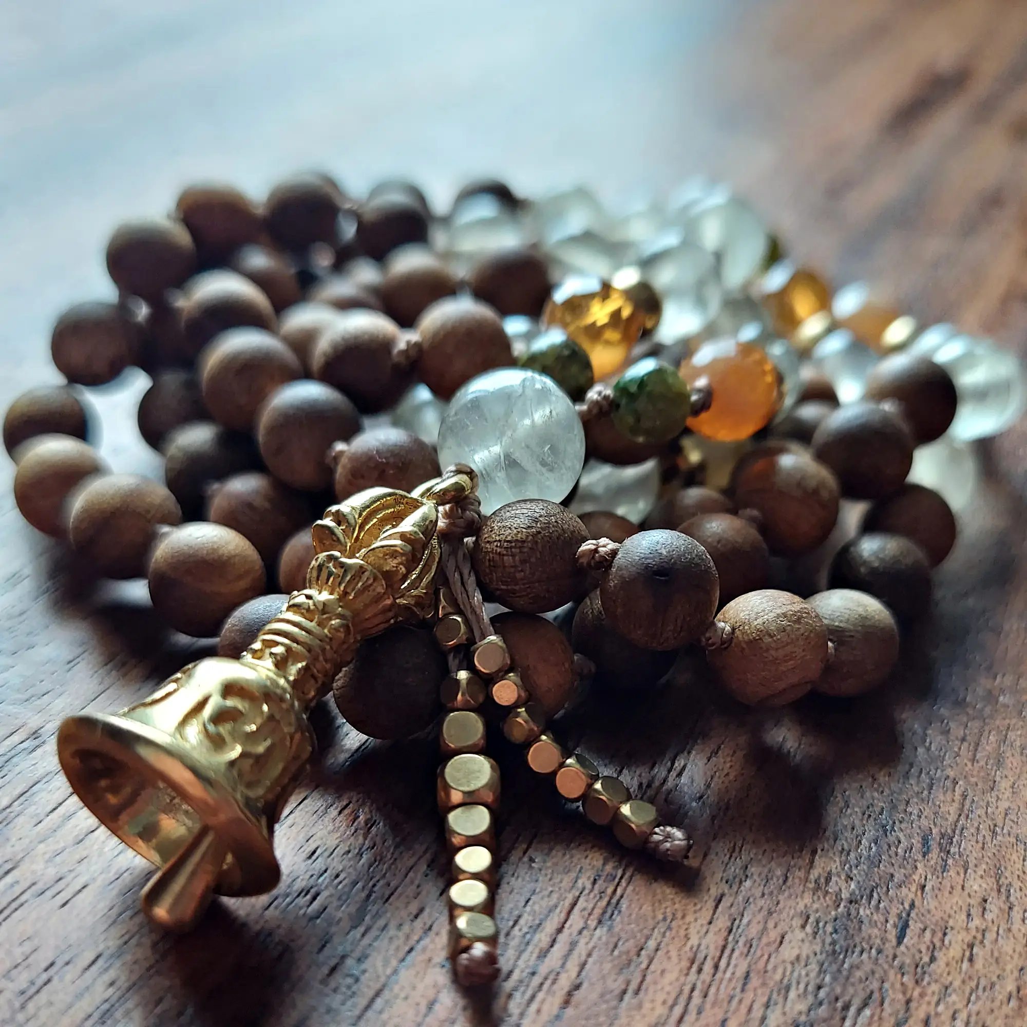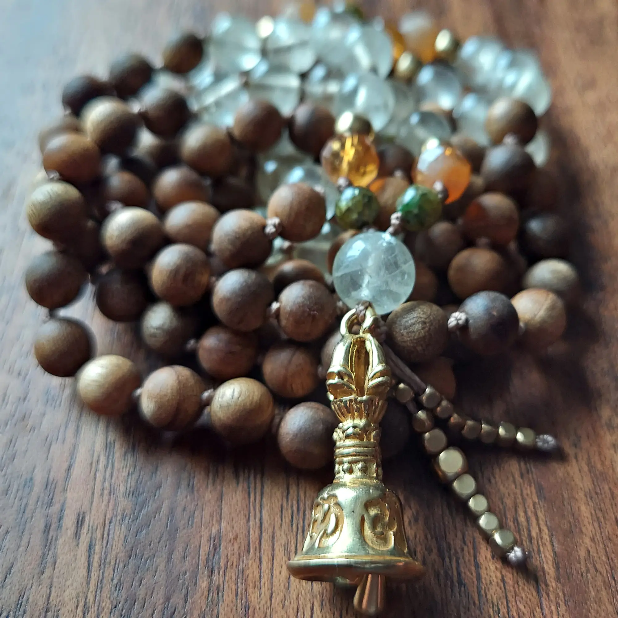 Sandalwood anchors these beads in breath and body, offering calm focus and ritual support. The brass Vajra bell symbolizes clarity of mind, awakened awareness, and the union of wisdom and compassion. Finished with a brass dragon tail tassel, this mala feels purposeful, luminous, and grounded in practice.
