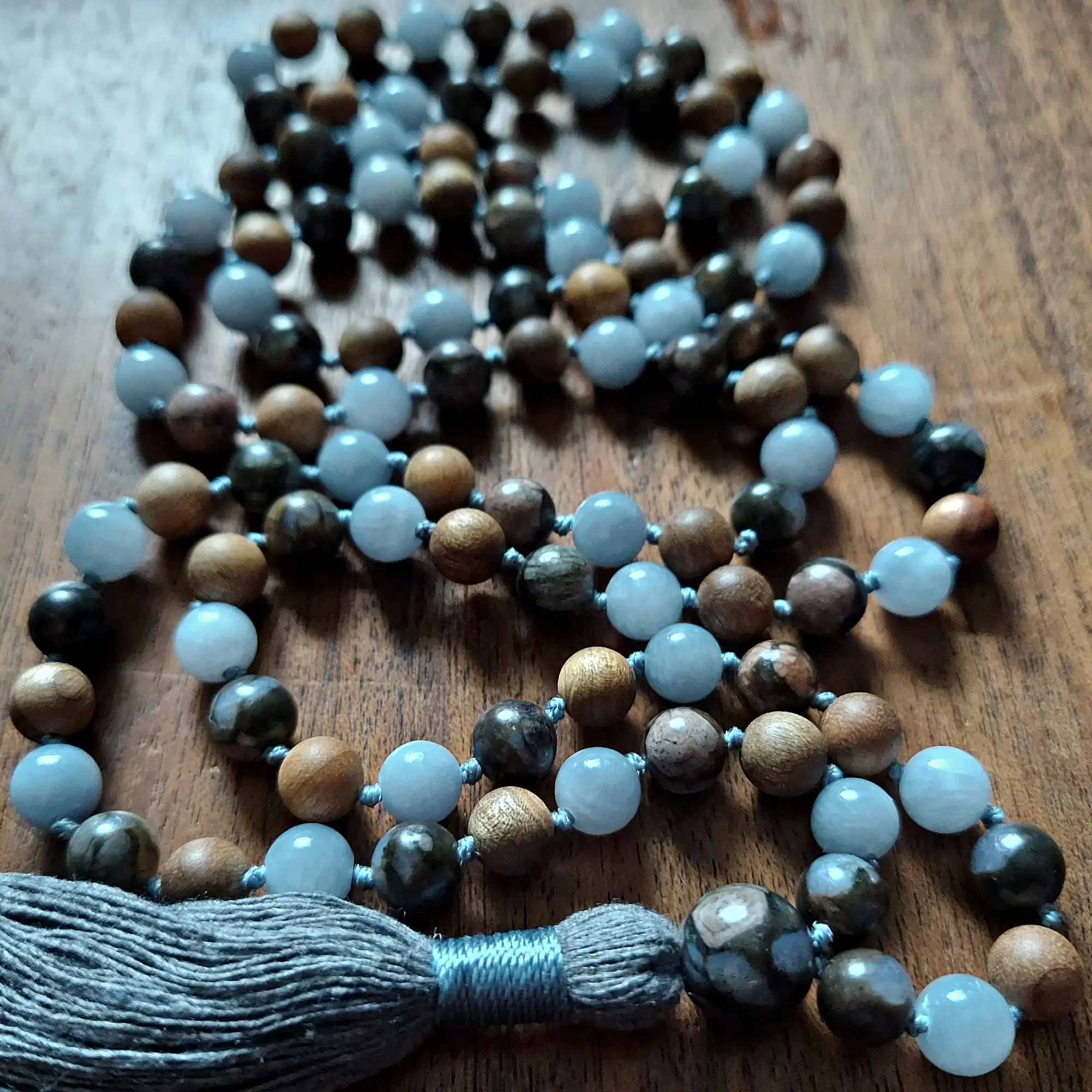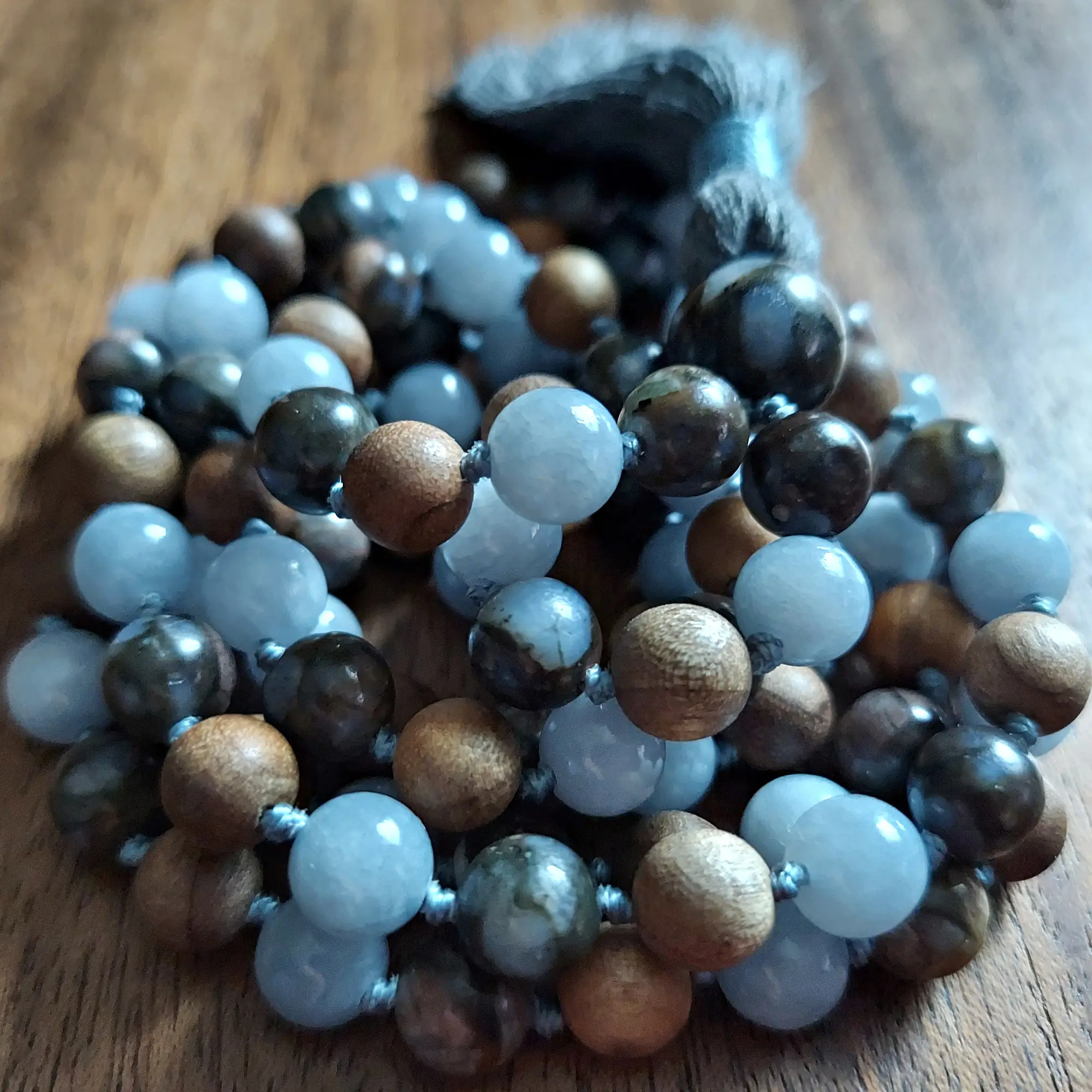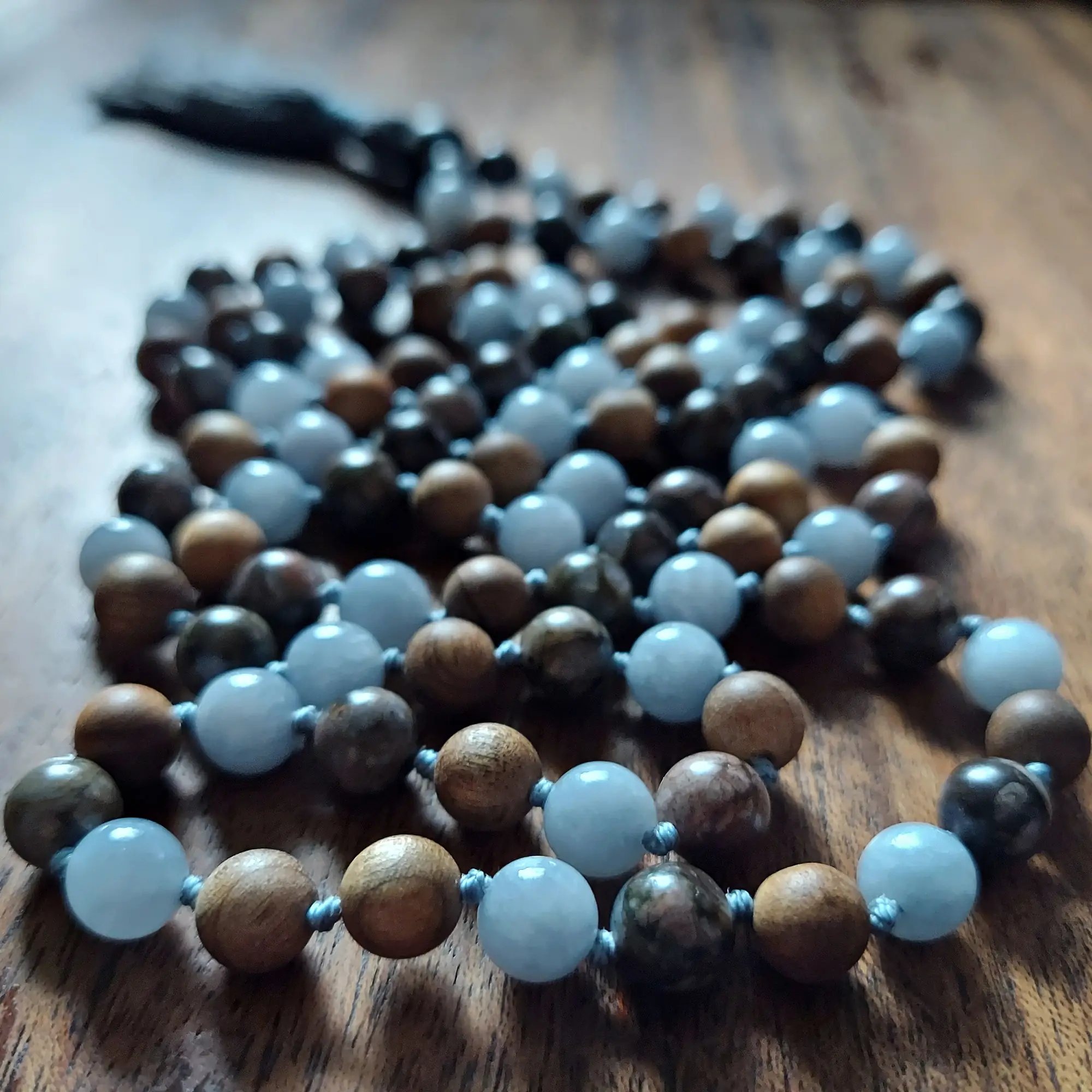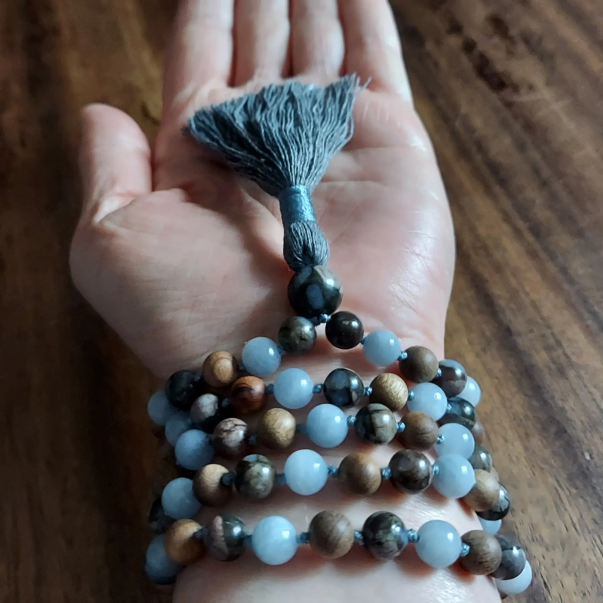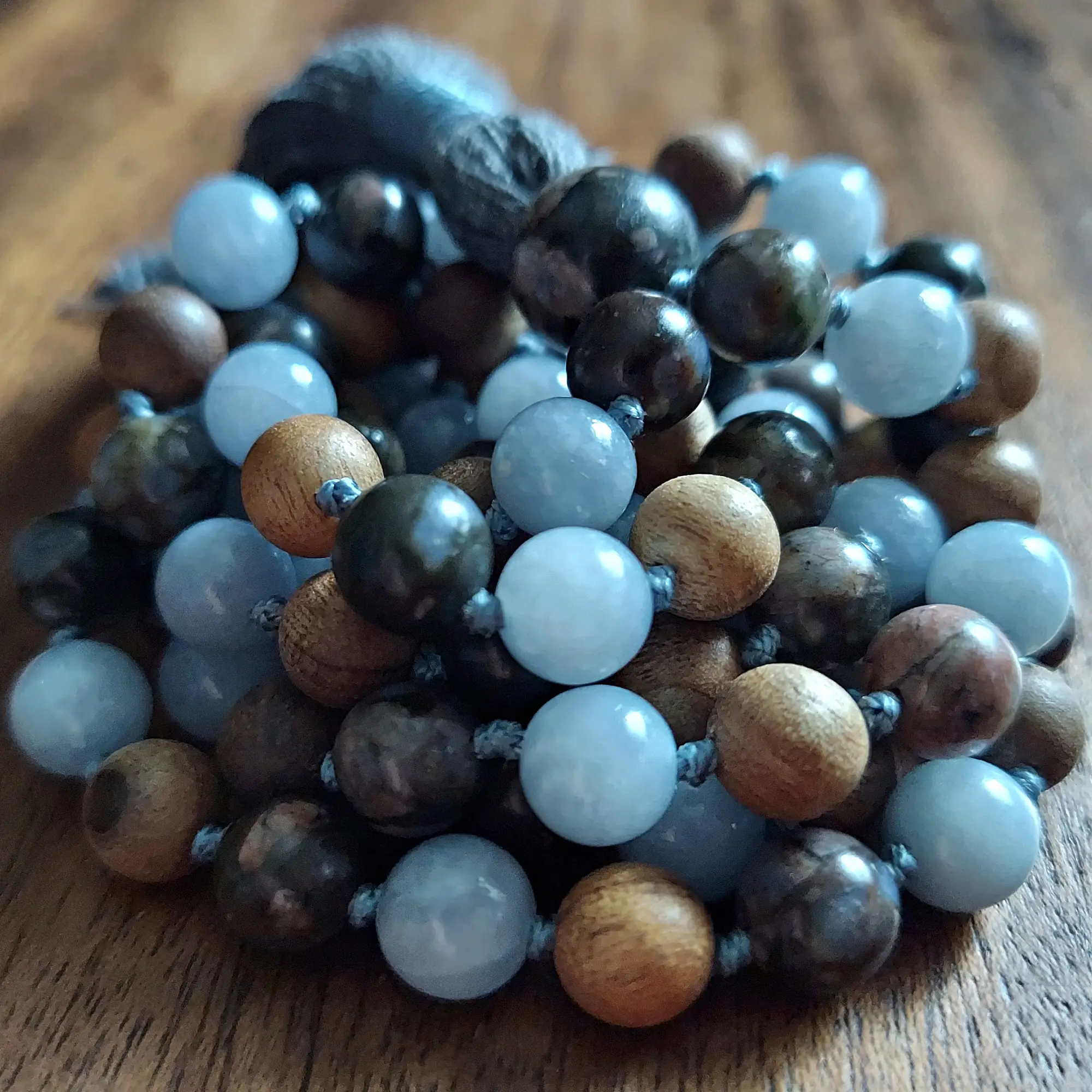 This beautiful Heaven & Earth Mala ☁️🌿💙 includes Celestite, African Blue Opal, and Sandalwood beads (8mm, hand-knotted) to resonate with your Throat Chakra and bring peace and healing.