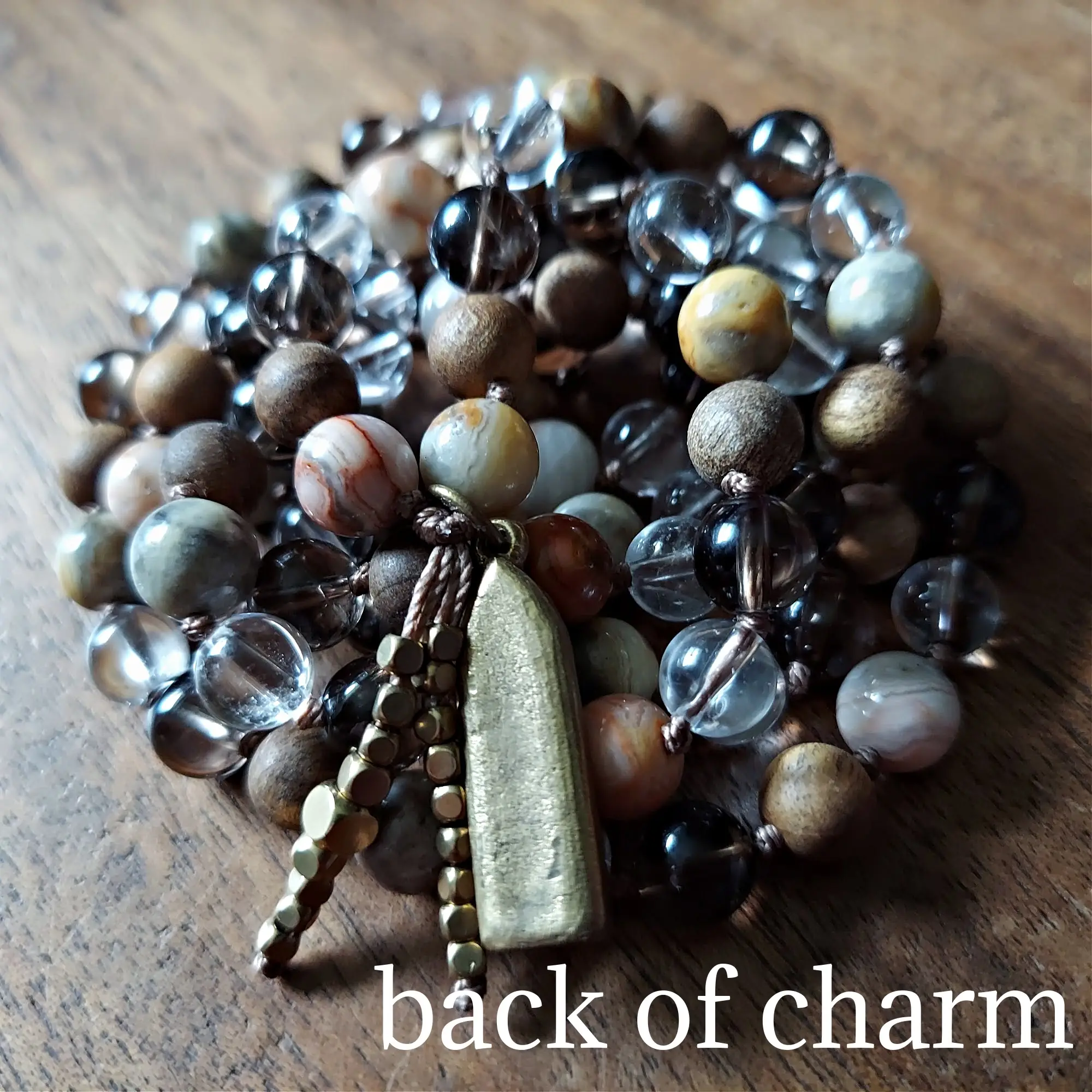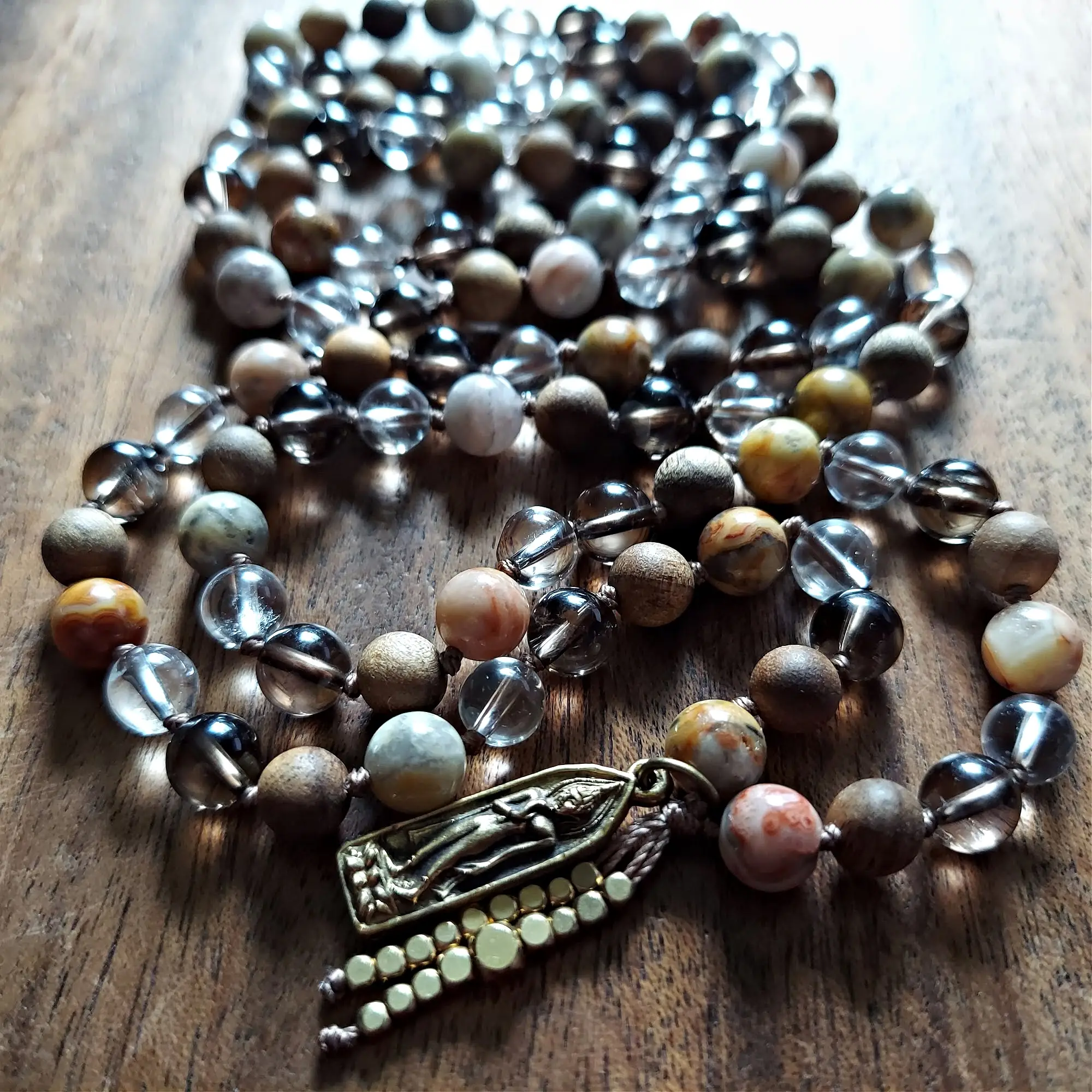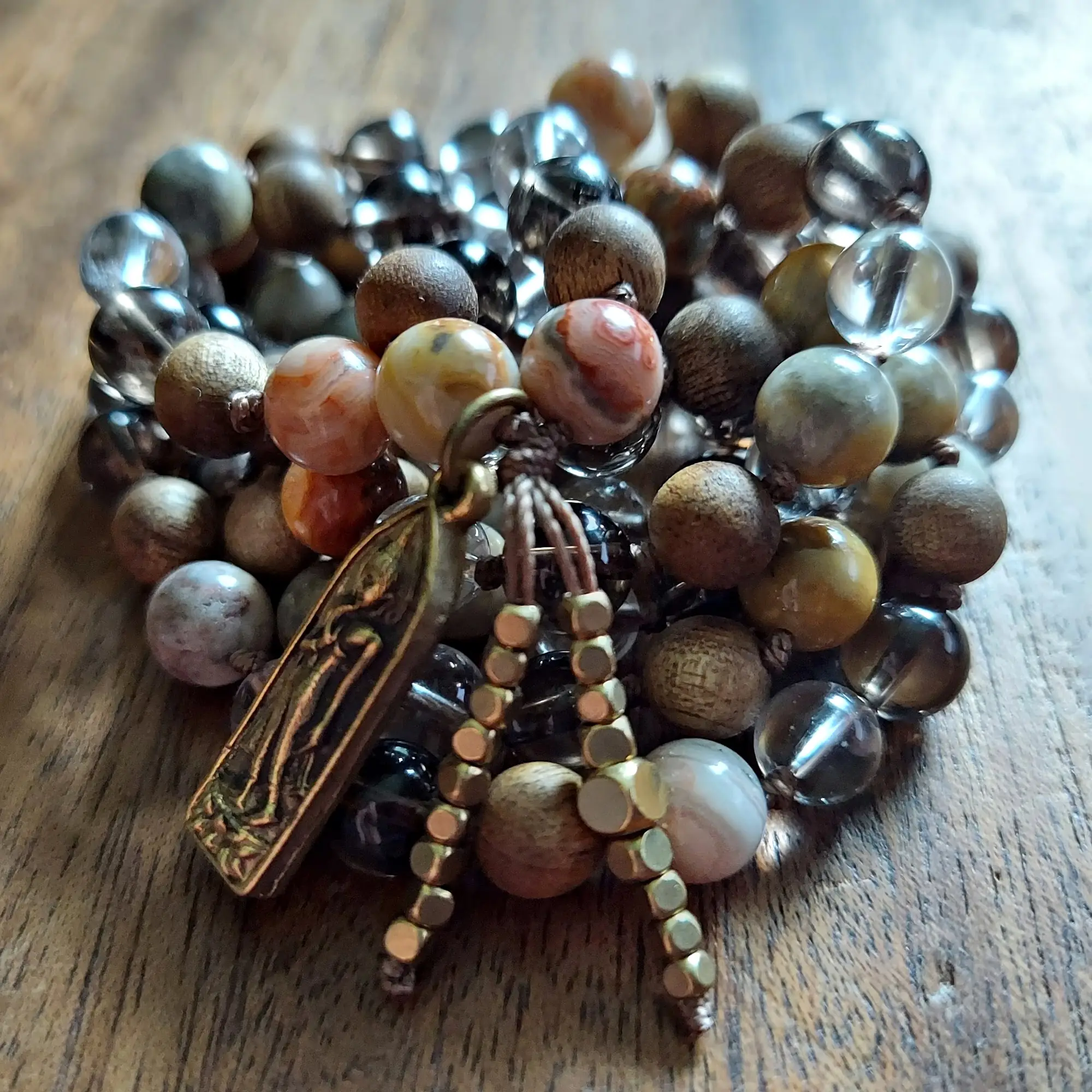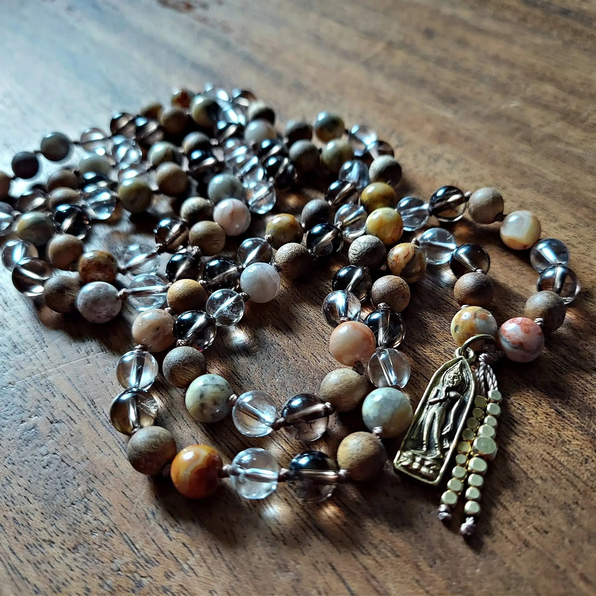 Crazy Lace Agate invites laughter and lightness into your journey, while Sandalwood offers a grounding thread of serenity and devotion. Smoky Quartz wraps you in energetic protection, gently dissolving negativity, and Clear Quartz shines a spotlight on your inner truth, amplifying intention and helping you see clearly through life’s shifting patterns.