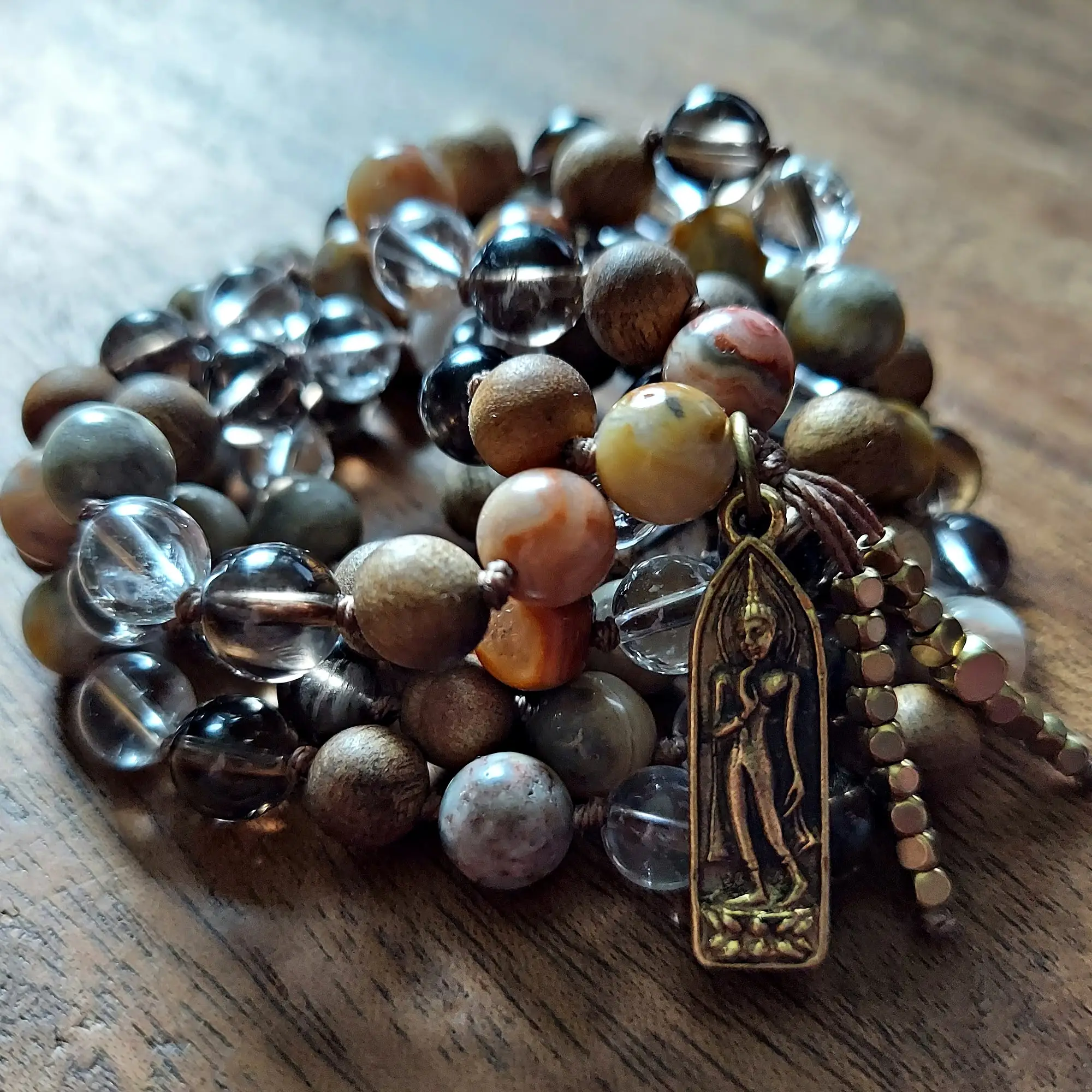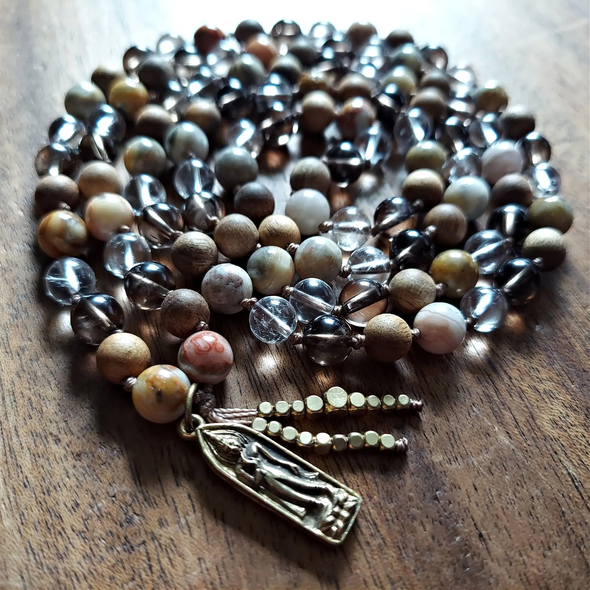This mala is a harmonious dance of energy, bringing together the high-vibe cheer of Crazy Lace Agate, the sacred calm of Sandalwood, the protective grounding of Smoky Quartz, and the amplifying brilliance of Clear Quartz. Anchored by a radiant brass Buddha charm and crowned with a brass dragon tail tassel, this piece is both a spiritual tool and a wearable prayer.