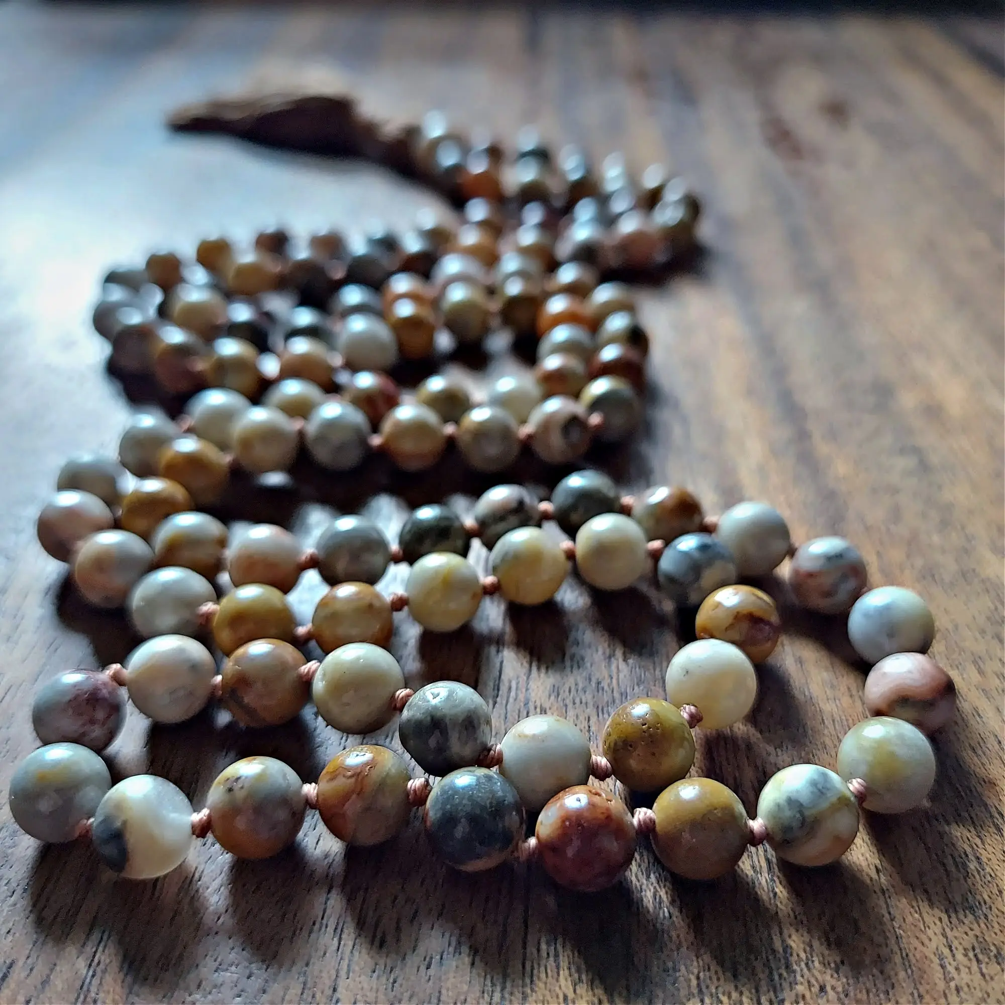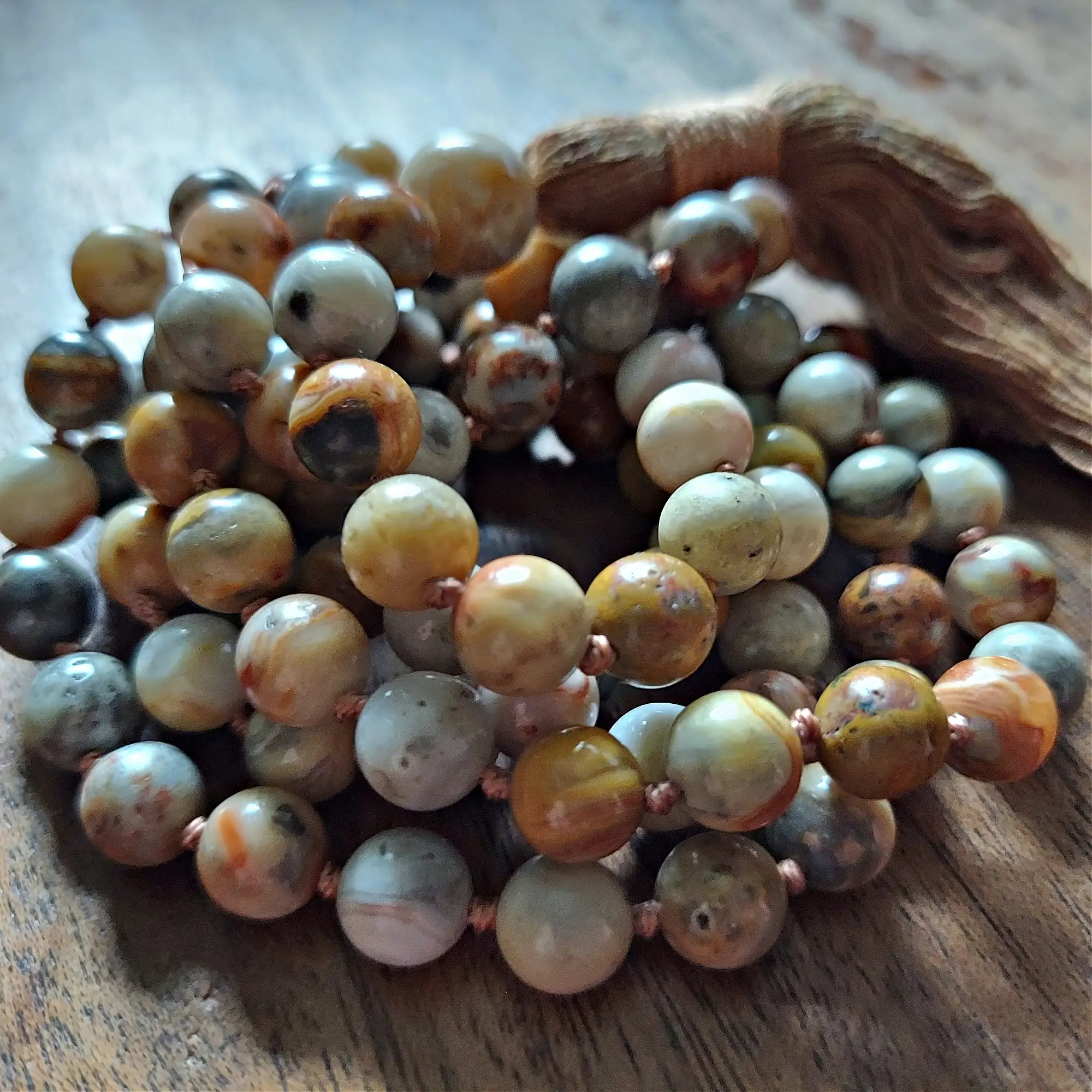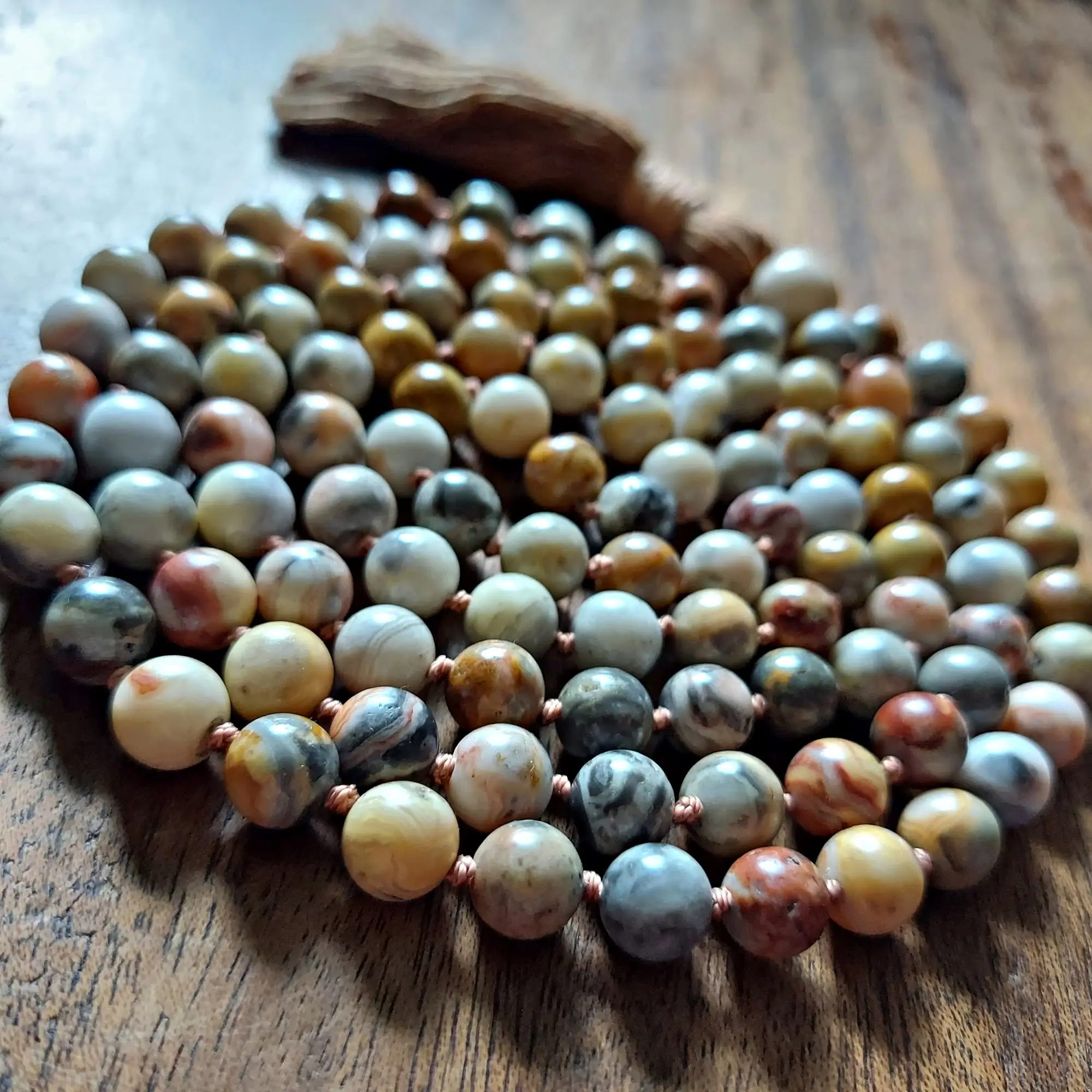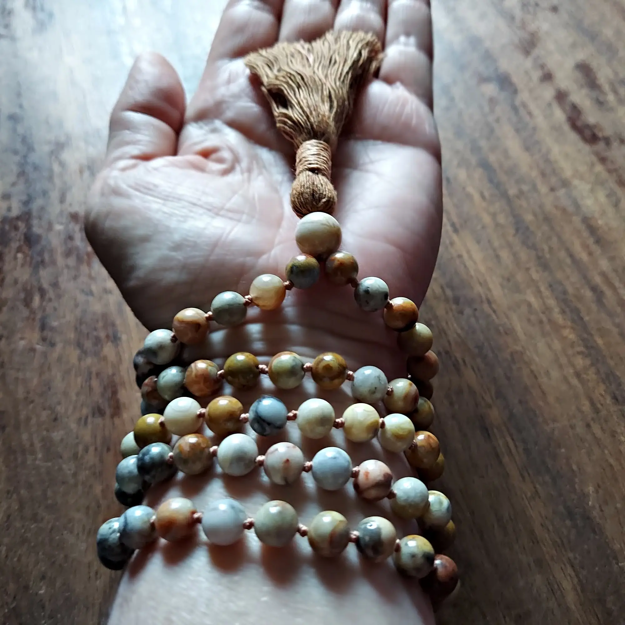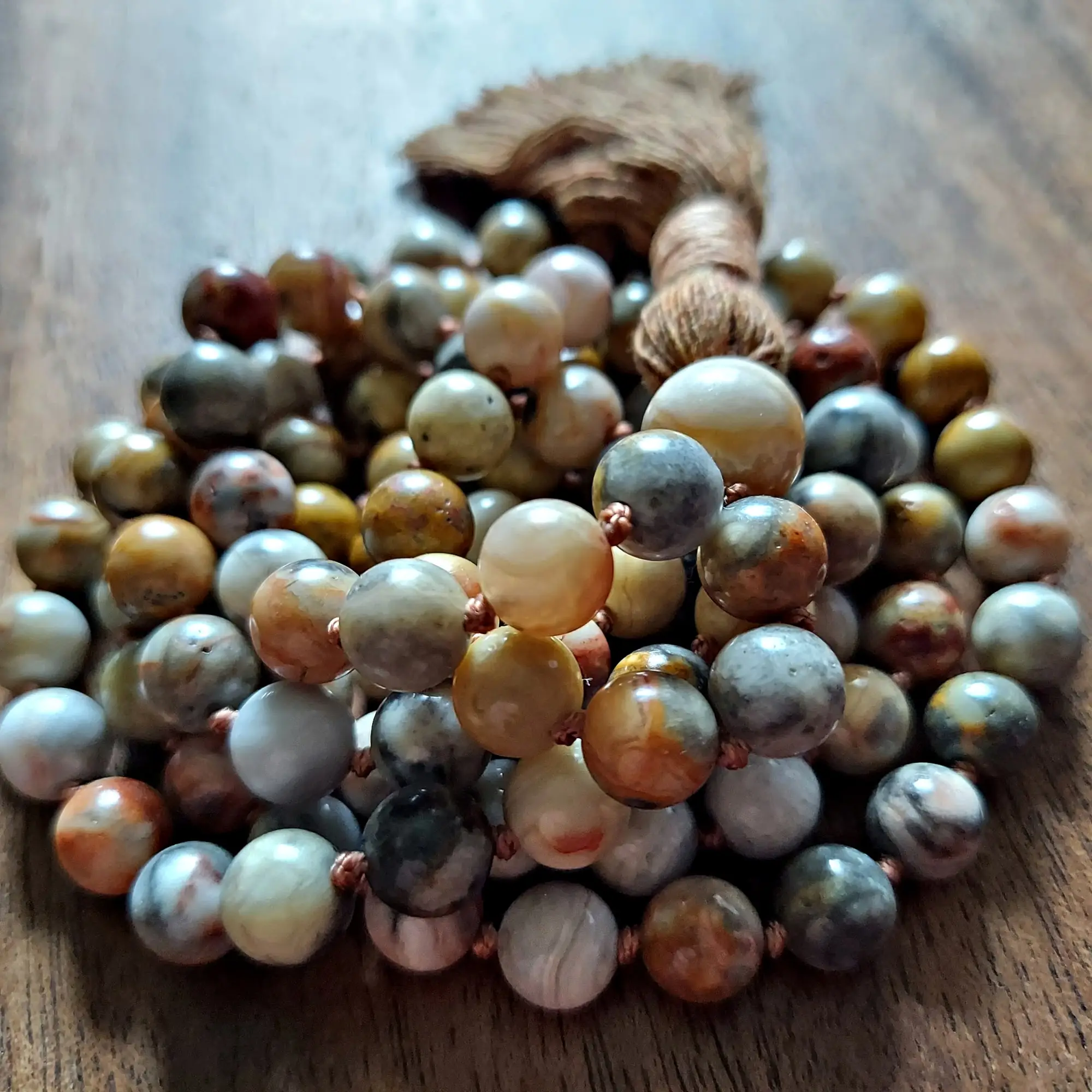 The golden-orange palette of this mala radiates warmth and creativity, igniting your inner spark while grounding you in the present. Each bead holds a kaleidoscope of earthy tones and swirling patterns, reminding you that beauty often lives in the chaotic, unexpected places. This mala is a talisman of emotional balance, encouraging you to dance with change rather than fear it.
