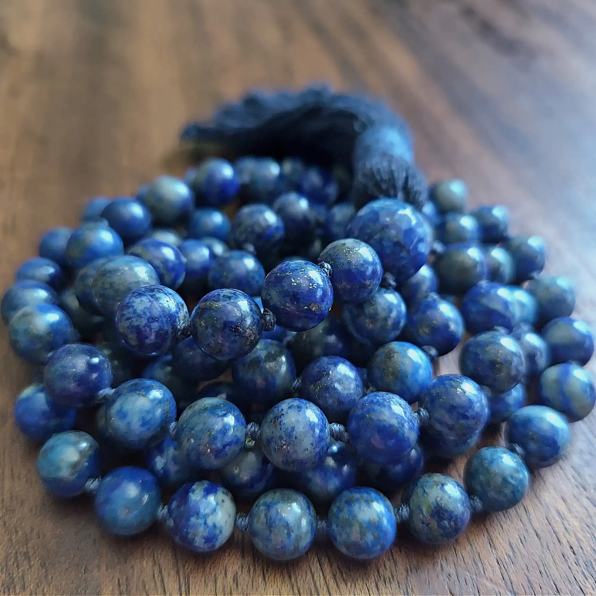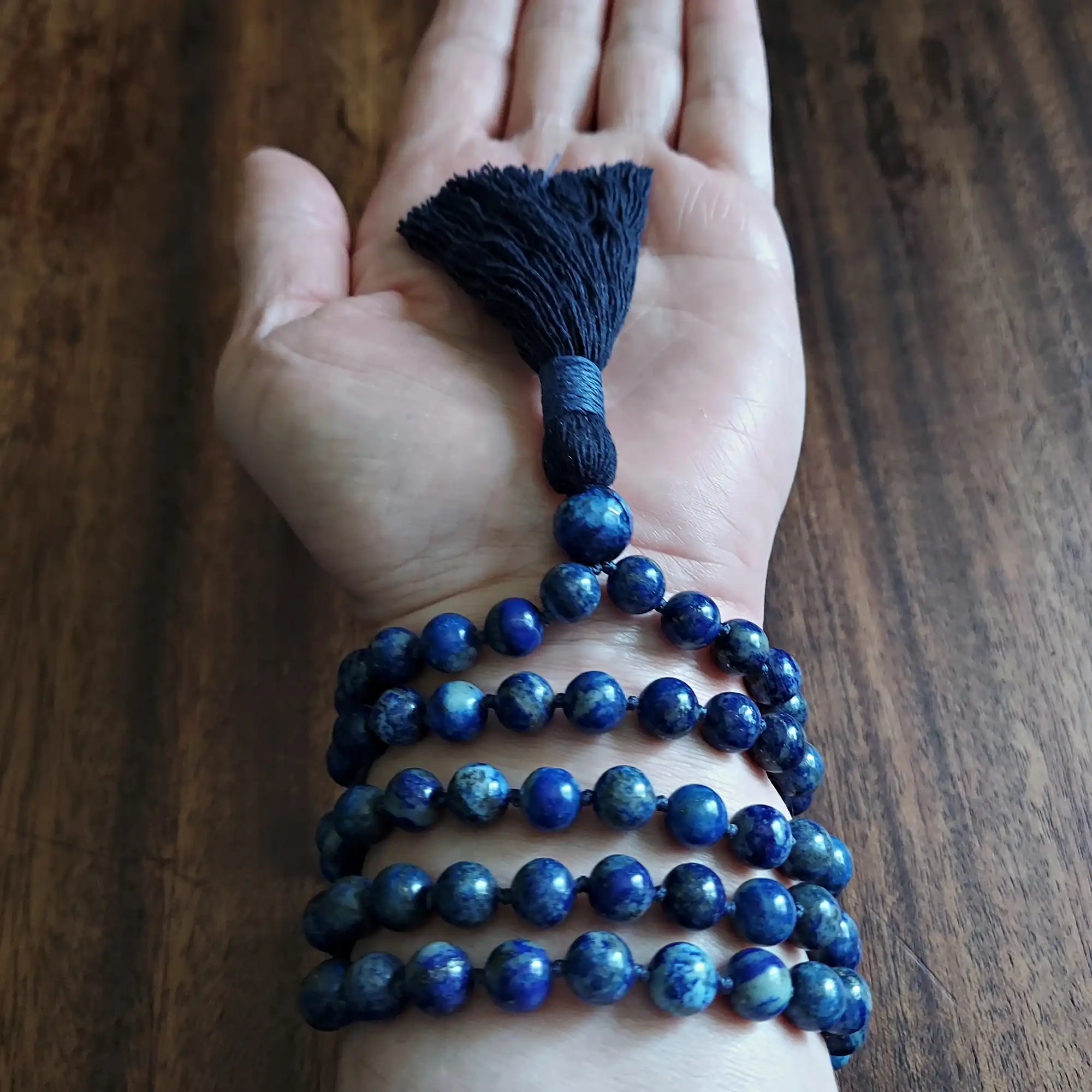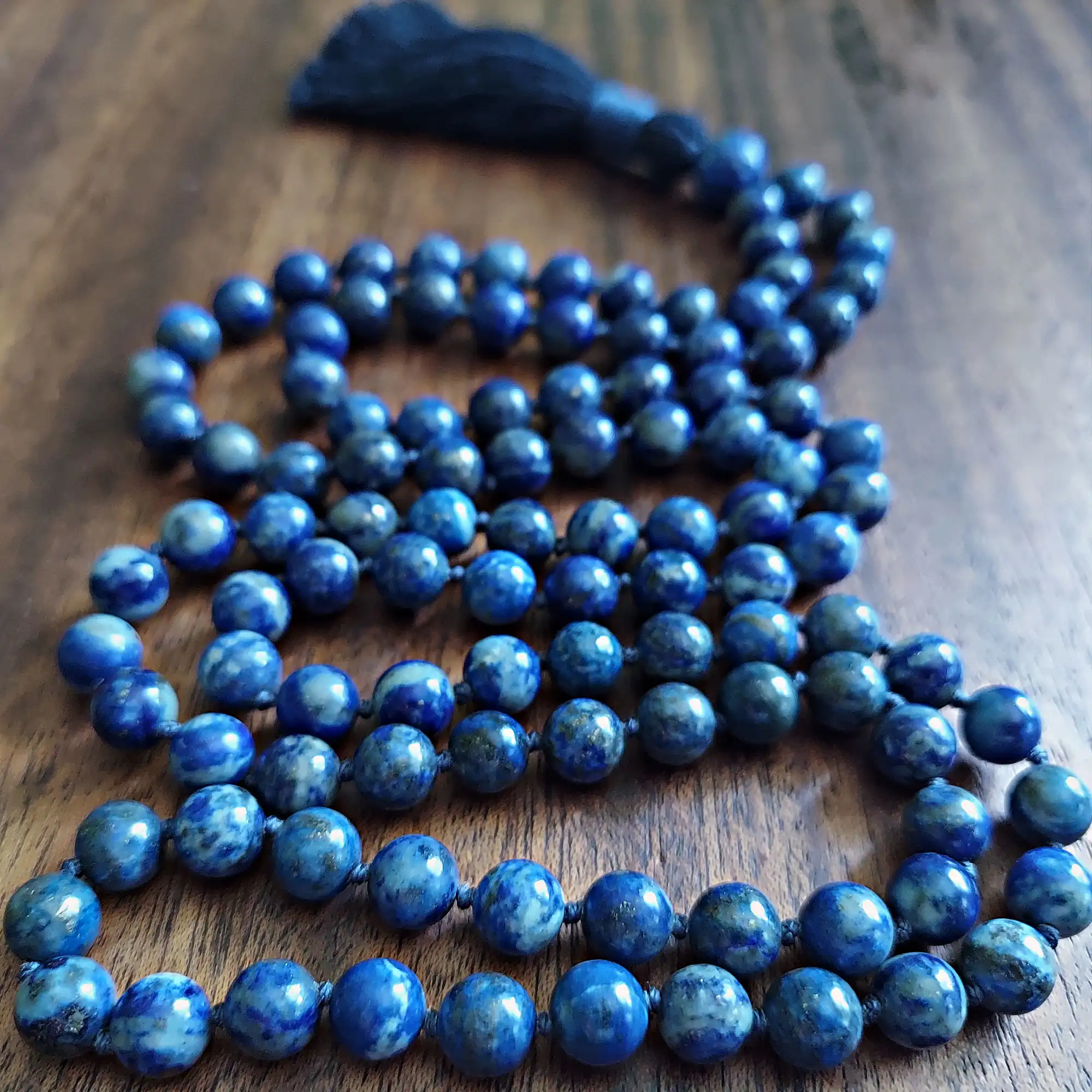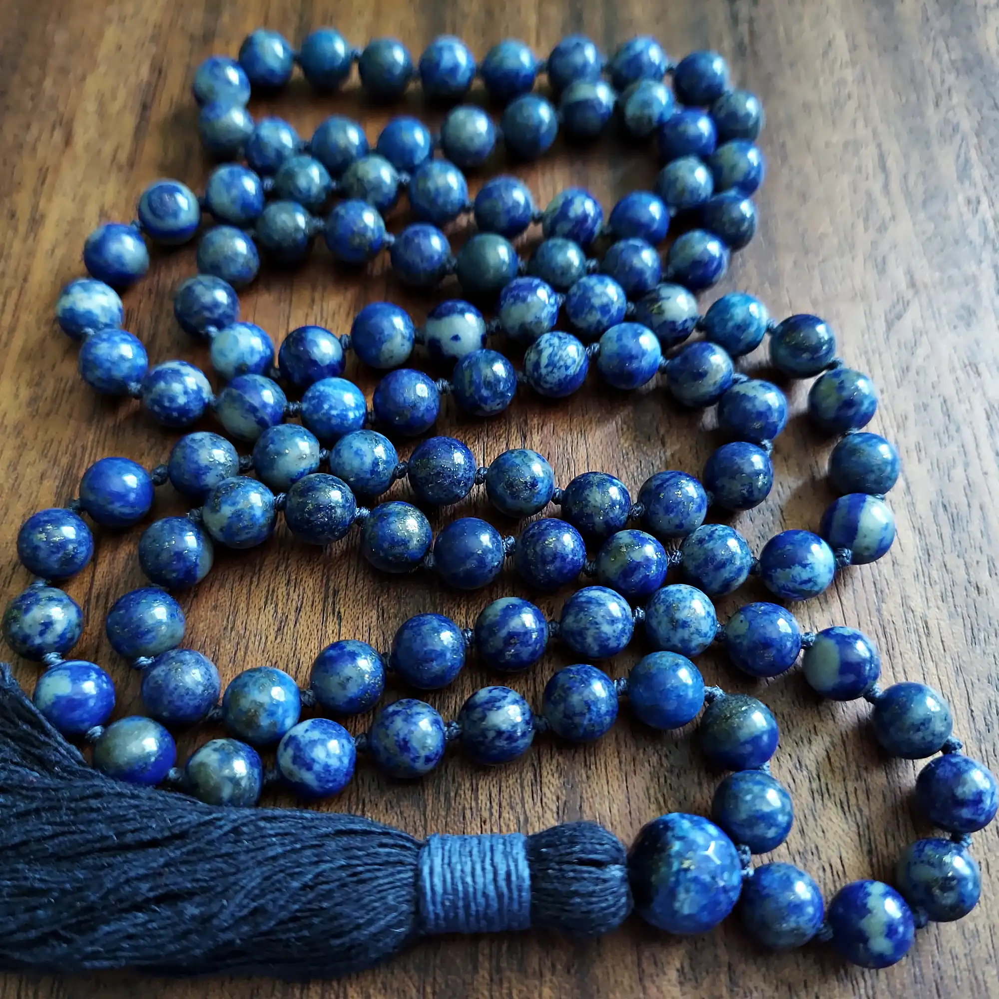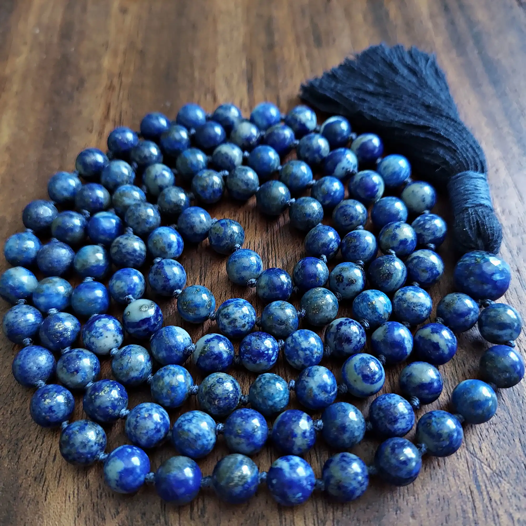 Your mala beads will include a cotton tassel and nylon cord for knots, which, unlike silk, does not rot, stretch, or fray. Cotton & nylon are far superior for something we handle and wear daily.
