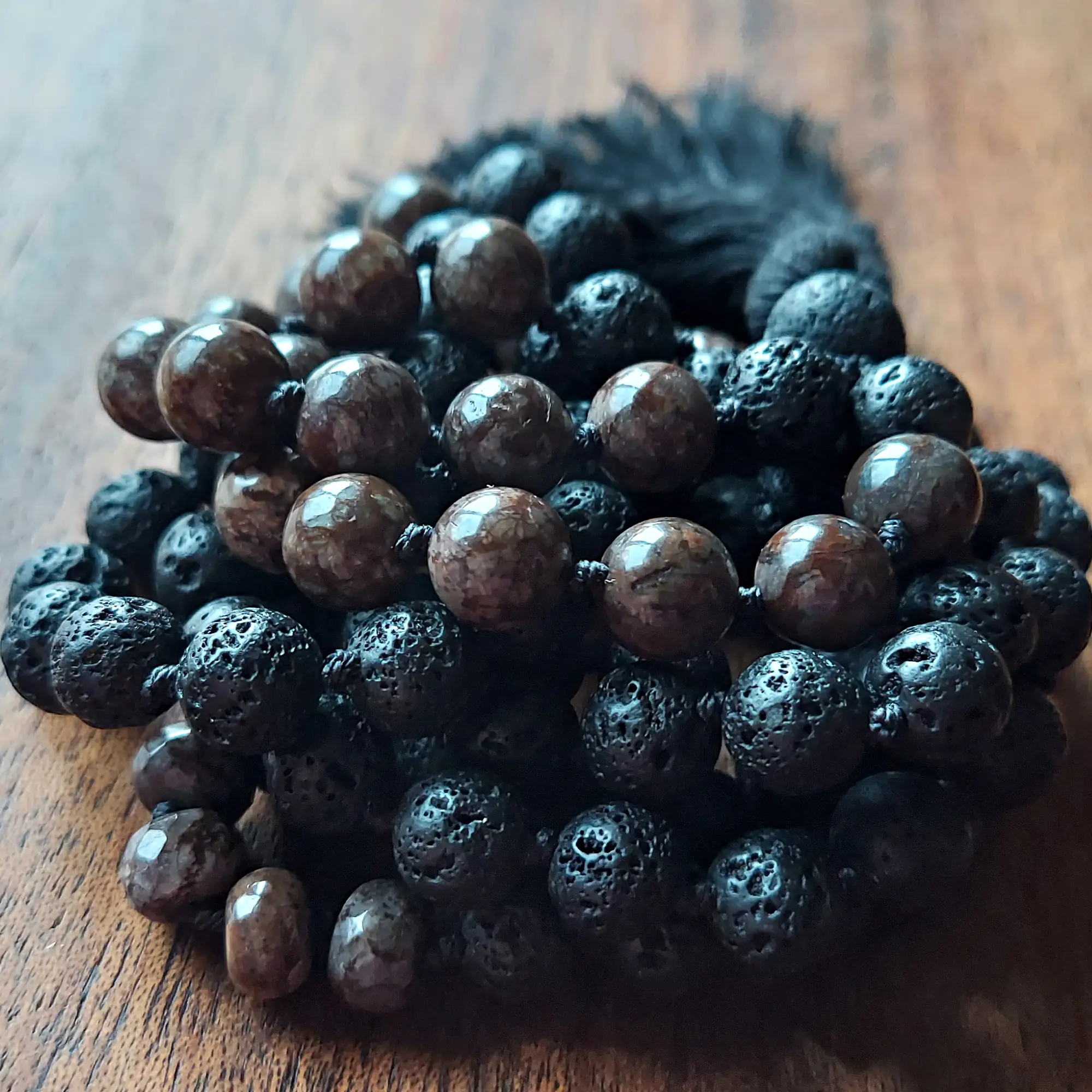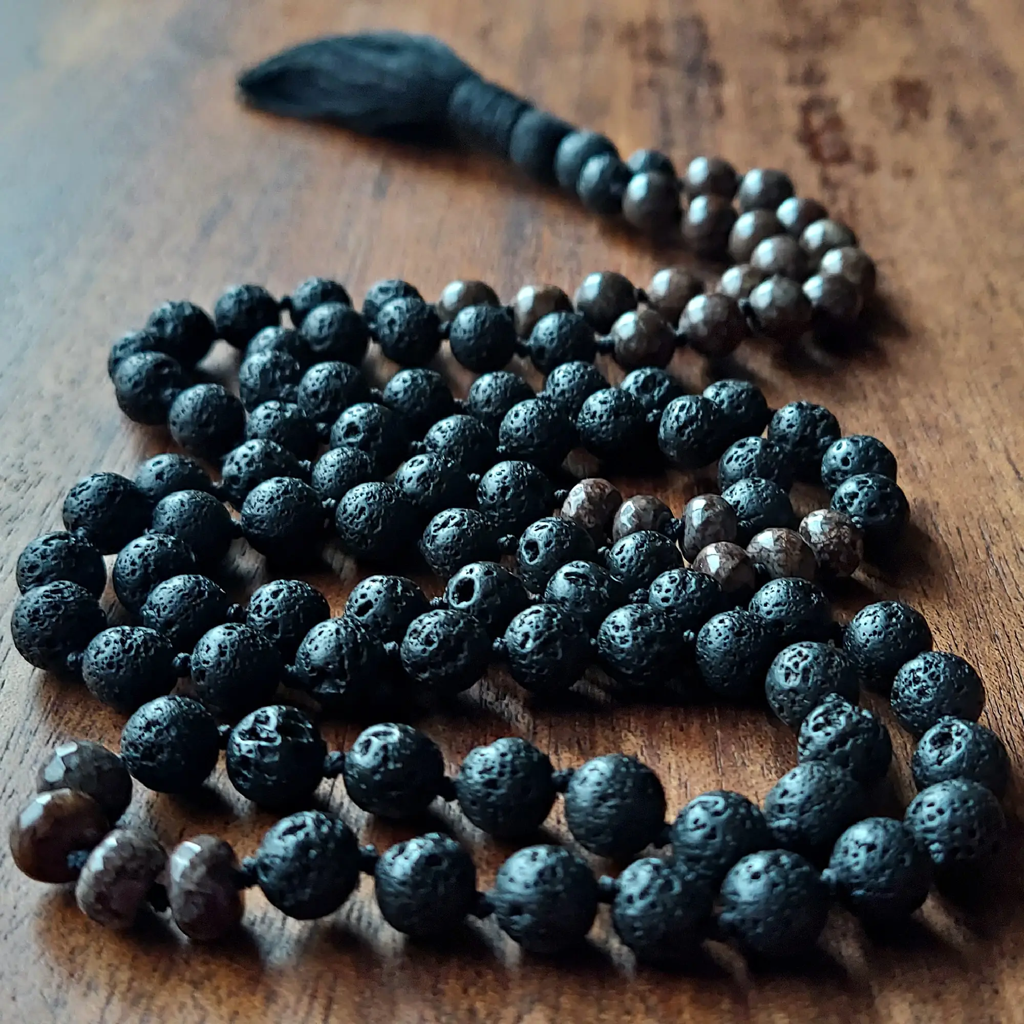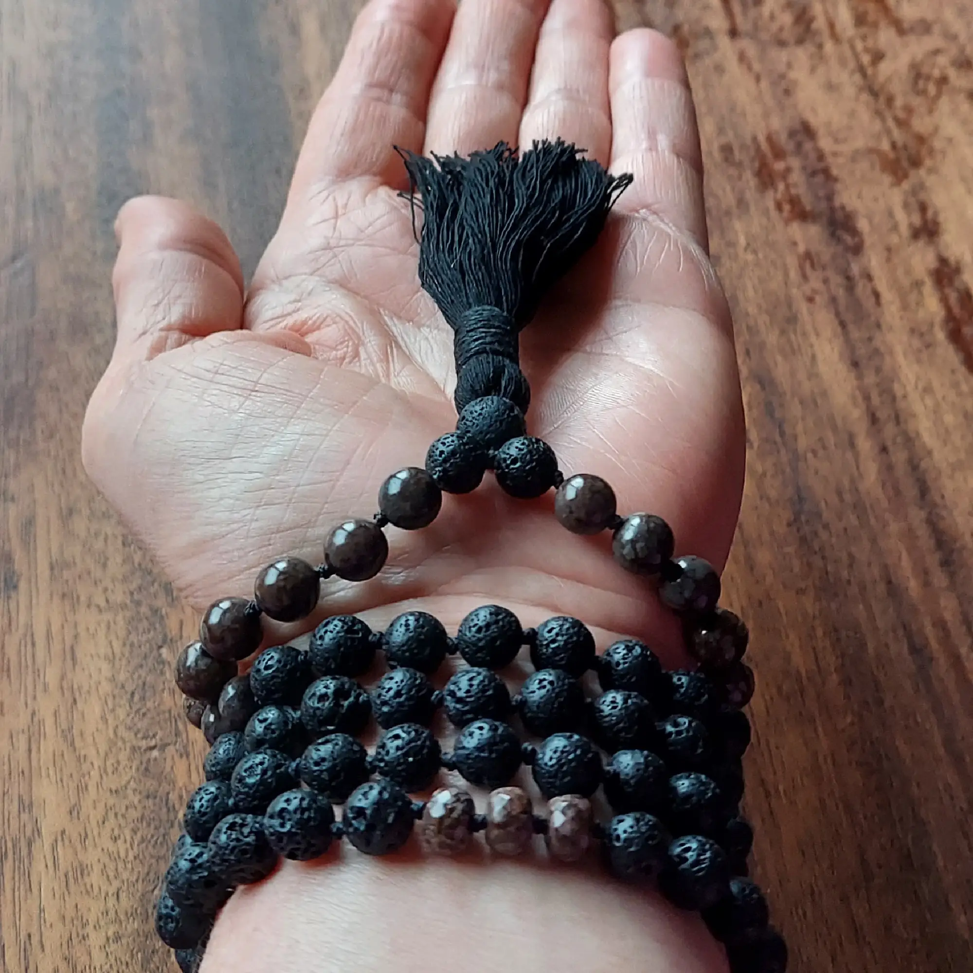 This rich and earthy Lava Stone and Obsidian mala resonates with the Root Chakra, protecting and strengthening you and empowering your ability to grow and transform on your path.