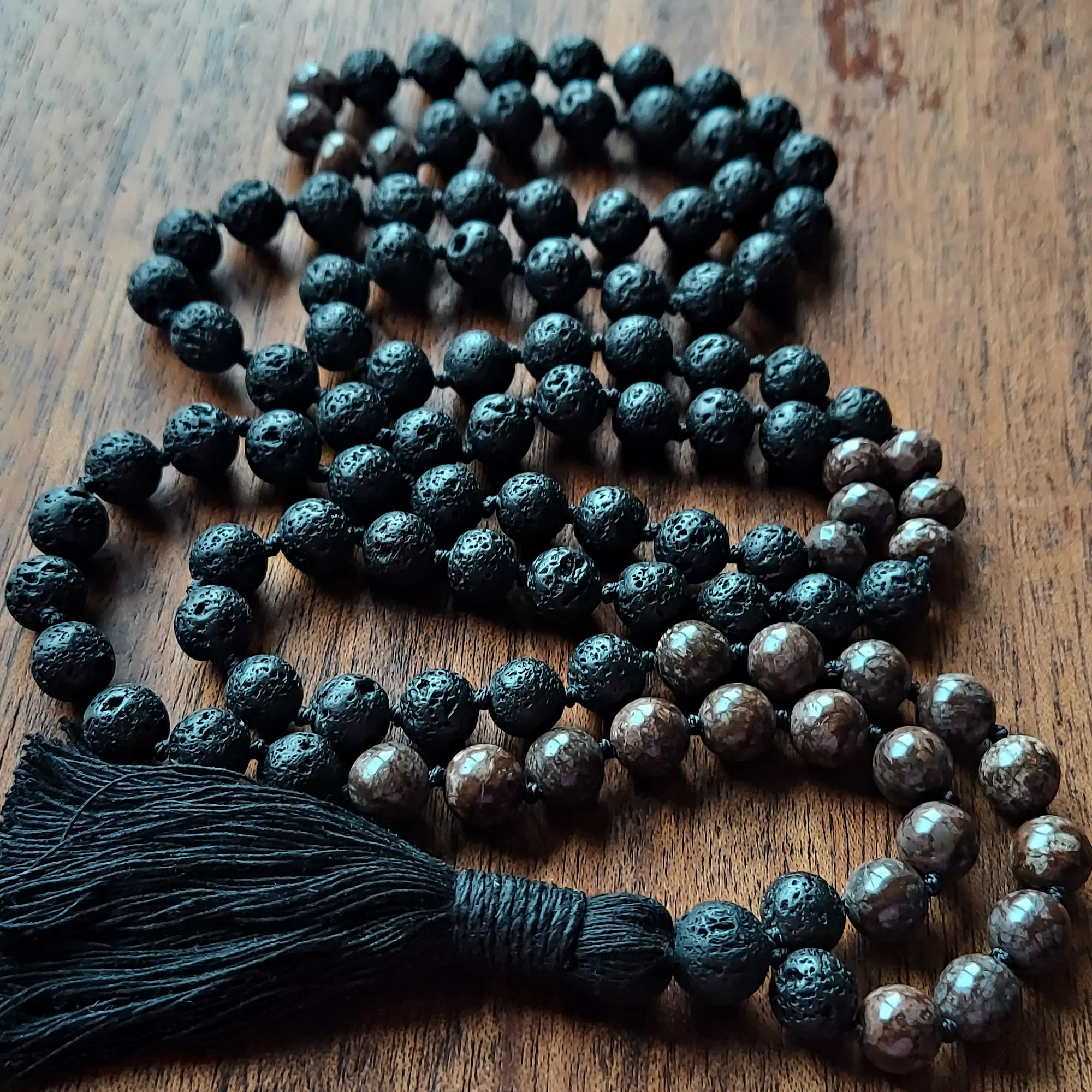 Your mala beads will include a cotton tassel and nylon cord for knots, which, unlike silk, does not rot, stretch, or fray. Cotton & nylon are far superior for something we handle and wear daily.