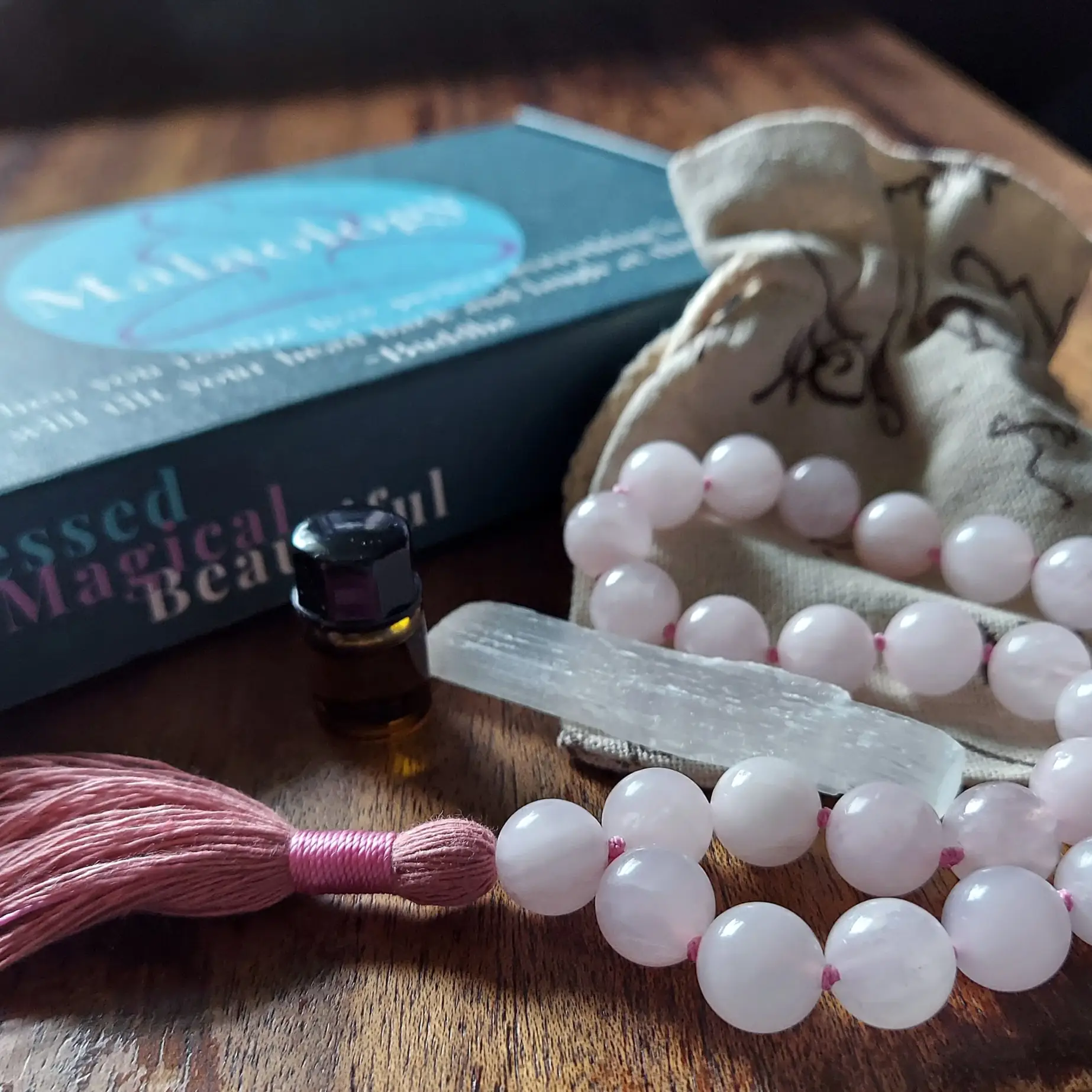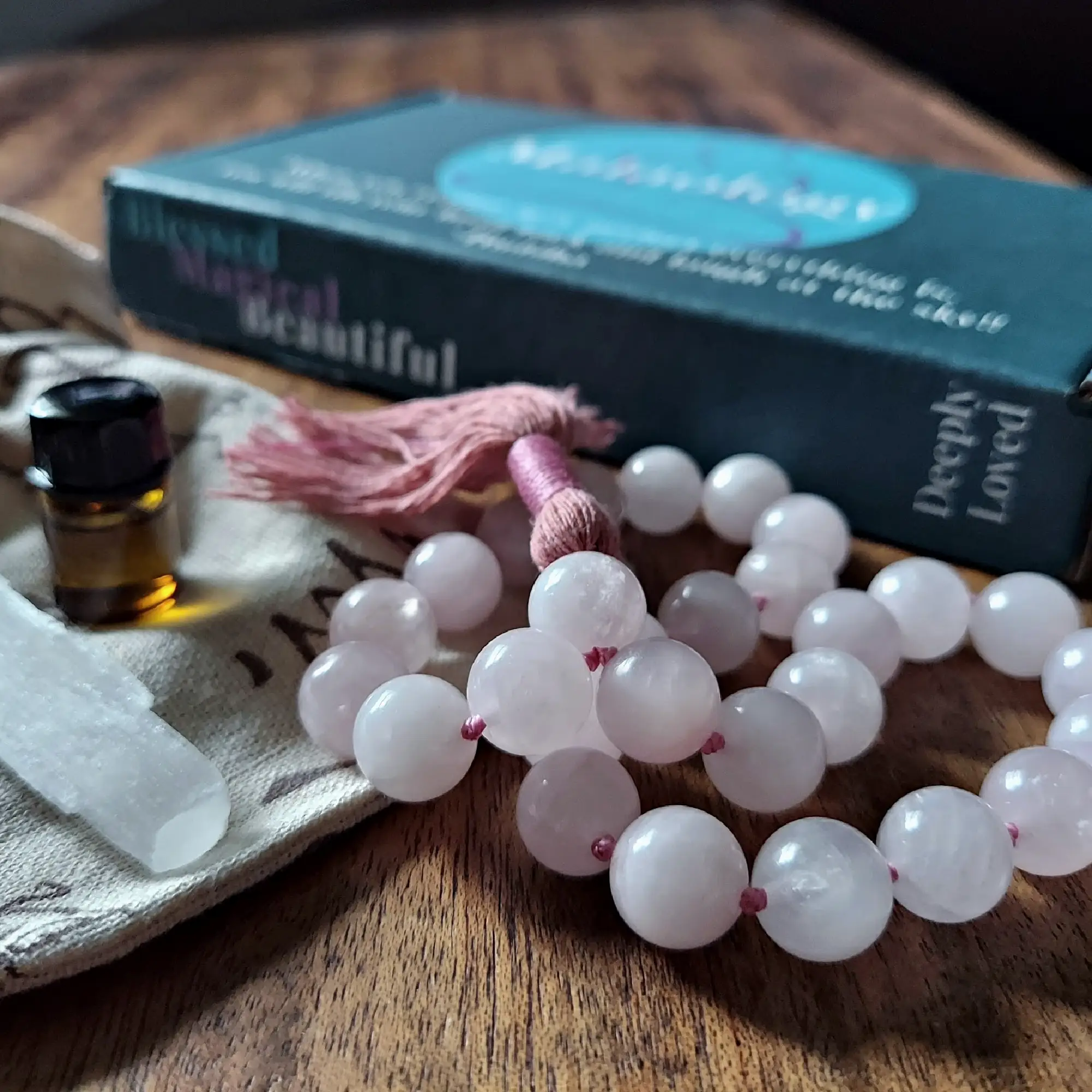 This beautiful 💗 Love and Light Pocket Mala Set ☀️📿 features Rose Quartz Beads (12mm), presented in a gift box that includes everything needed to begin a mala meditation practice.