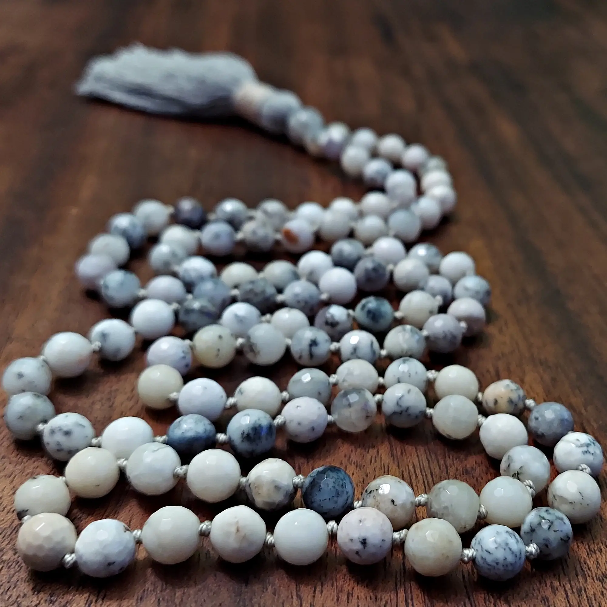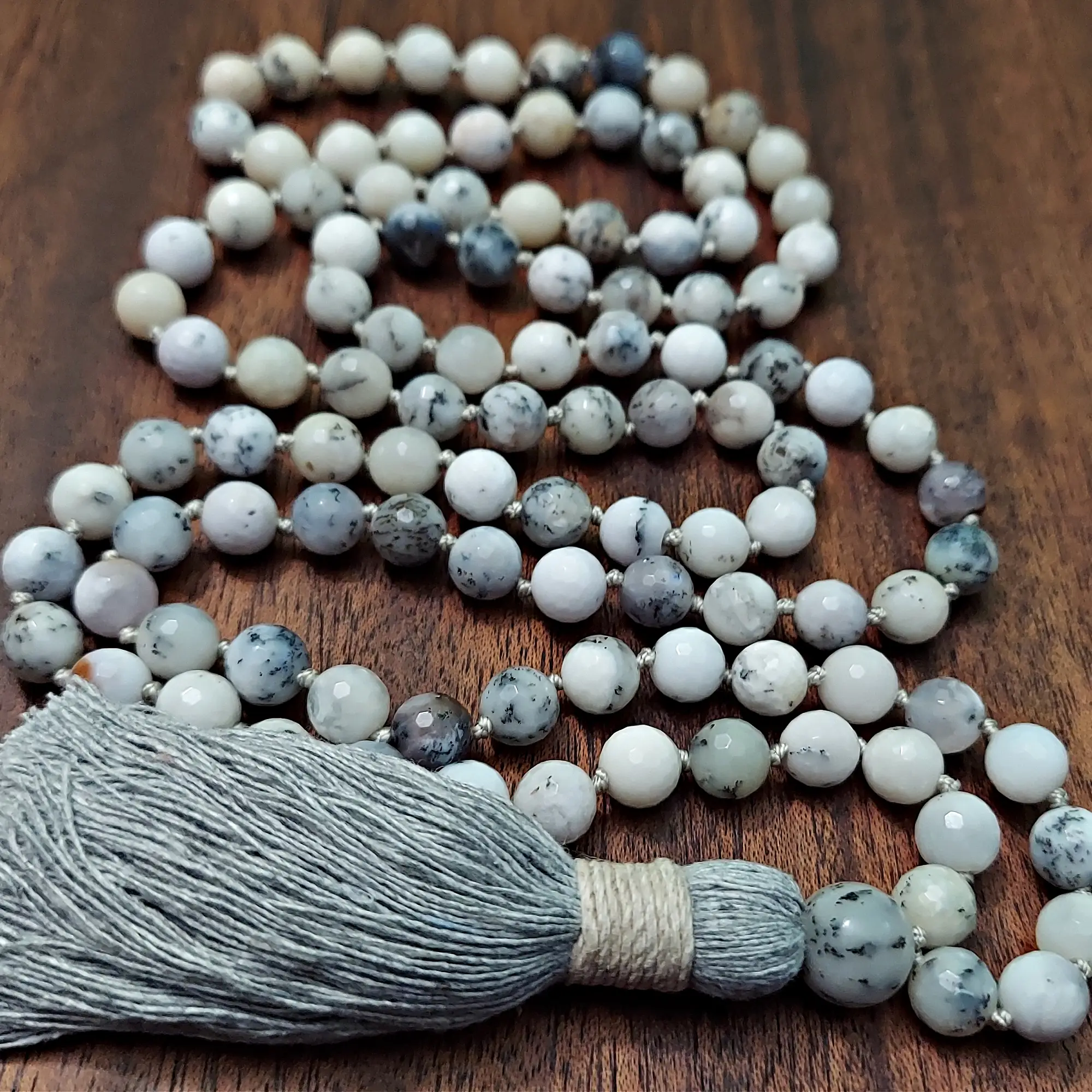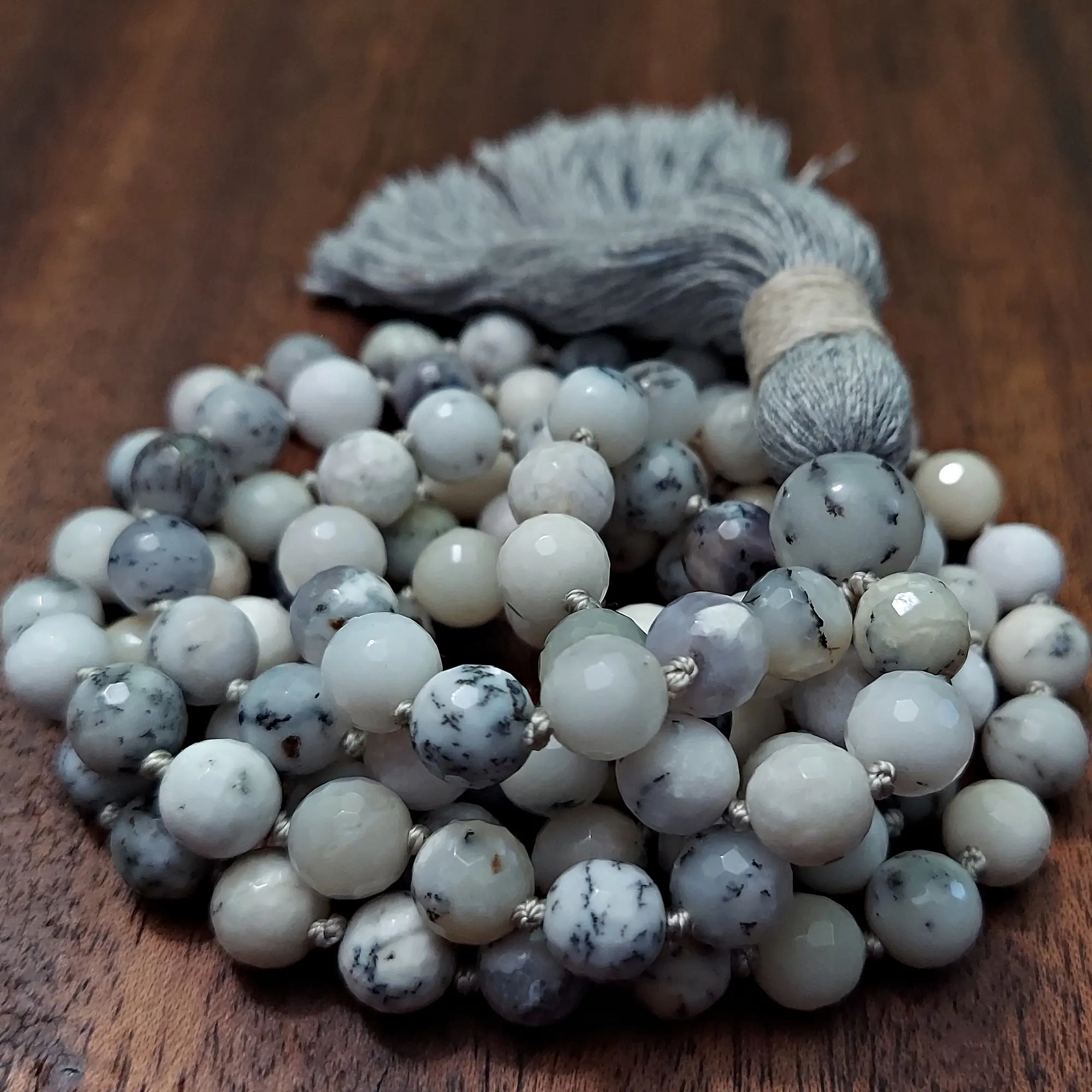 Your mala beads will include a cotton tassel and nylon cord for knots, which, unlike silk, does not rot, stretch, or fray. Cotton & nylon are far superior for something we handle and wear daily.
