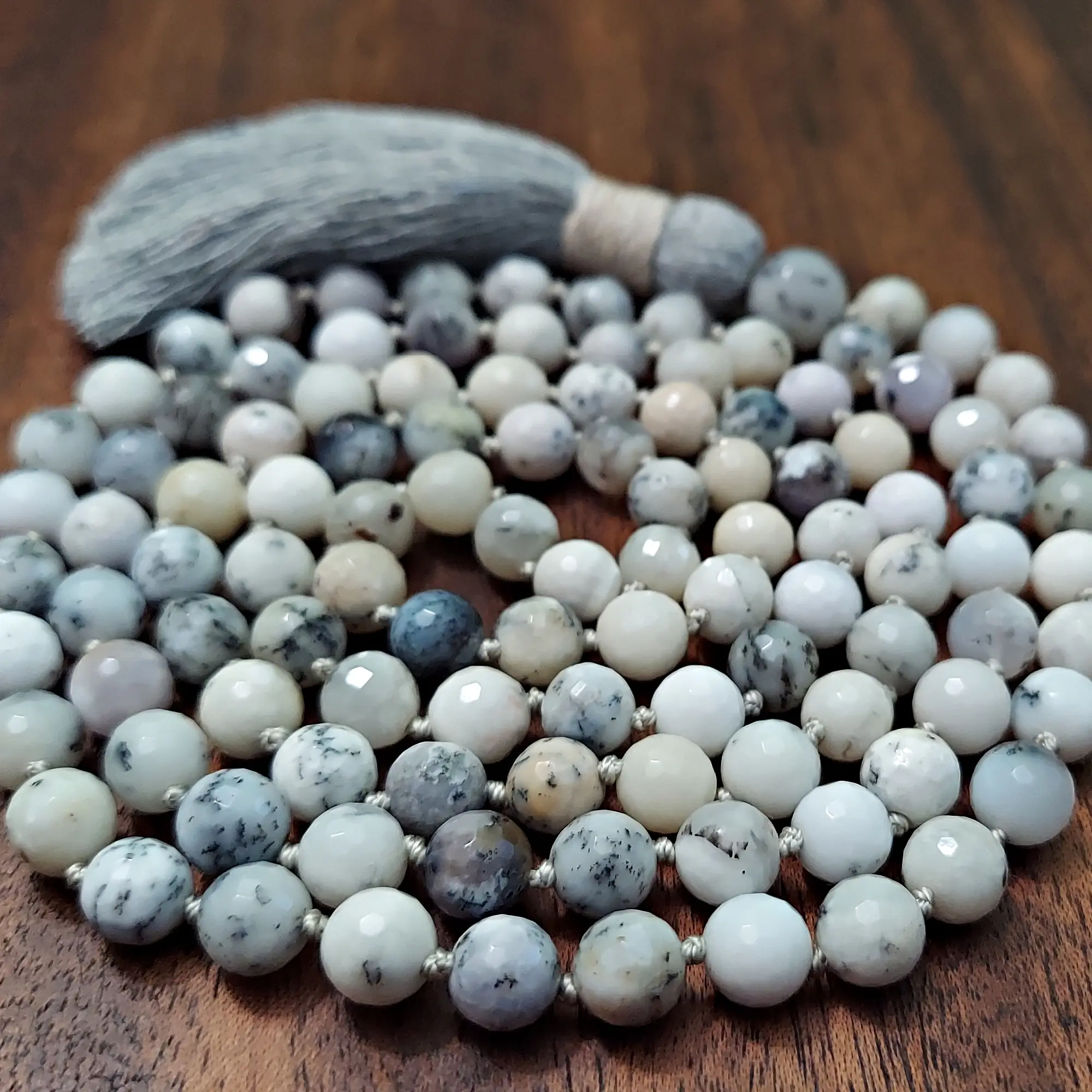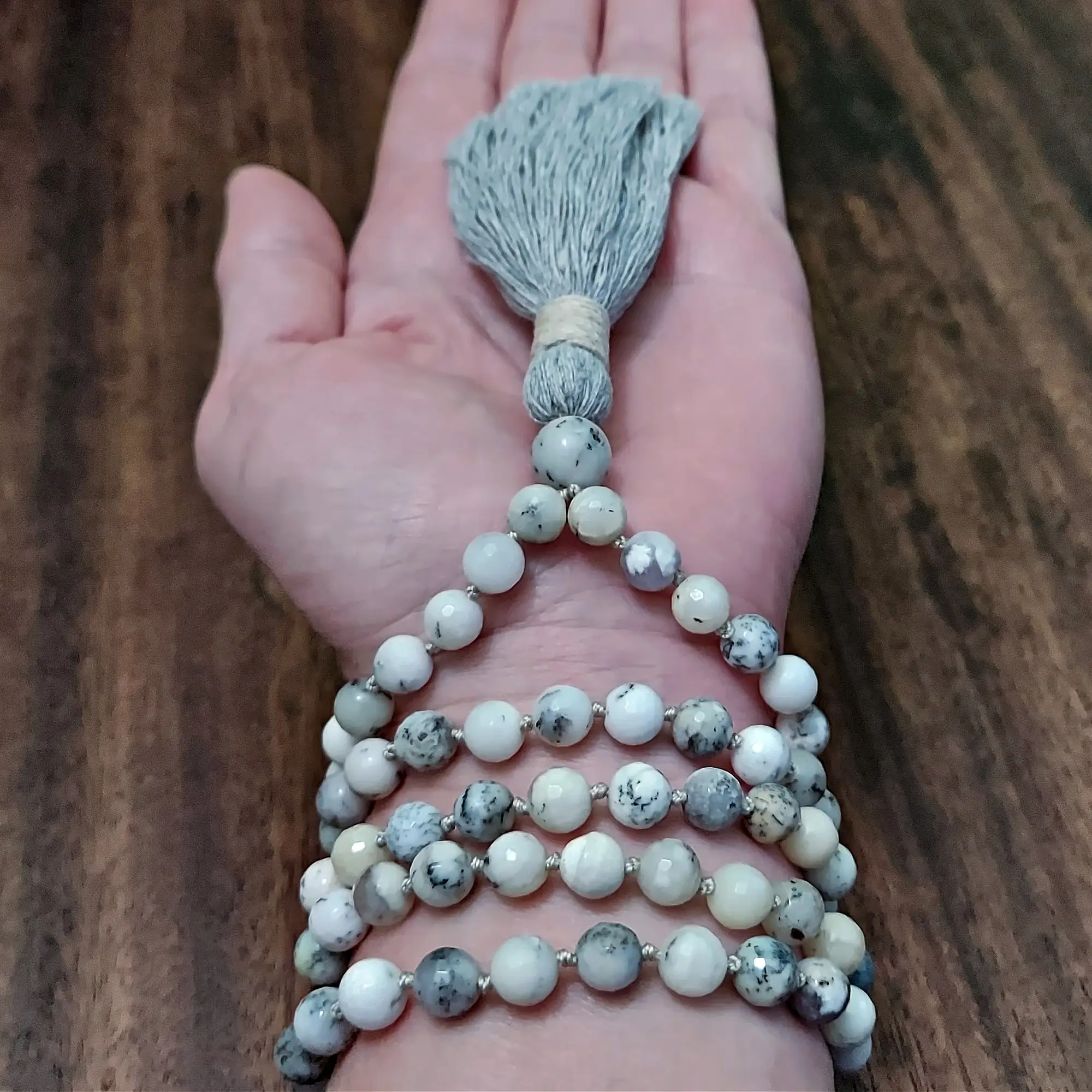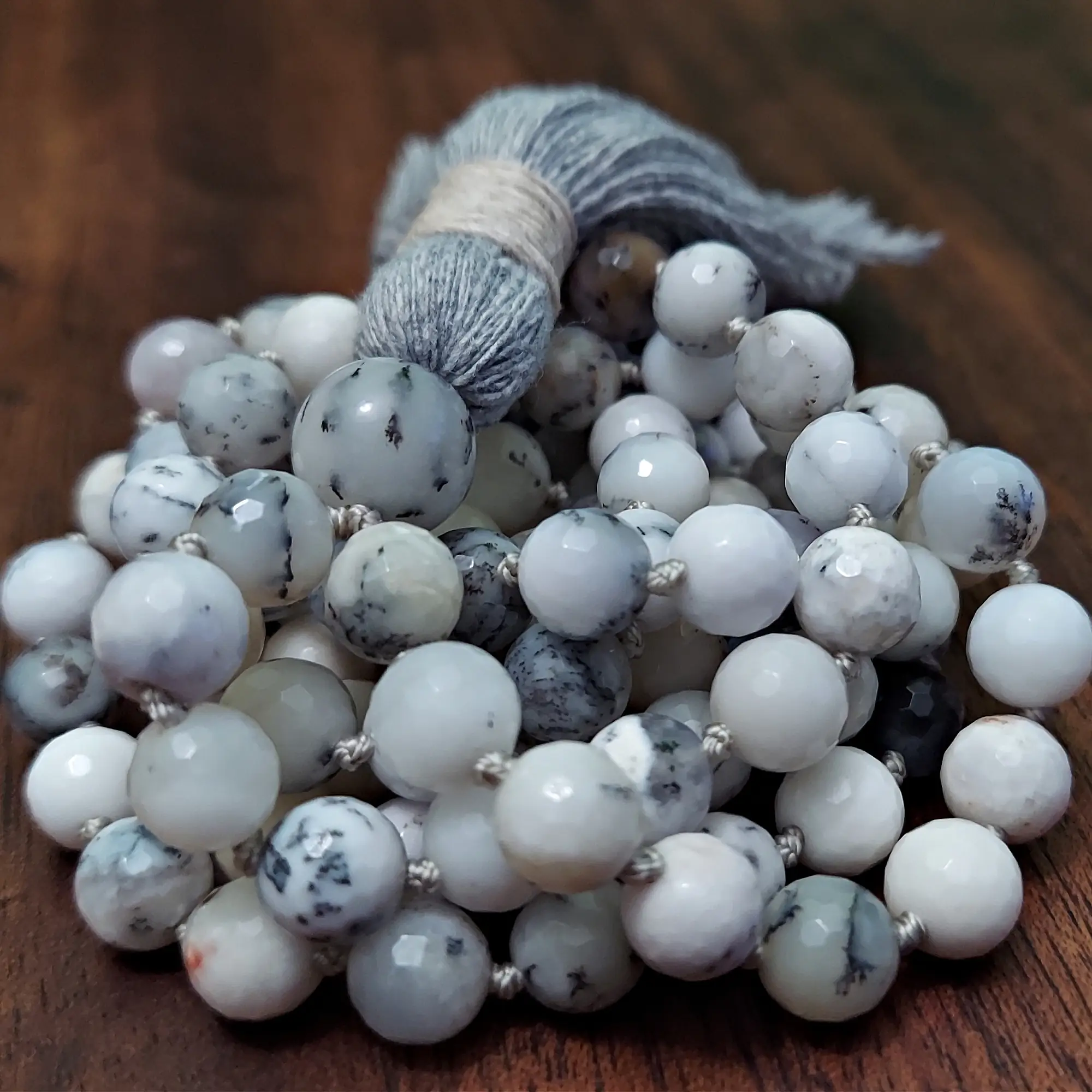 Your mala beads will include a cotton tassel and nylon cord for knots, which, unlike silk, does not rot, stretch, or fray. Cotton & nylon are far superior for something we handle and wear daily.