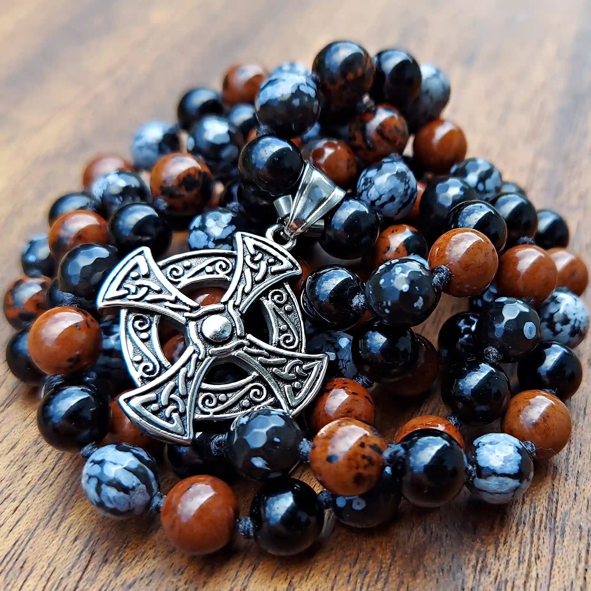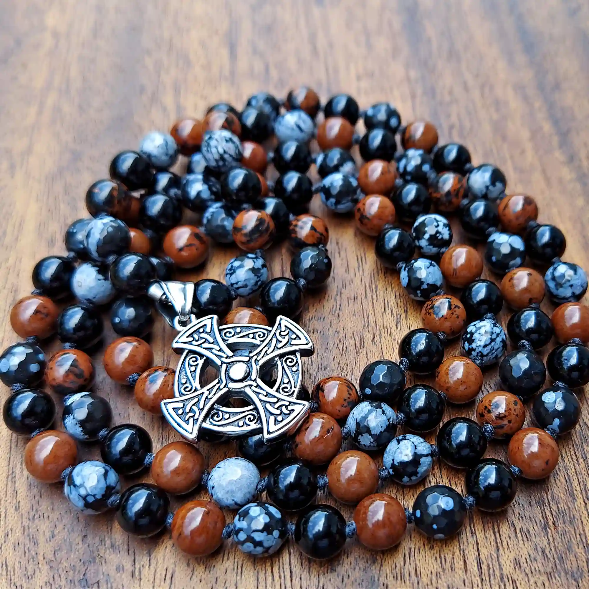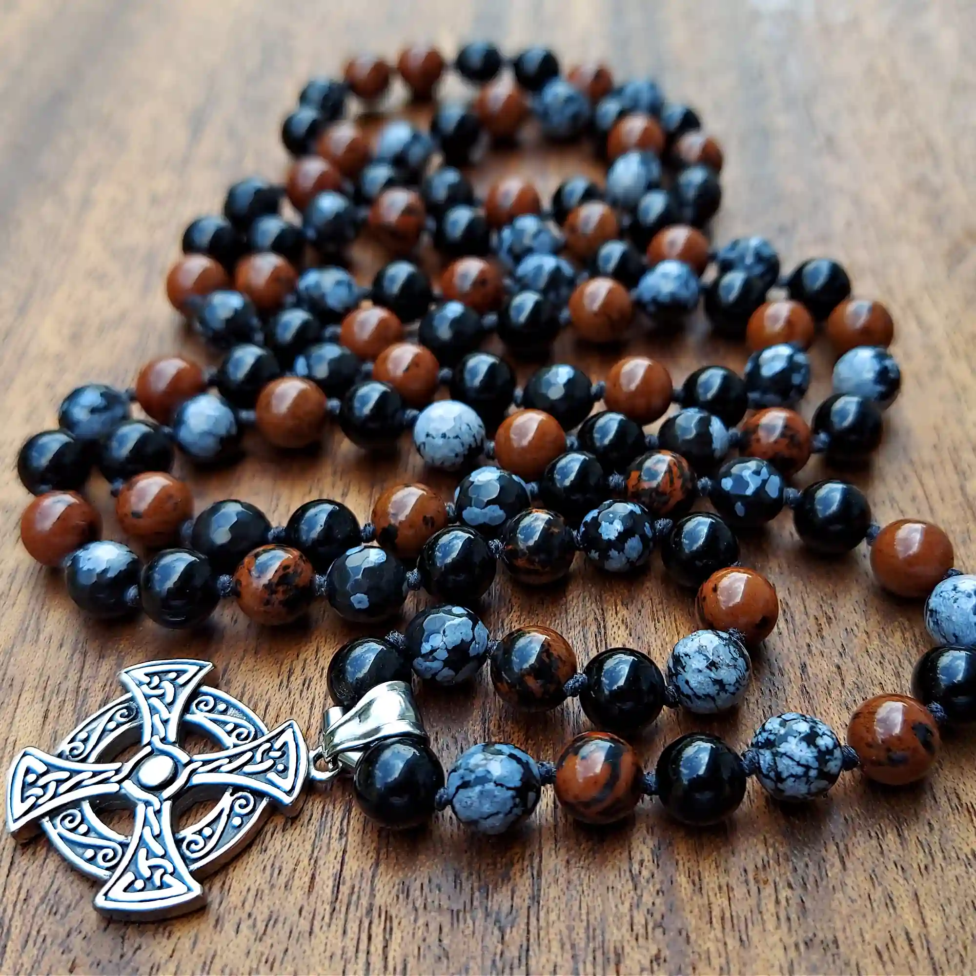 This gorgeous Celtic Cross Black Obsidian, Snowflake Obsidian, & Mahogany Obsidian Mala Necklace supports the Root Chakra and fosters a deeply grounding and strong shielding energy.