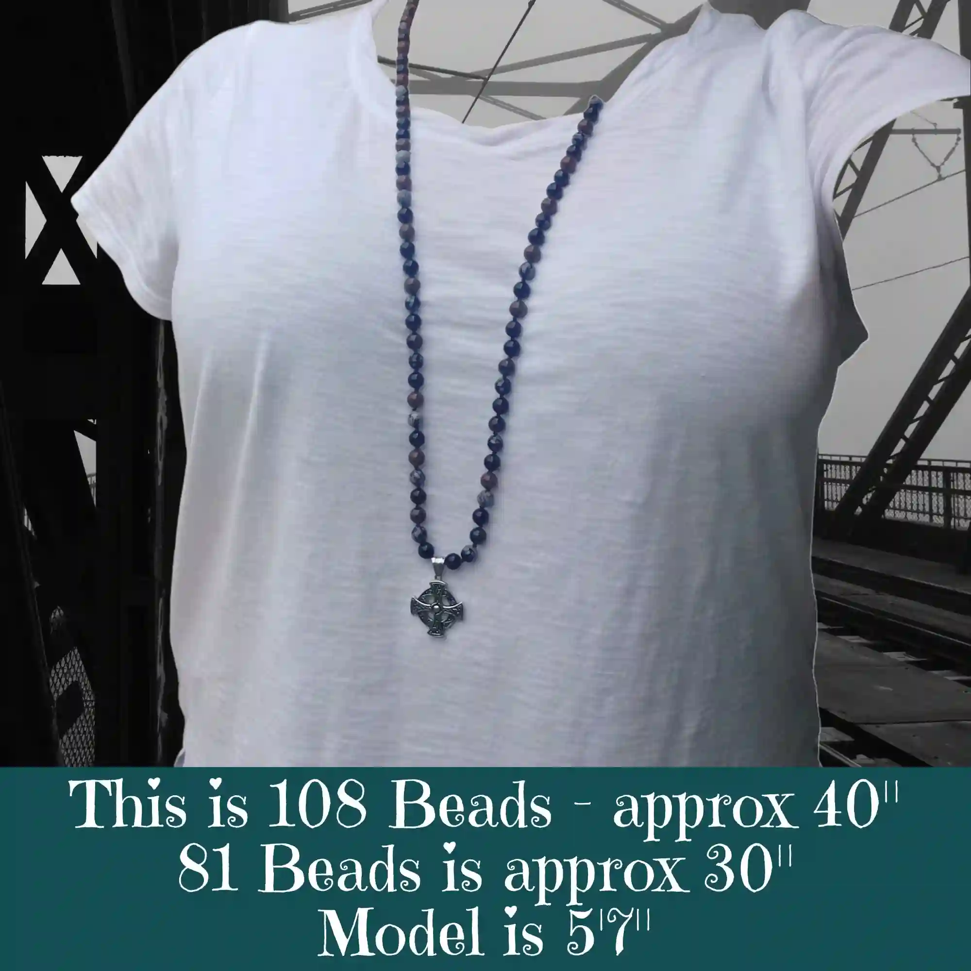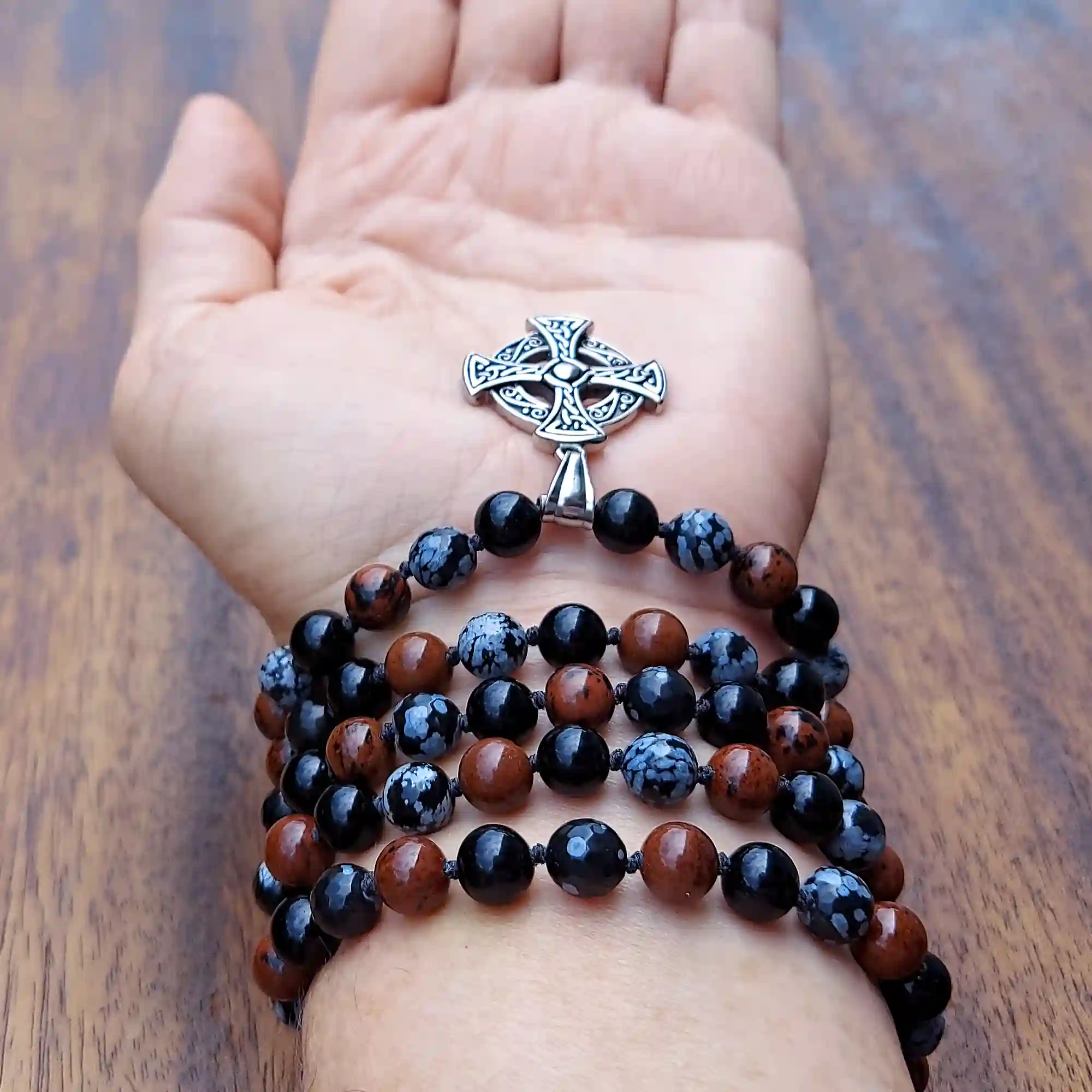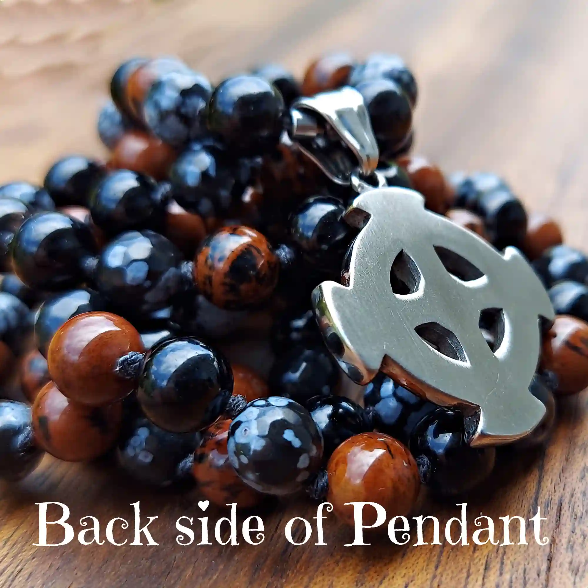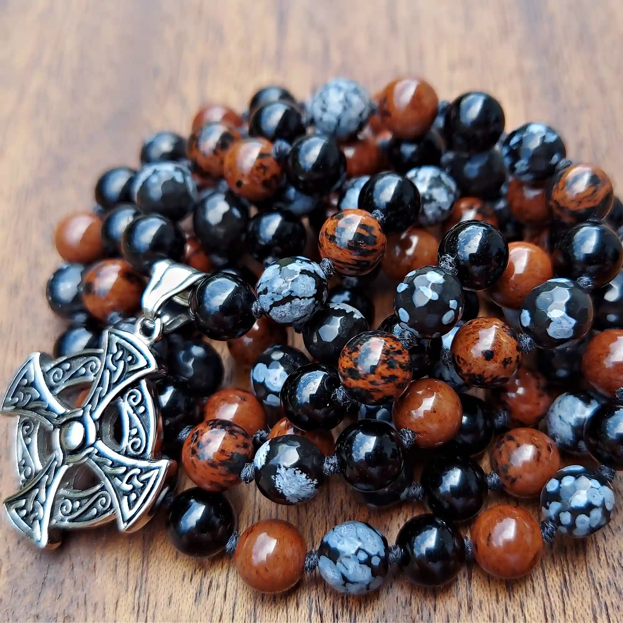 This gorgeous Celtic Cross Black Obsidian, Snowflake Obsidian, & Mahogany Obsidian Mala Necklace supports the Root Chakra and fosters a deeply grounding and strong shielding energy.