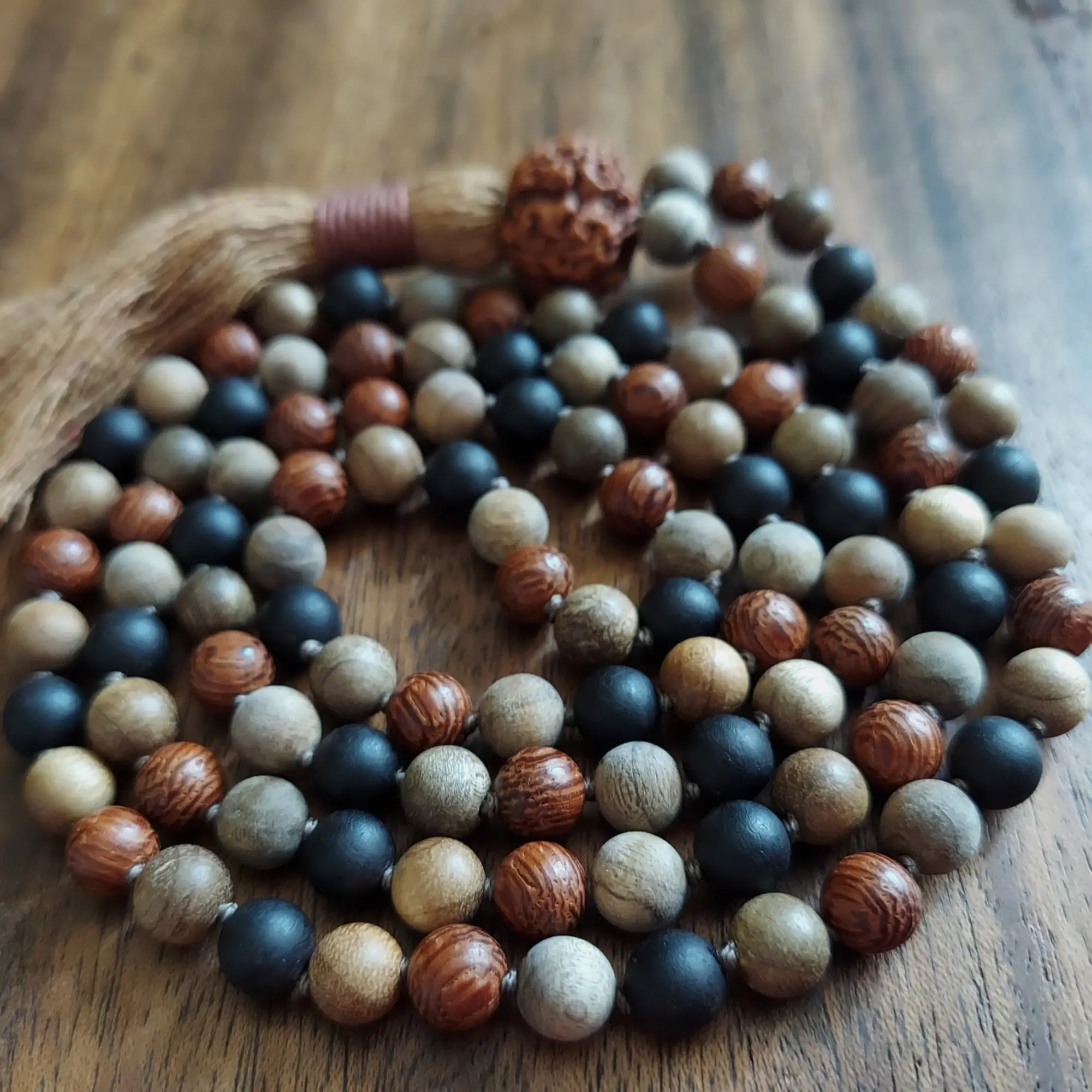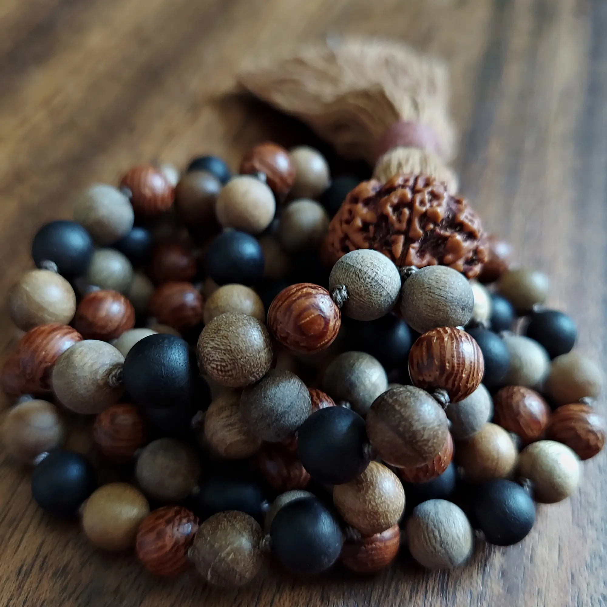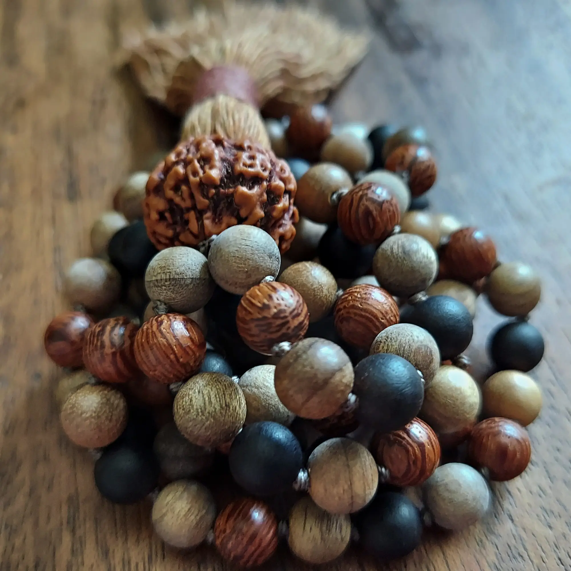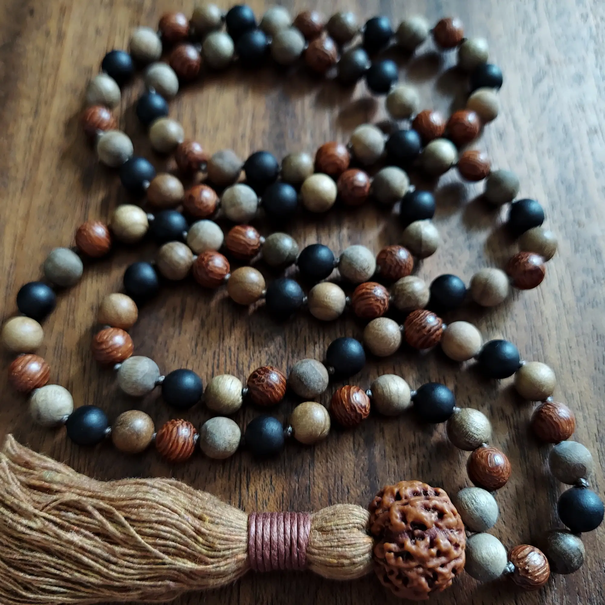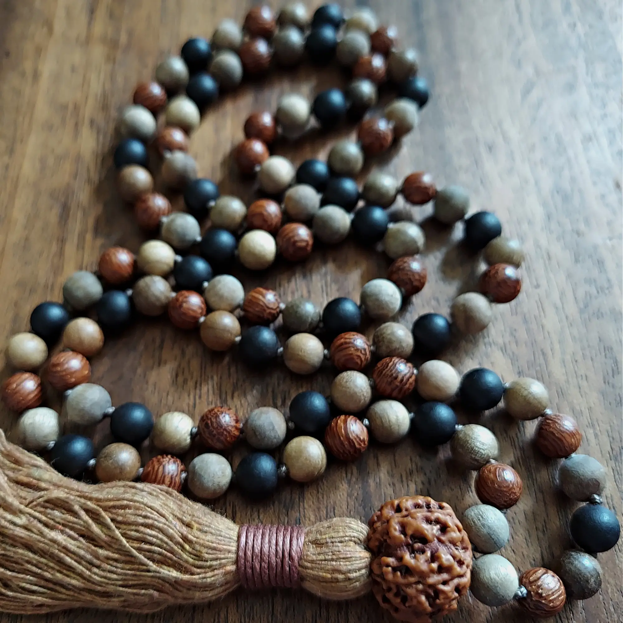 These mala beads are made of Sandalwood, Ebony Wood, Camphor Wood, Dragon’s Blood Wood, and a Large Rudraksha Seed Guru Bead.