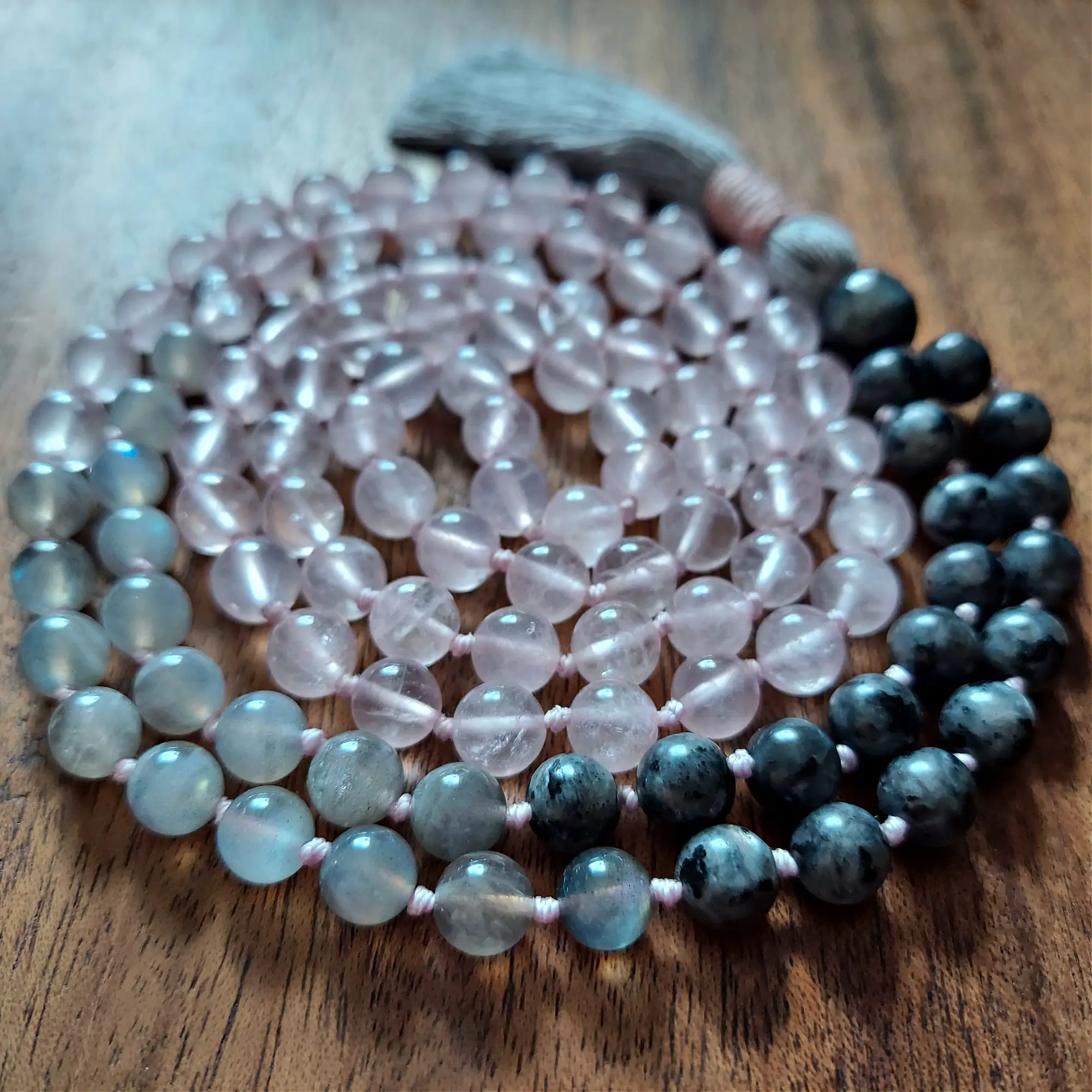 Together, these gemstones create a mala that radiates mystical wisdom and tender self-love. Use it in meditation, ritual, or daily wear to stay connected to your intuition while embracing the beauty of an open heart.
