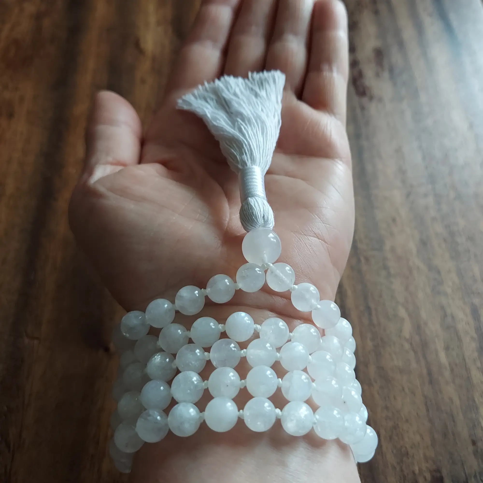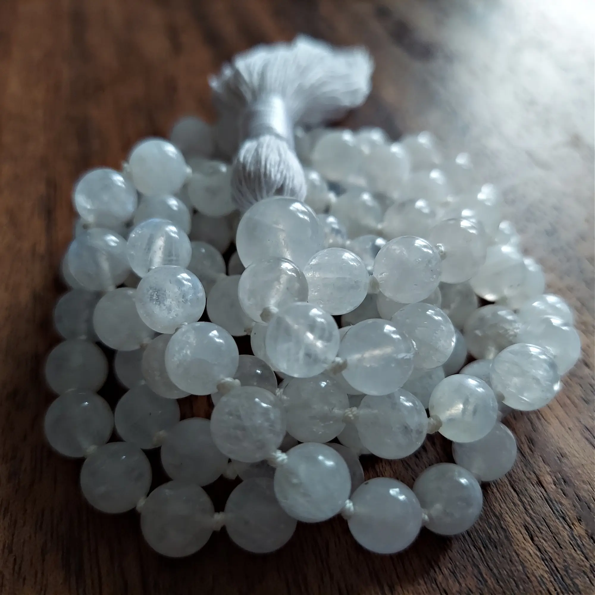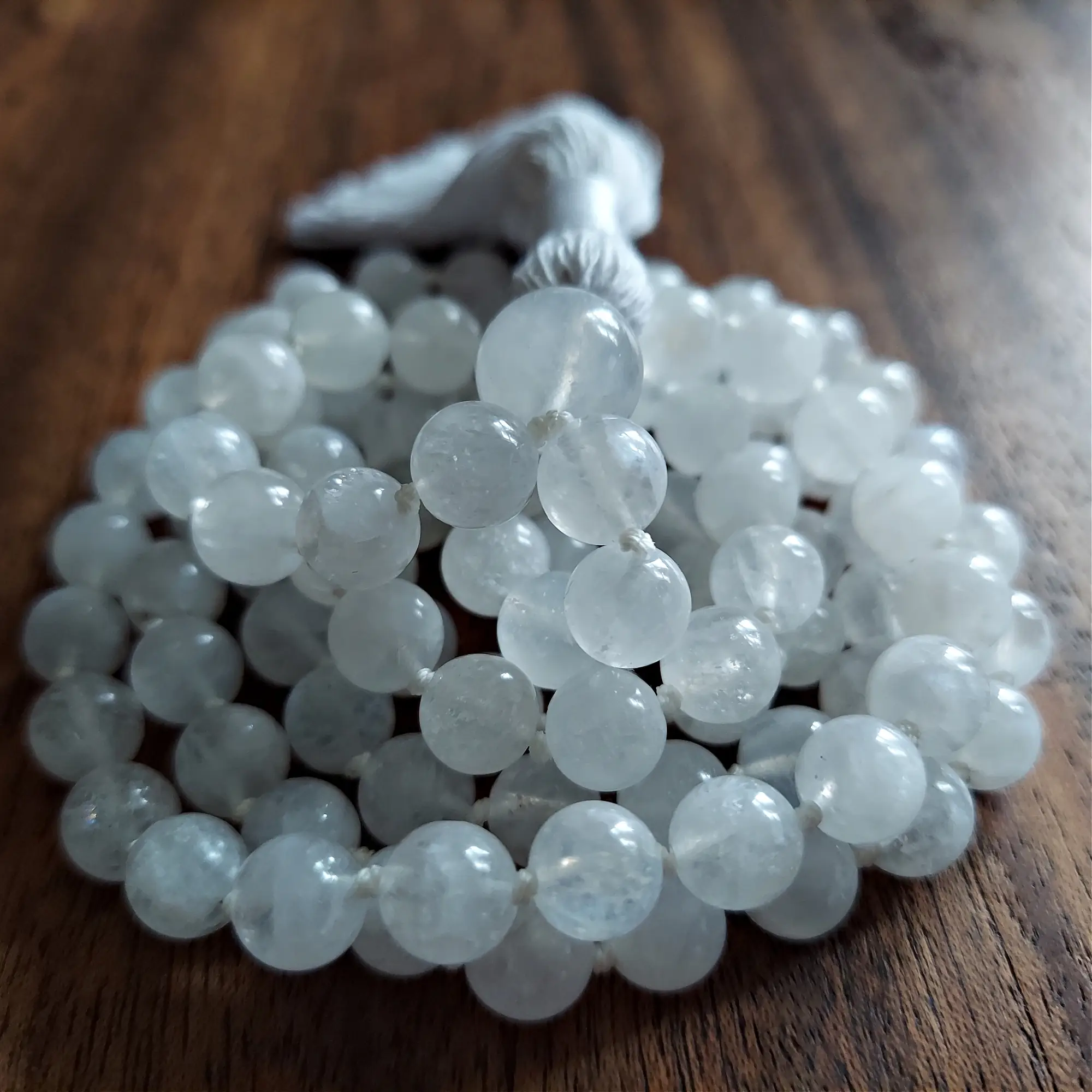Your mala beads will include a cotton tassel and nylon cord for knots, which, unlike silk, does not rot, stretch, or fray. Cotton & nylon are far superior for something we handle and wear daily.