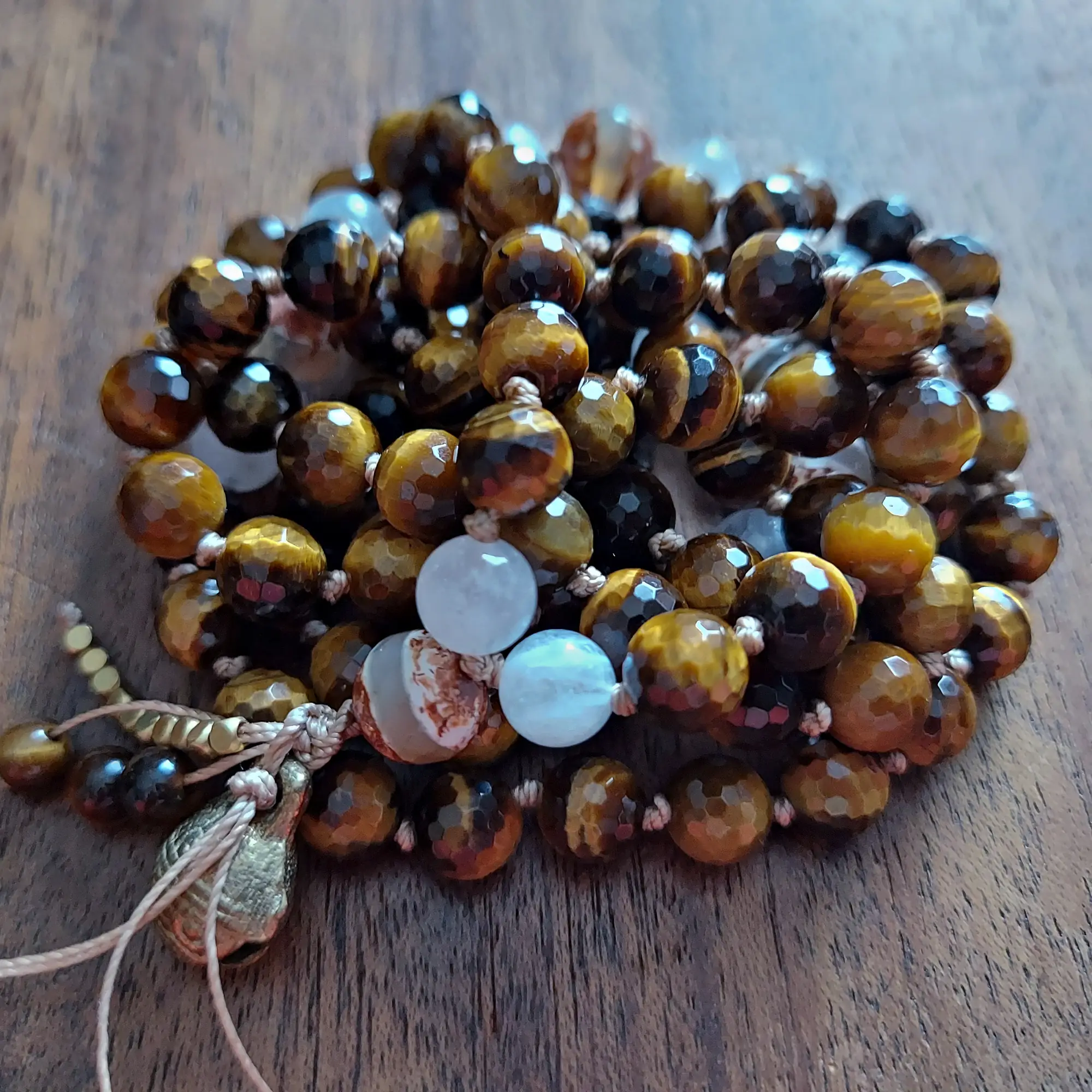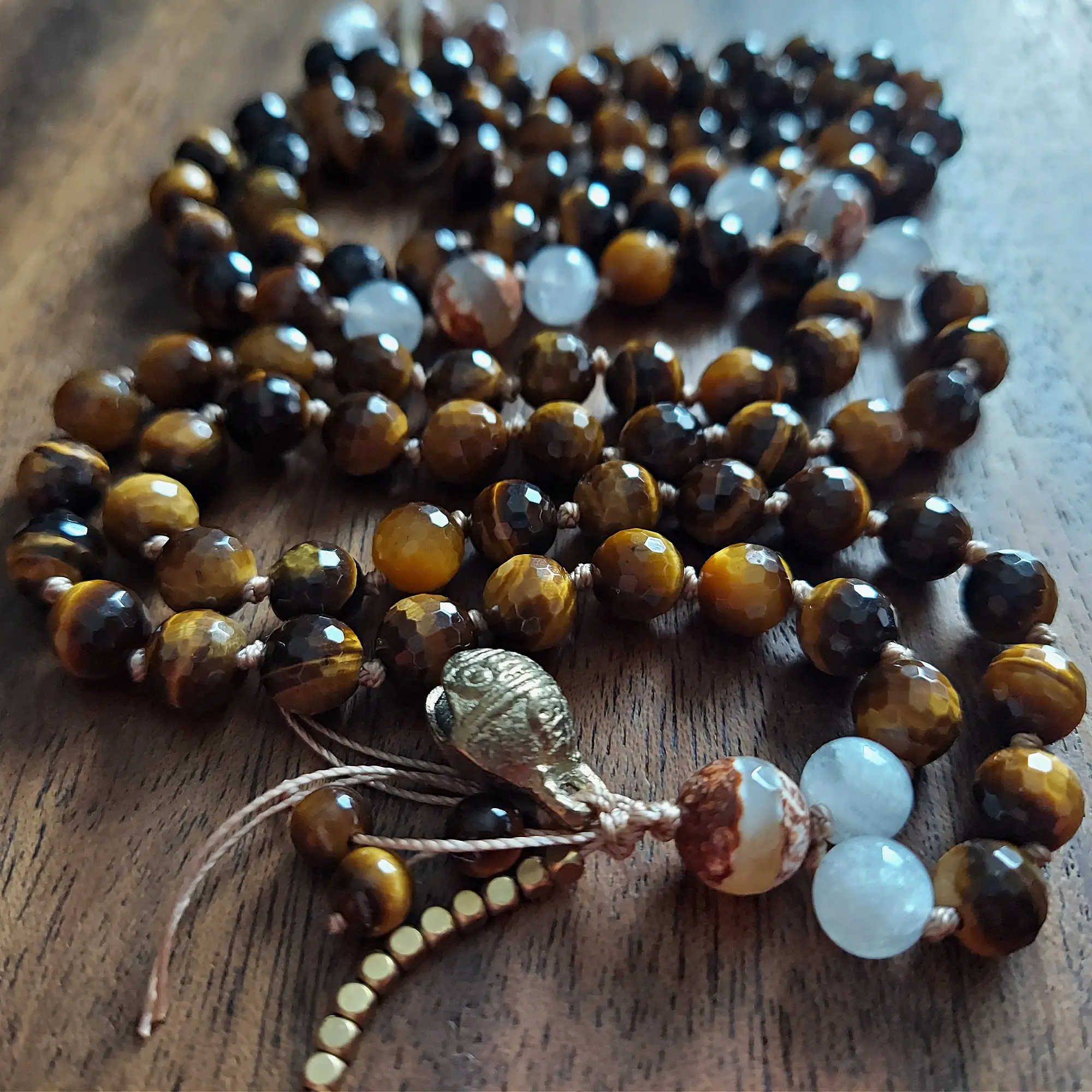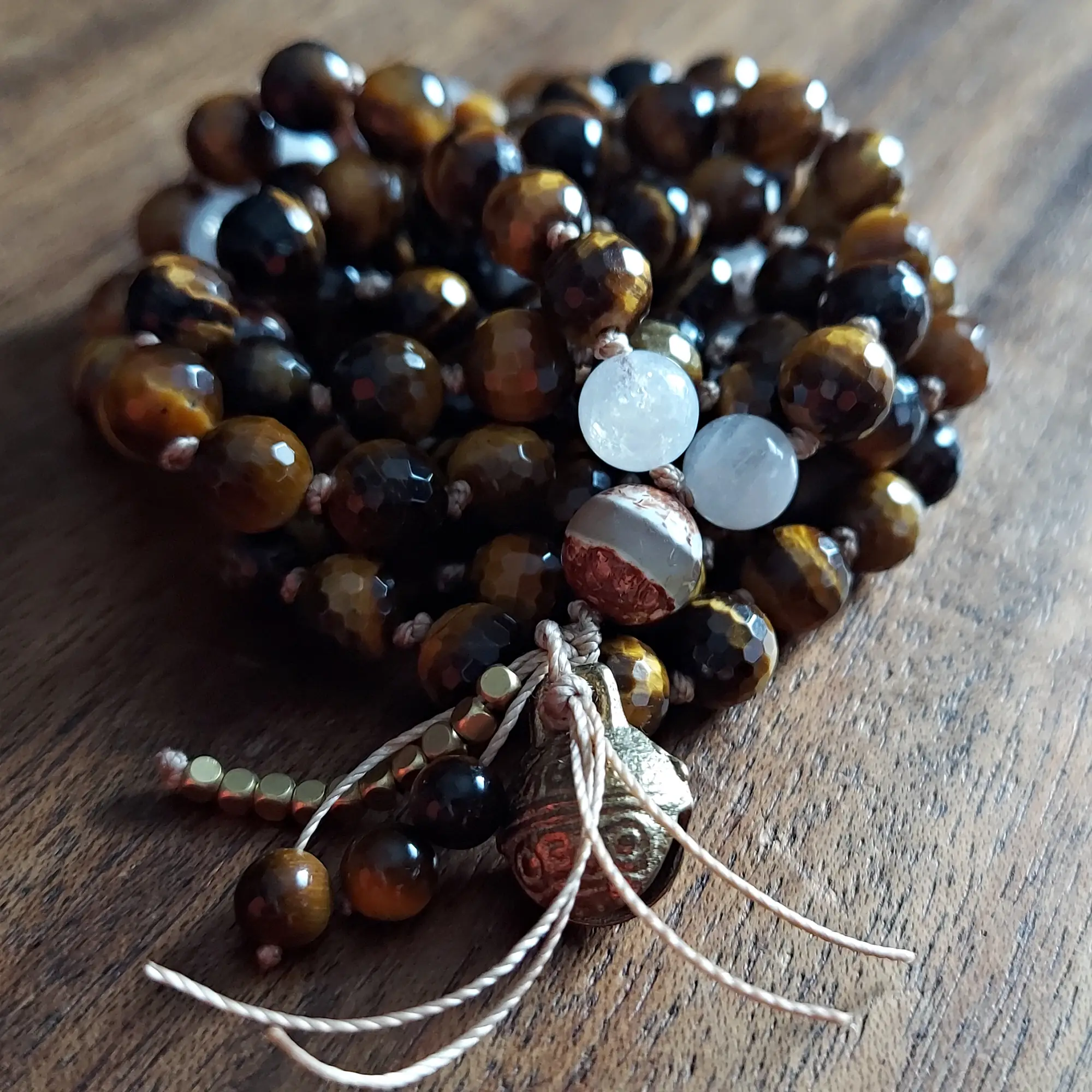 Awaken your inner strength and enhance your spiritual journey with this stunning Mystic Harmony Mala, featuring high-grade AAA faceted Tiger’s Eye, luminous Moonstone, and unique Dzi Agate beads. This powerful combination serves as a talisman for clarity, courage, and emotional insight, offering protection and grounding on your path.