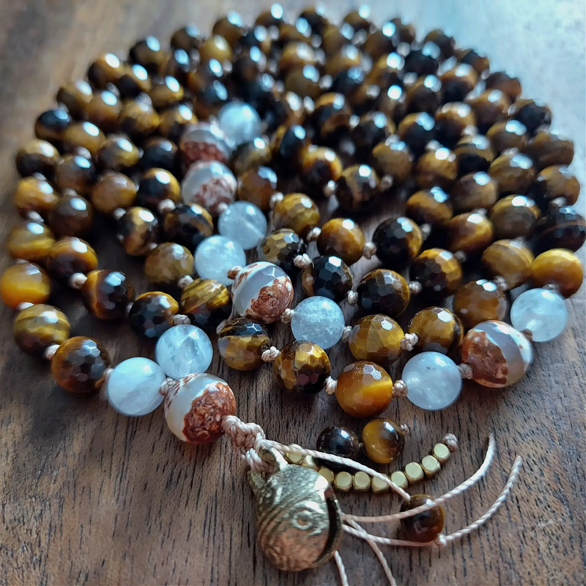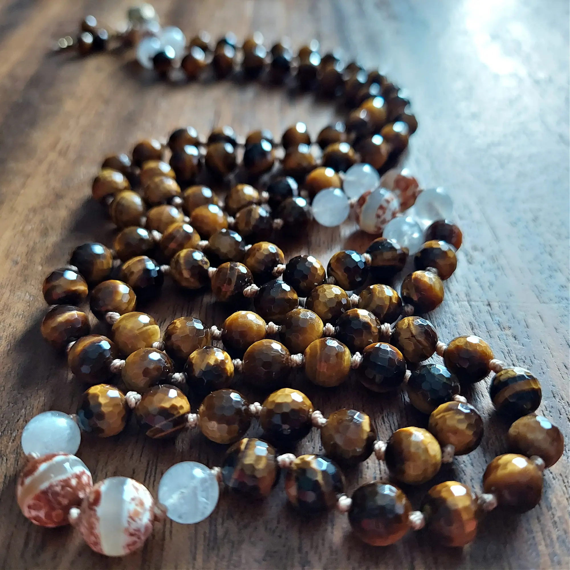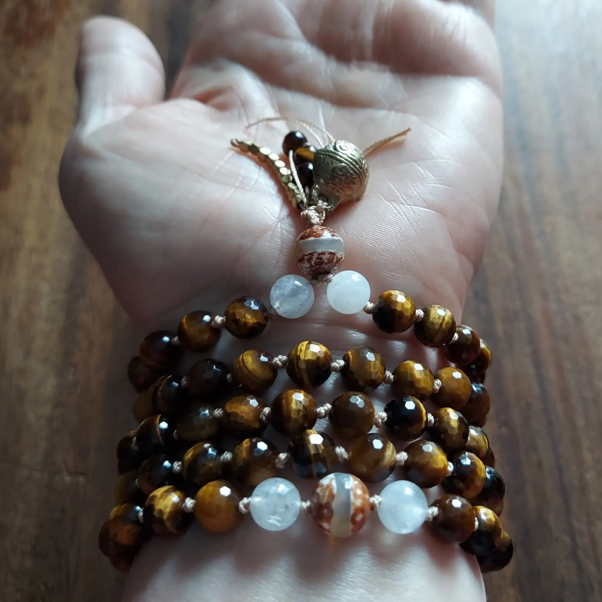 Awaken your inner strength and enhance your spiritual journey with this stunning Mystic Harmony Mala, featuring high-grade AAA faceted Tiger’s Eye, luminous Moonstone, and unique Dzi Agate beads. This powerful combination serves as a talisman for clarity, courage, and emotional insight, offering protection and grounding on your path.