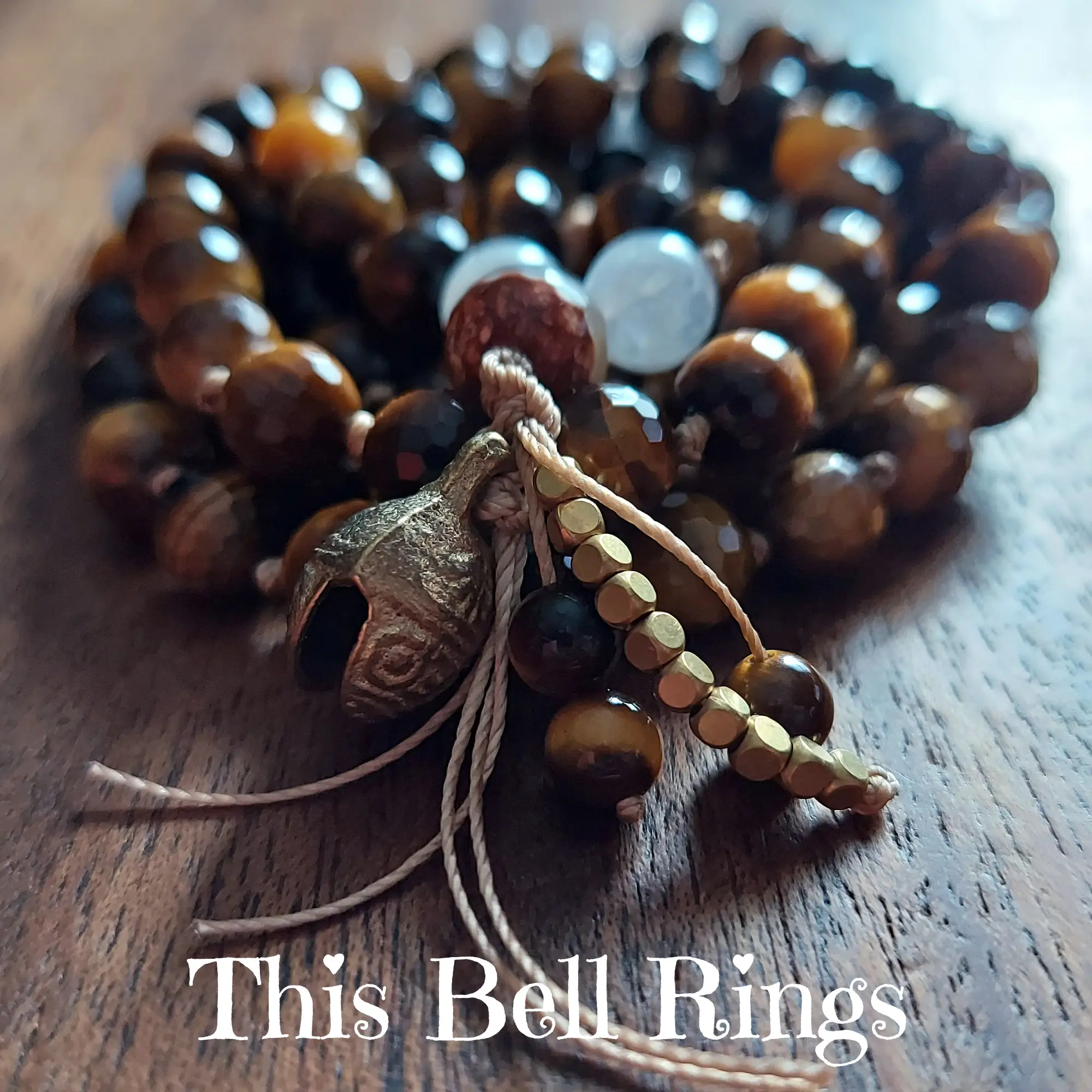 The Brass Bell Charm at the center of the mala adds a soulful chime, symbolizing spiritual awakening and mindfulness. The dragon tail tassel, adorned with smaller Brass and Tiger’s Eye beads, evokes movement and transformation, echoing the mythical power of the dragon.