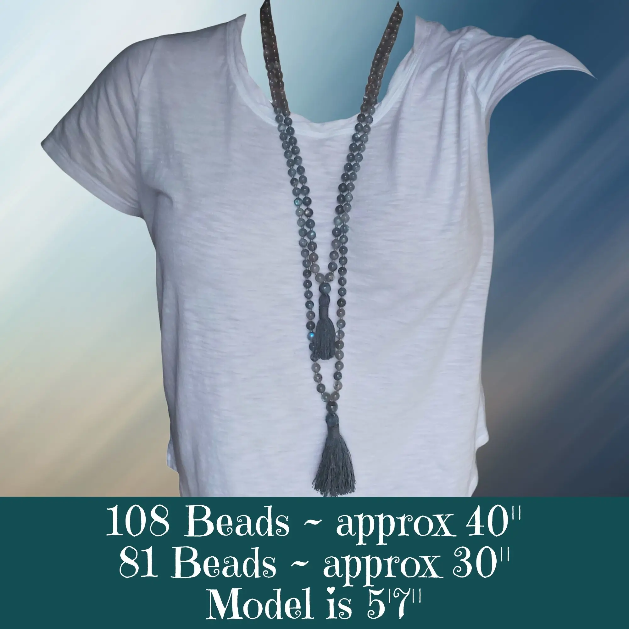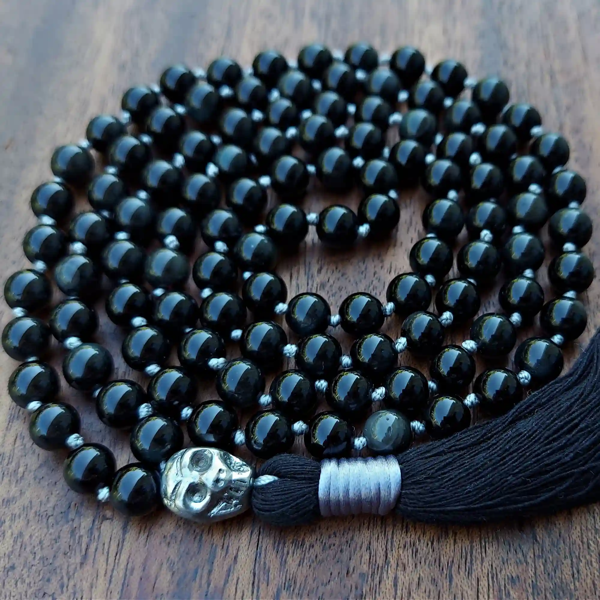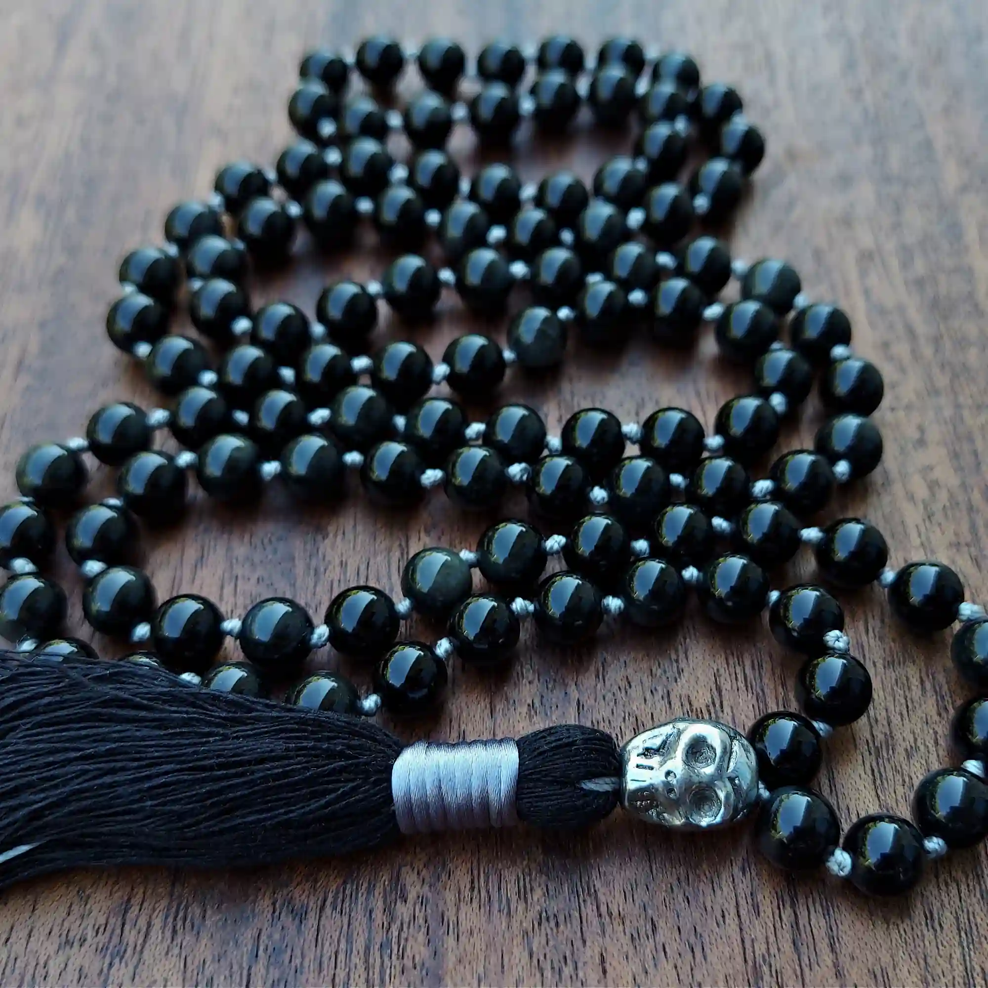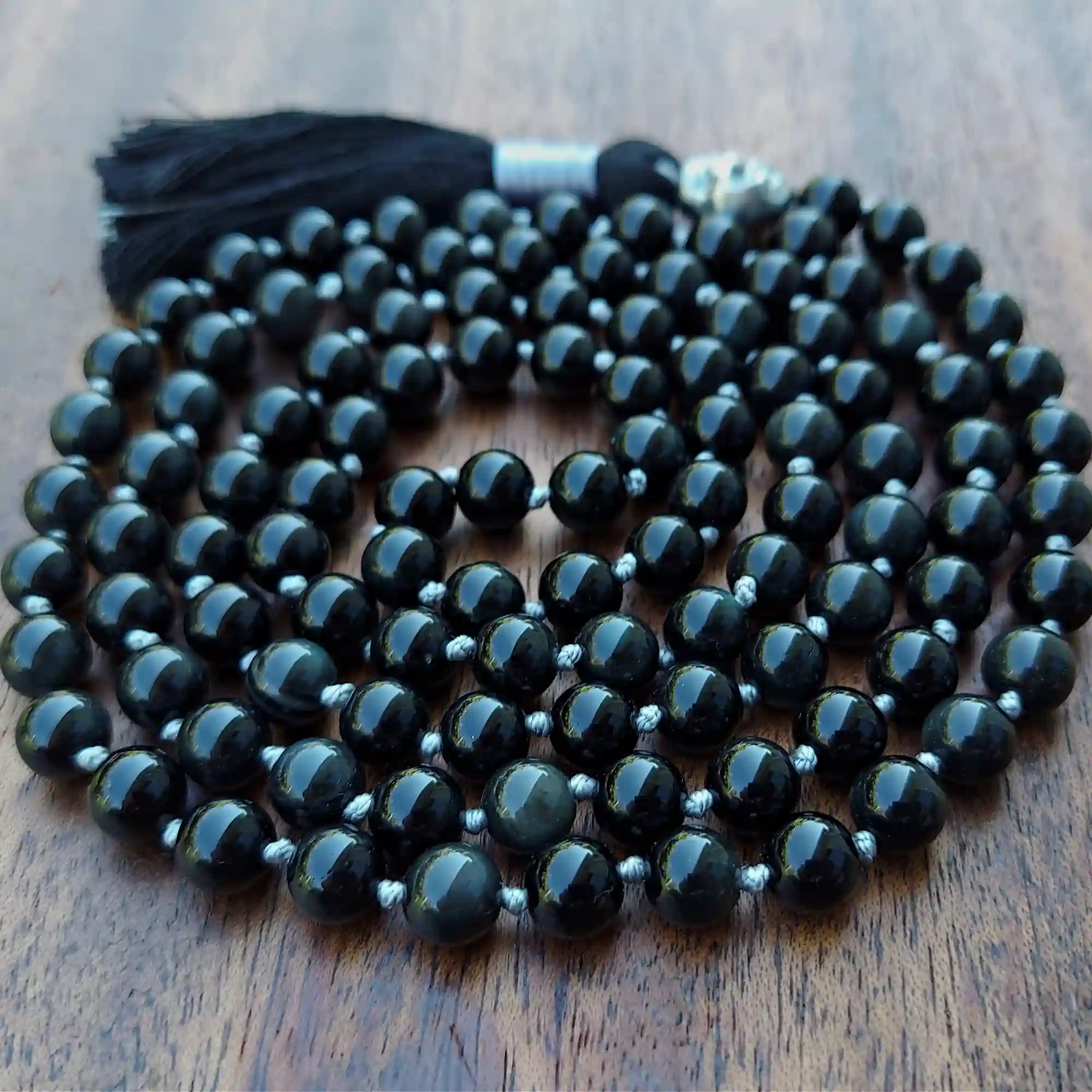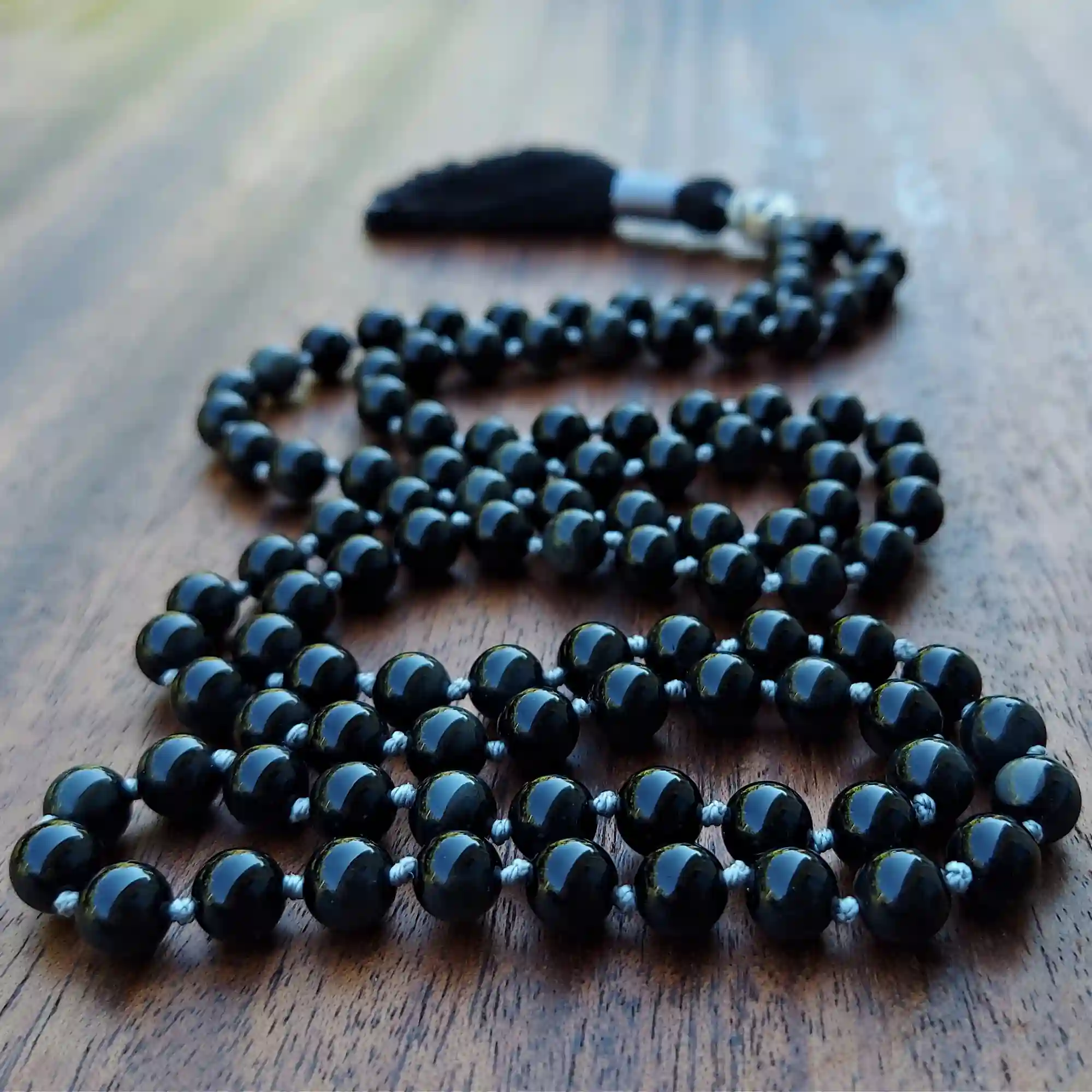 Your mala beads will include a cotton tassel and nylon cord for knots, which, unlike silk, does not rot, stretch, or fray. Cotton & nylon are far superior for something we handle and wear daily.