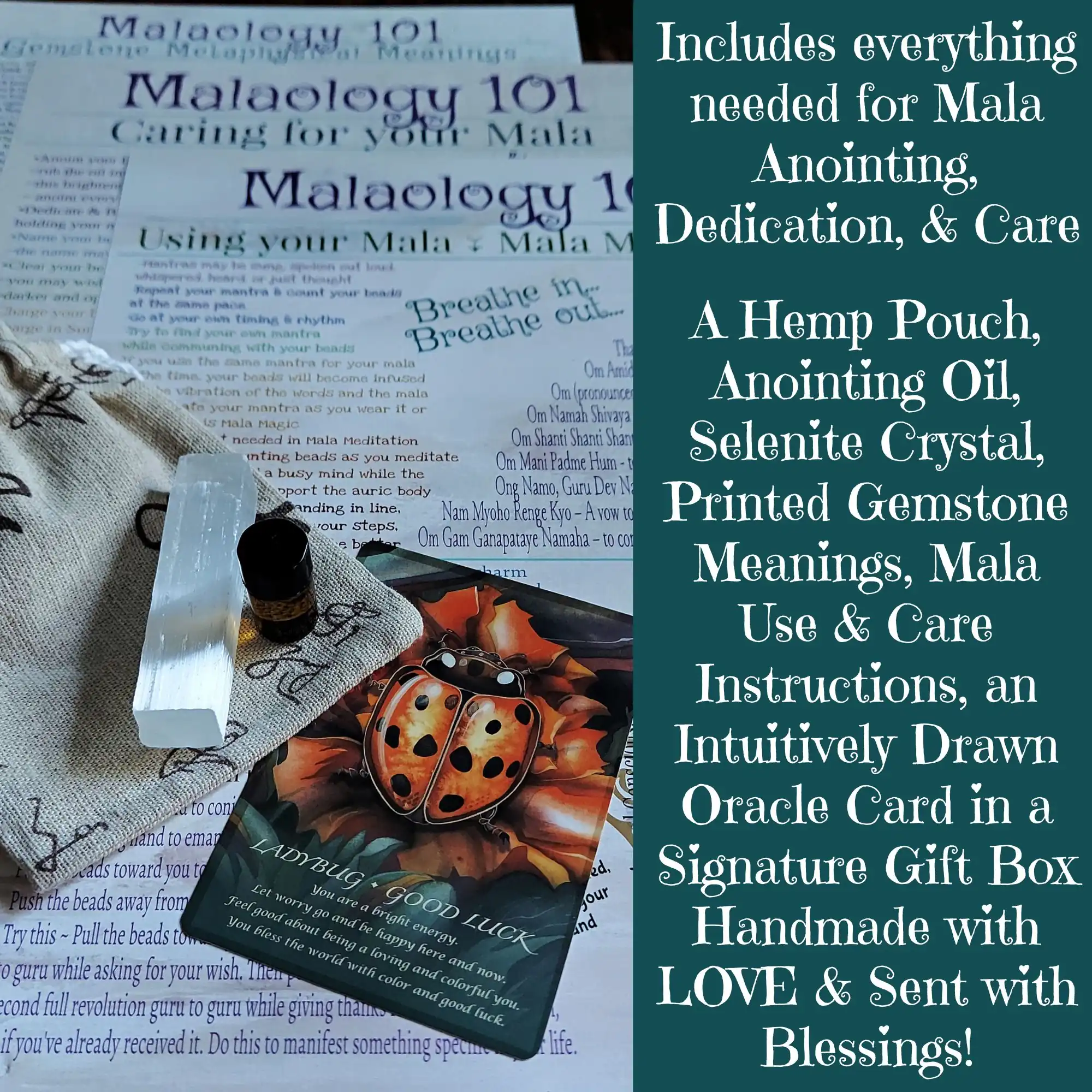 Your all-inclusive mala experience includes a fun and gift-worthy presentation with everything needed for Mala Anointing, Dedication, Use, & Care.