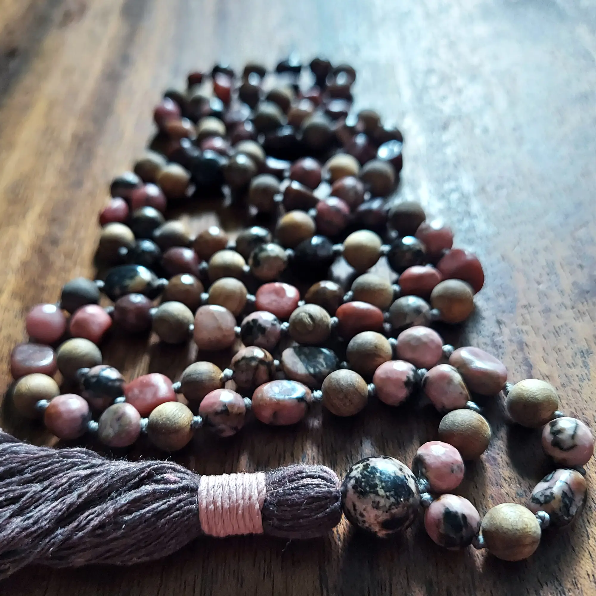 Your mala beads will include a cotton tassel and nylon cord for knots, which, unlike silk, does not rot, stretch, or fray. Cotton & nylon are far superior for something we handle and wear daily.