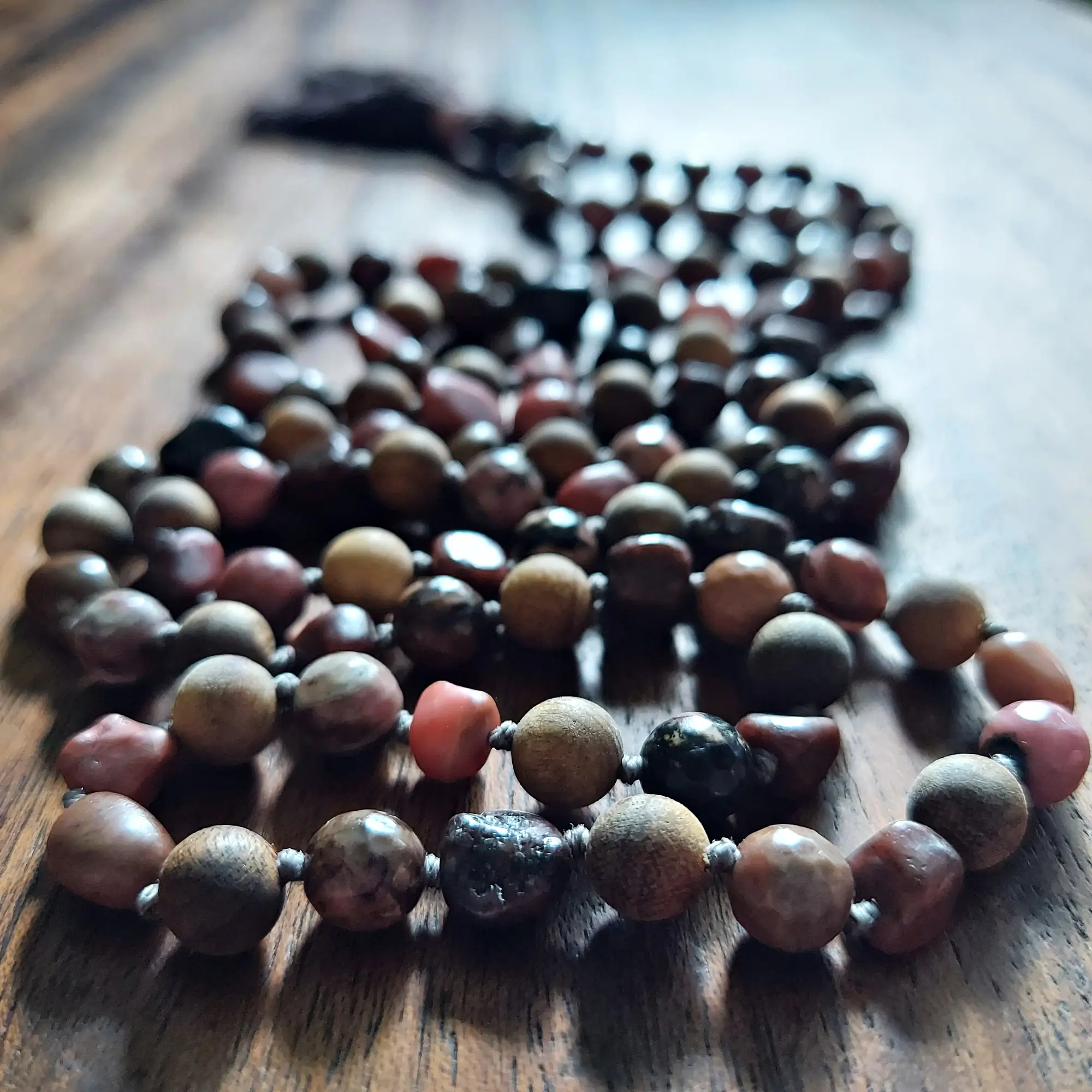 Ease your spiritual journey with our Heart Chakra Mala Necklace, featuring Rhodochrosite nuggets, faceted Rhodonite, and polished Sandalwood. Expertly hand-knotted with 8mm beads, this mala harmonizes the Heart Chakra, cultivating love, emotional healing, manifestation, and inner peace.