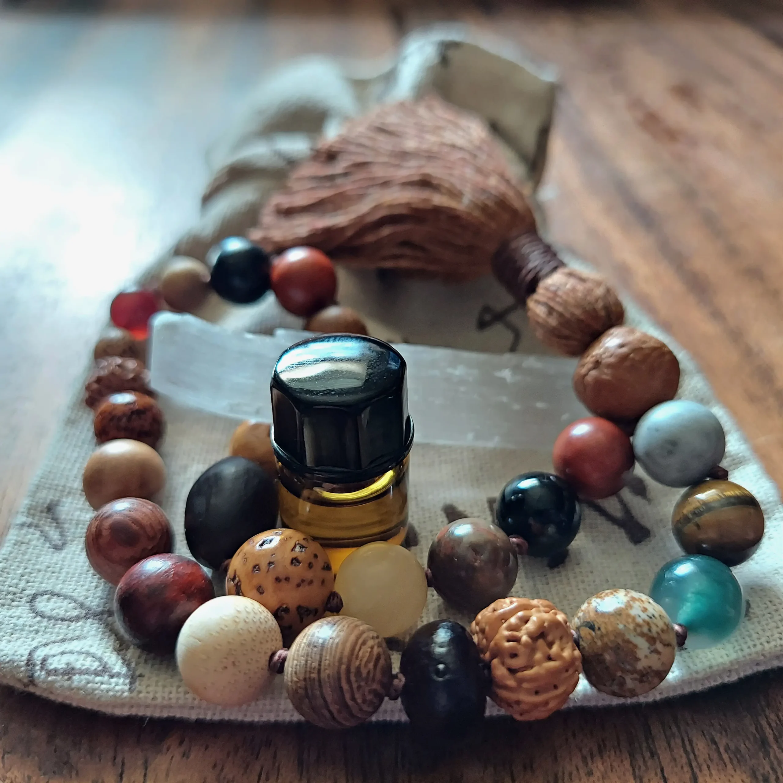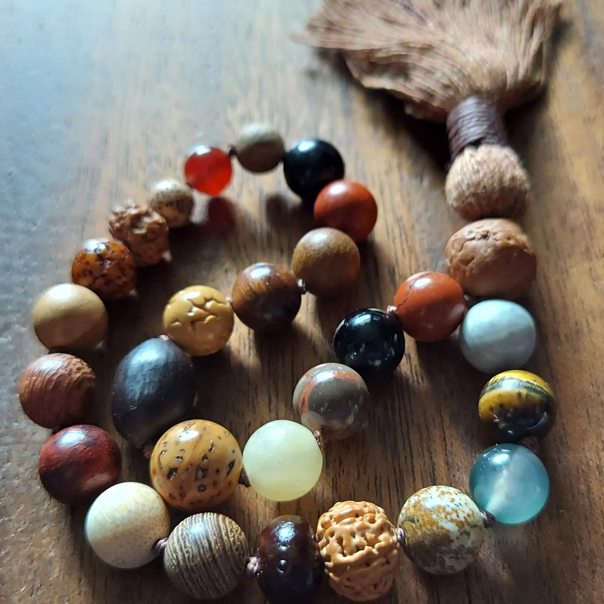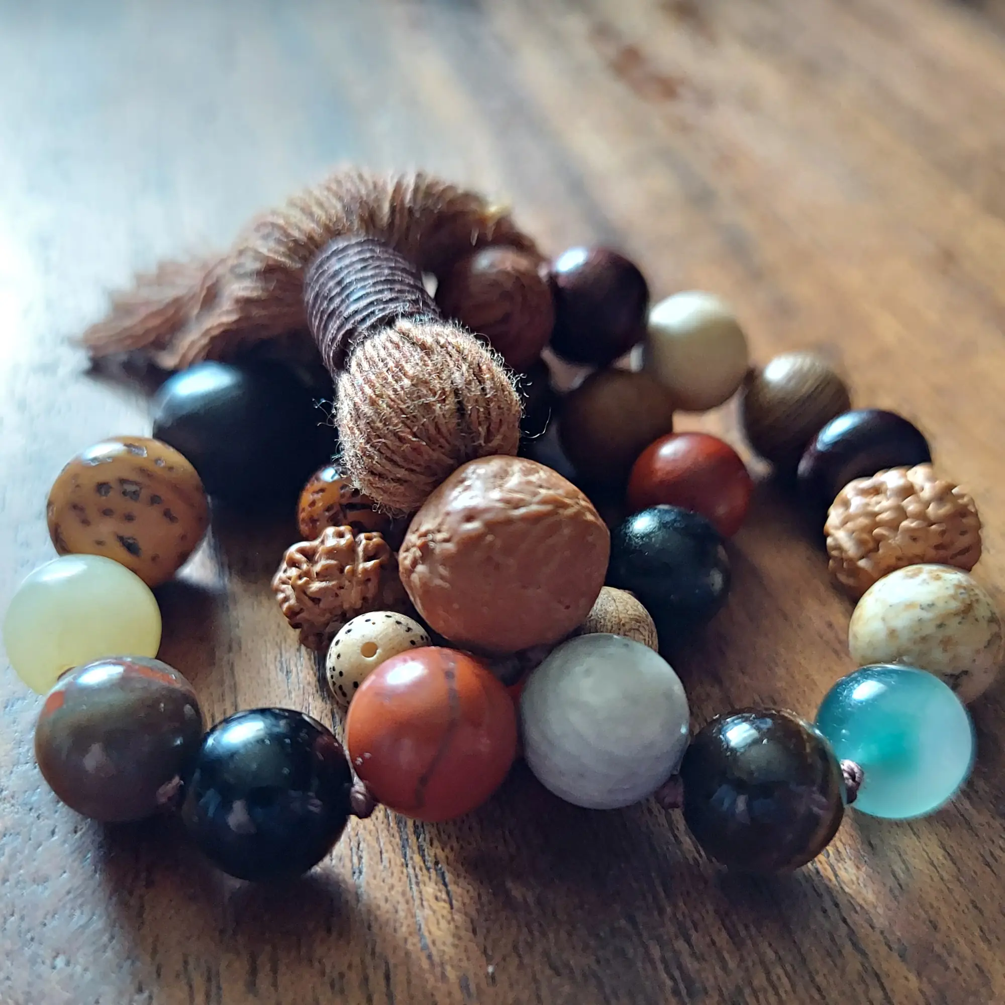 This earthy 🌿 Rooted Path Pocket Mala 📿 features a blend of chunky beads ranging from approximately 8mm to 12mm, each chosen for its grounding, protective, and stabilizing qualities. Made with Bodhi seed, Bodhi root, Rudraksha, Lotus seed, Red Jasper, Black Obsidian, Agate, Picture Jasper, Tiger’s Eye, Carnelian, Yellow Calcite, Gray Woodlace stone, and various natural woods, this mala carries a deeply rooted and ancient energy.