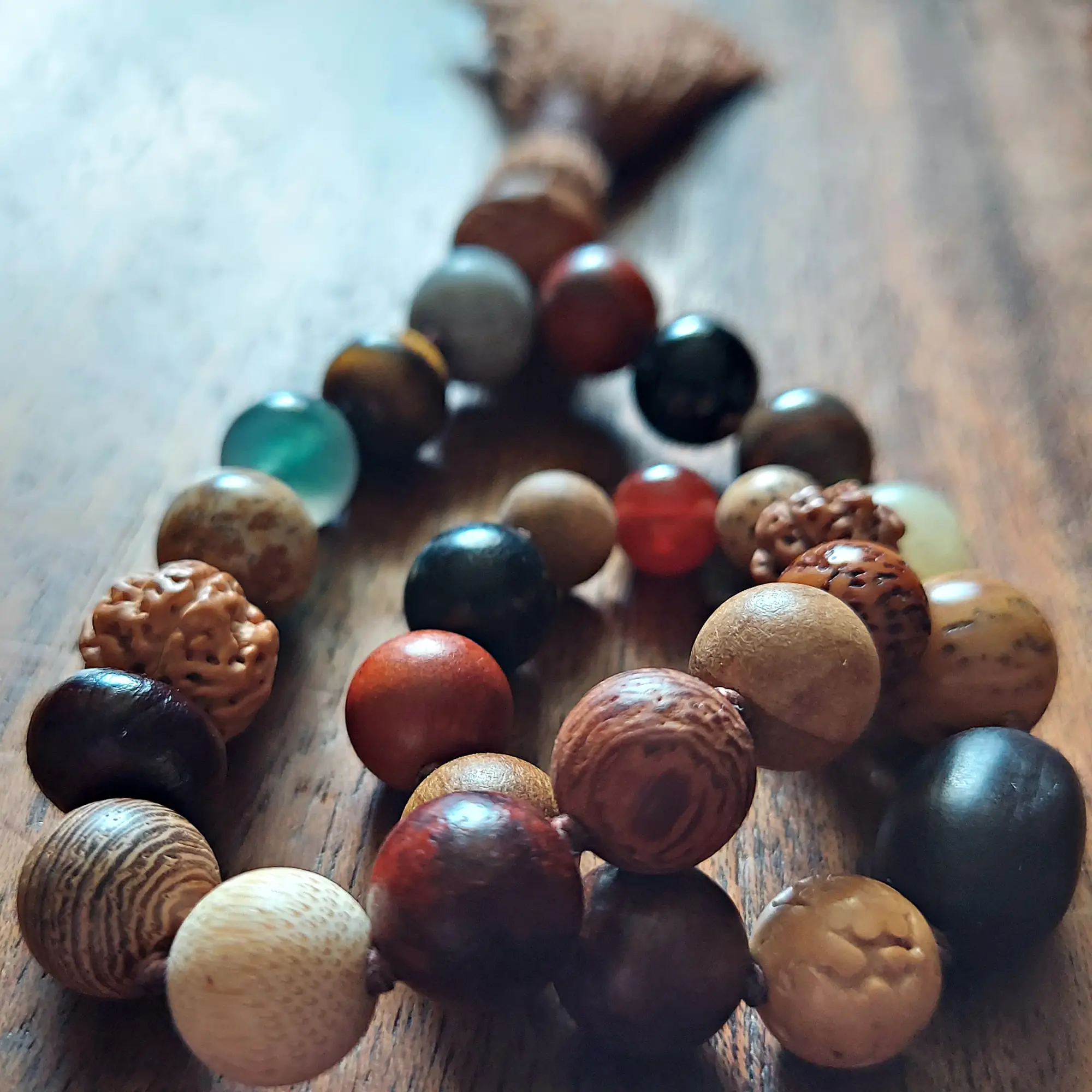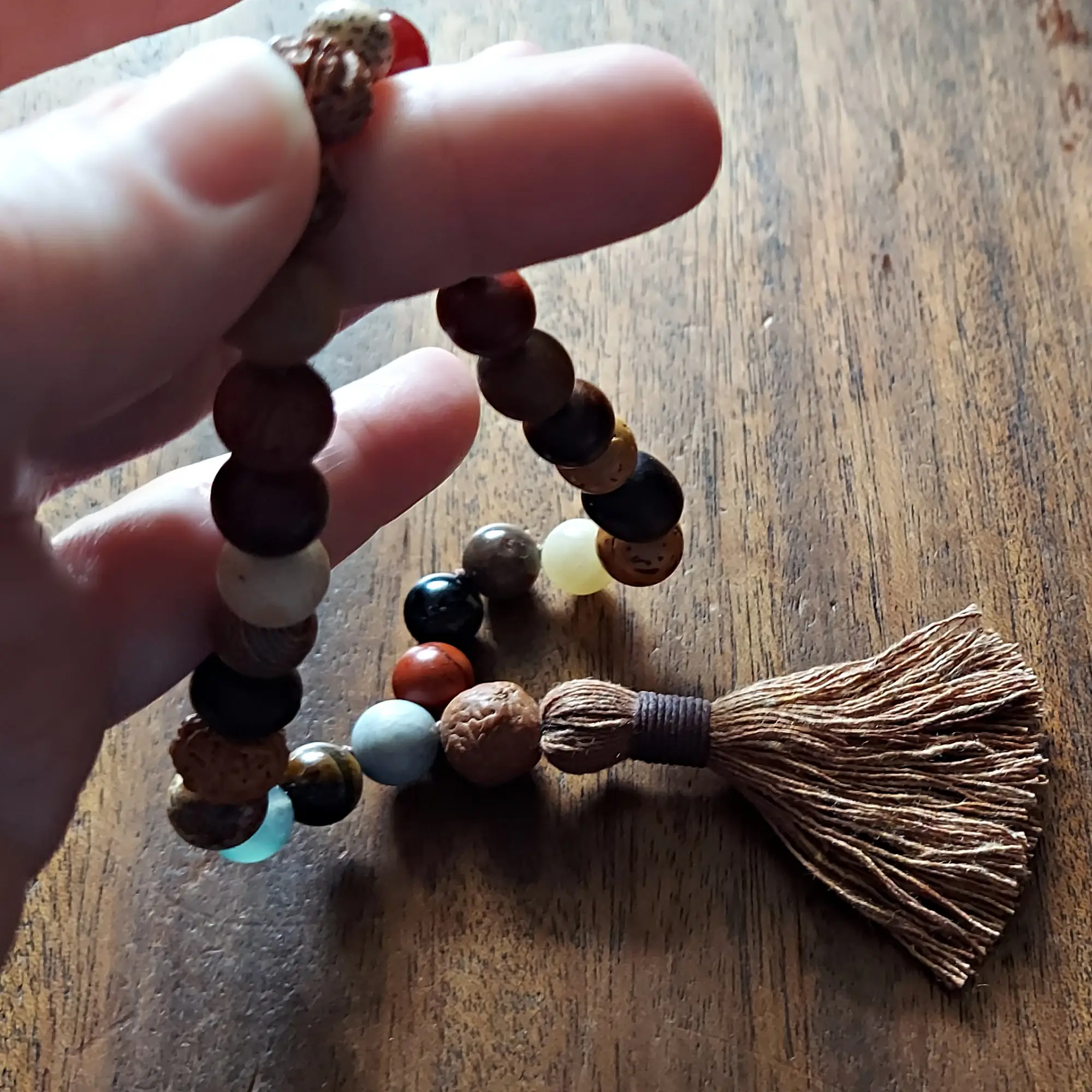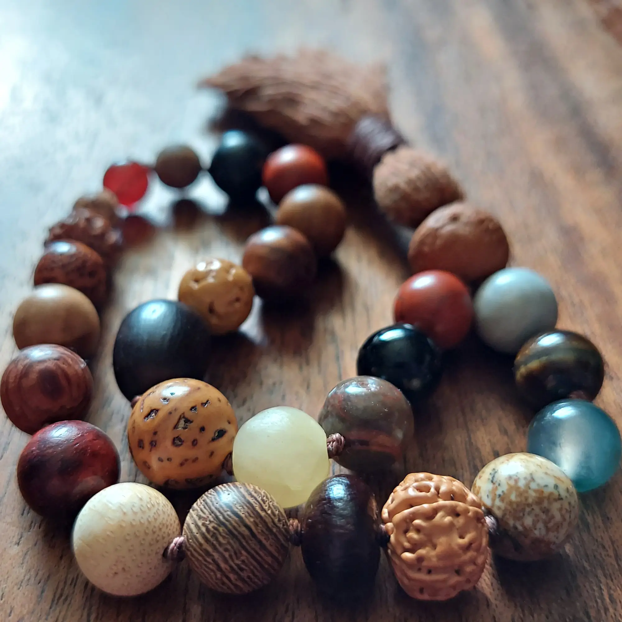 This earthy 🌿 Rooted Path Pocket Mala 📿 features a blend of chunky beads ranging from approximately 8mm to 12mm, each chosen for its grounding, protective, and stabilizing qualities. Made with Bodhi seed, Bodhi root, Rudraksha, Lotus seed, Red Jasper, Black Obsidian, Agate, Picture Jasper, Tiger’s Eye, Carnelian, Yellow Calcite, Gray Woodlace stone, and various natural woods, this mala carries a deeply rooted and ancient energy.