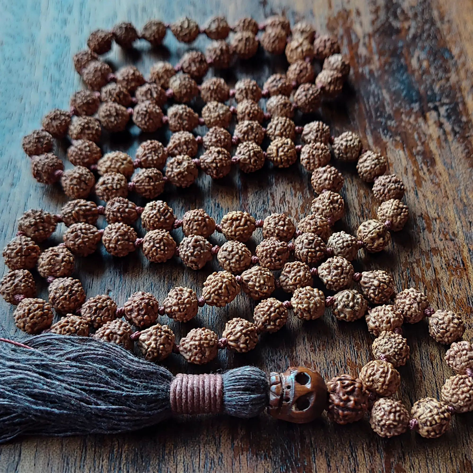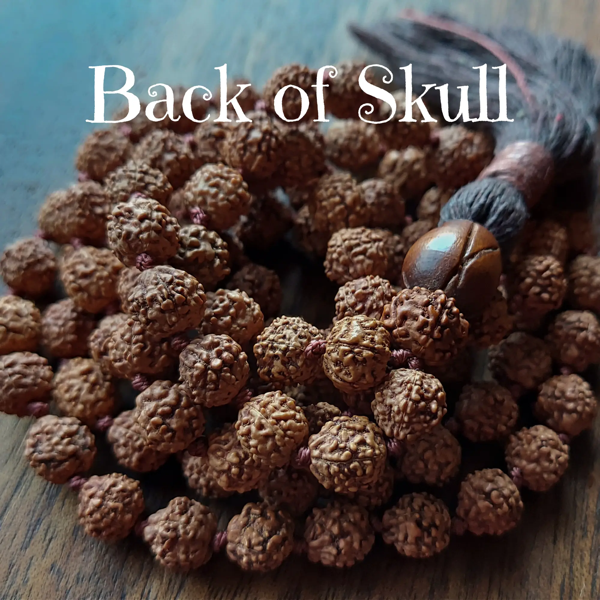 This unique Rudraksha and Ebony Skull mala, crafted from genuine Rudraksha seeds, helps you to awaken your spiritual potential and cultivate inner peace. Its lightweight design offers gentle support on your journey toward higher consciousness.
