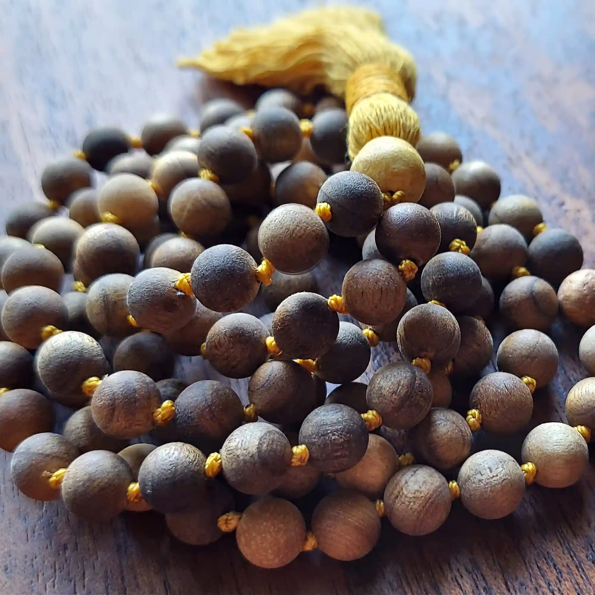 Your mala beads will include a cotton tassel and nylon cord for knots, which, unlike silk, does not rot, stretch, or fray. Cotton & nylon are far superior for something we handle and wear daily.
