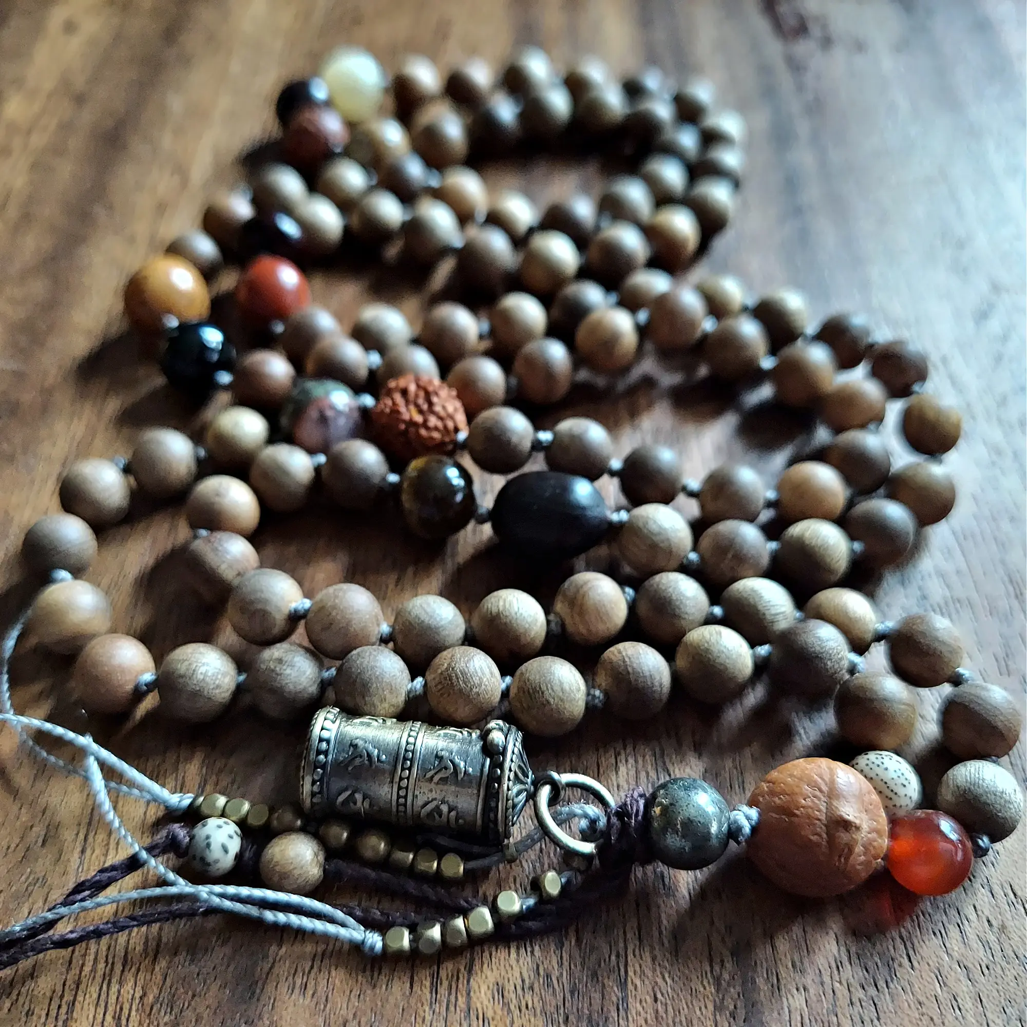 Your mala beads will include a cotton tassel and nylon cord for knots, which, unlike silk, does not rot, stretch, or fray. Cotton & nylon are far superior for something we handle and wear daily.