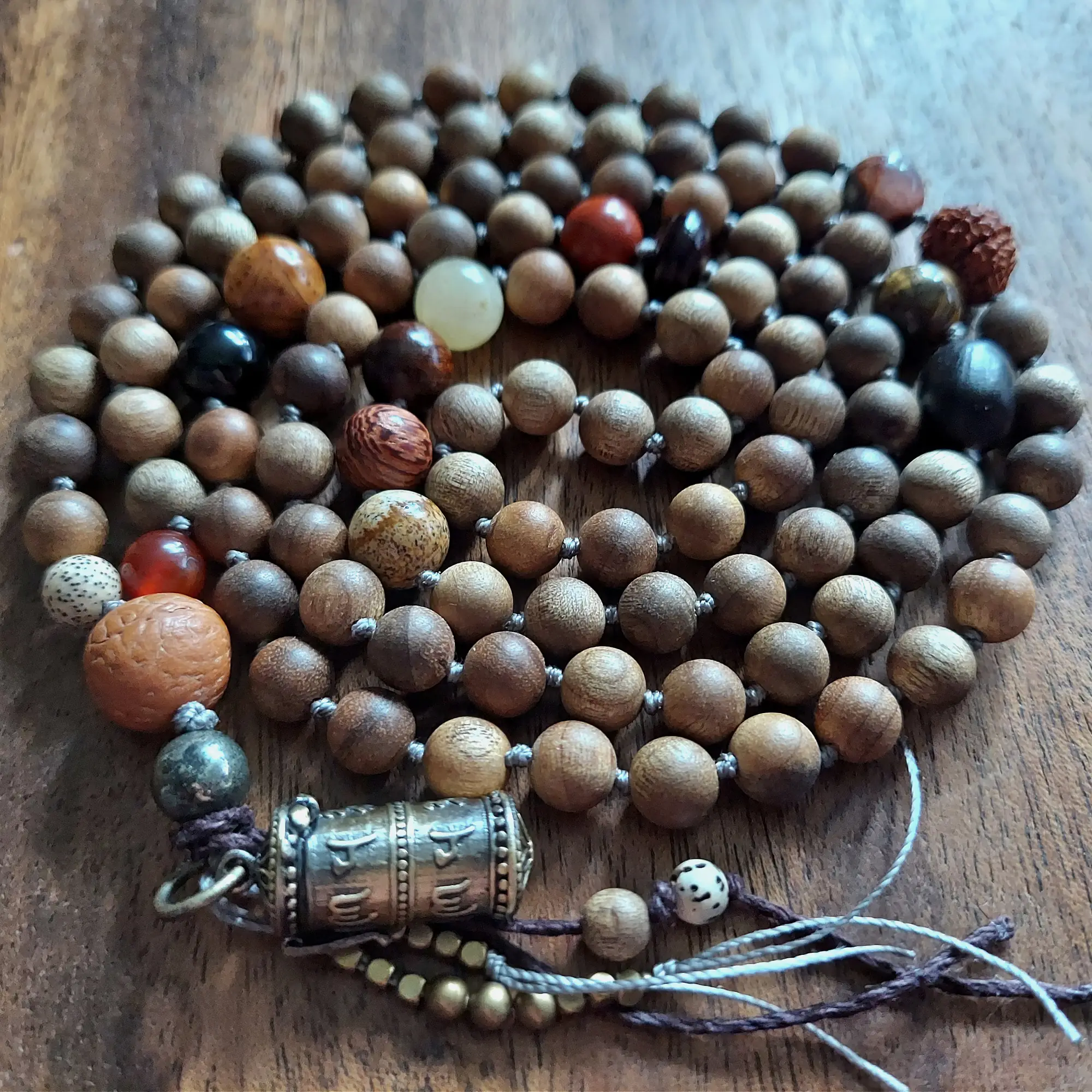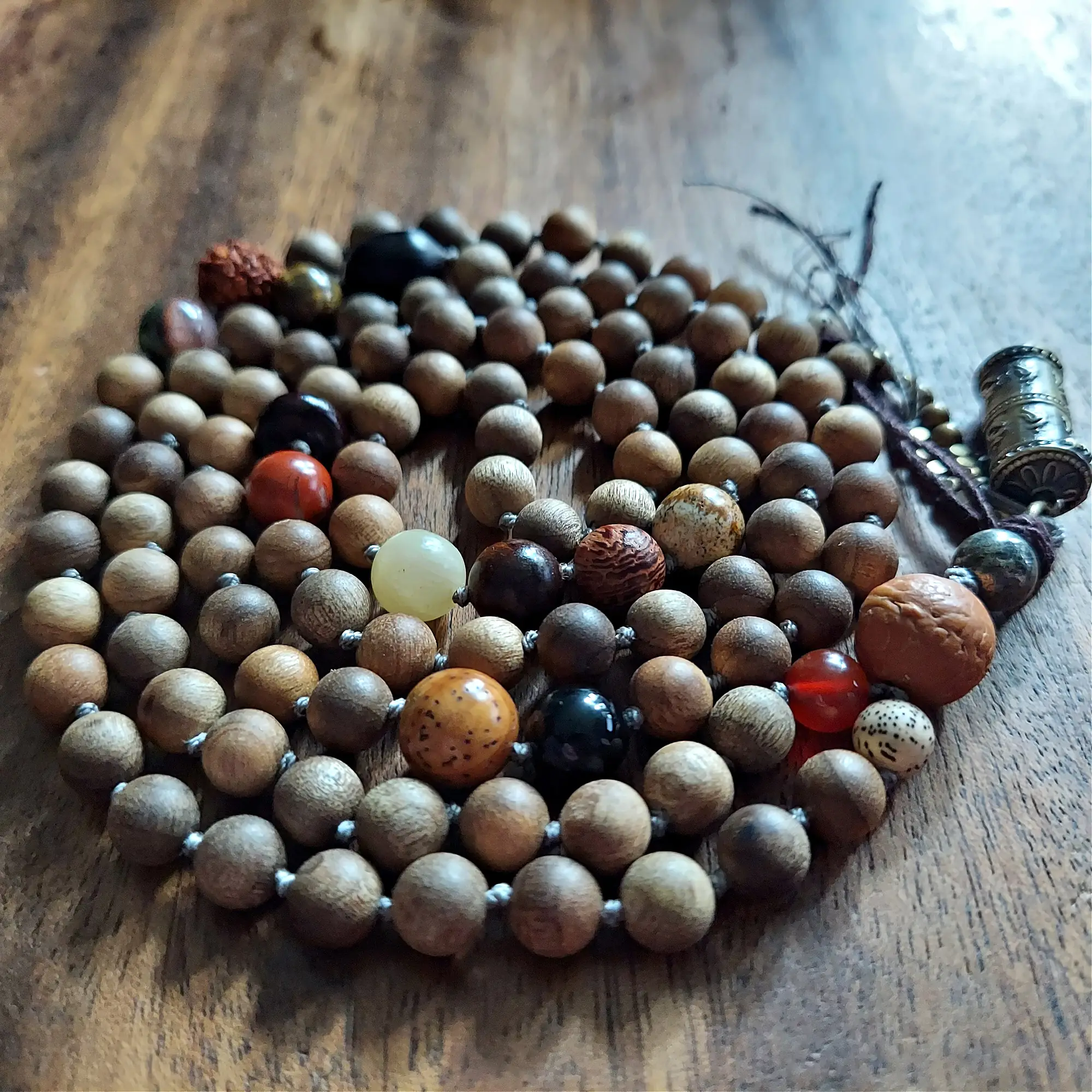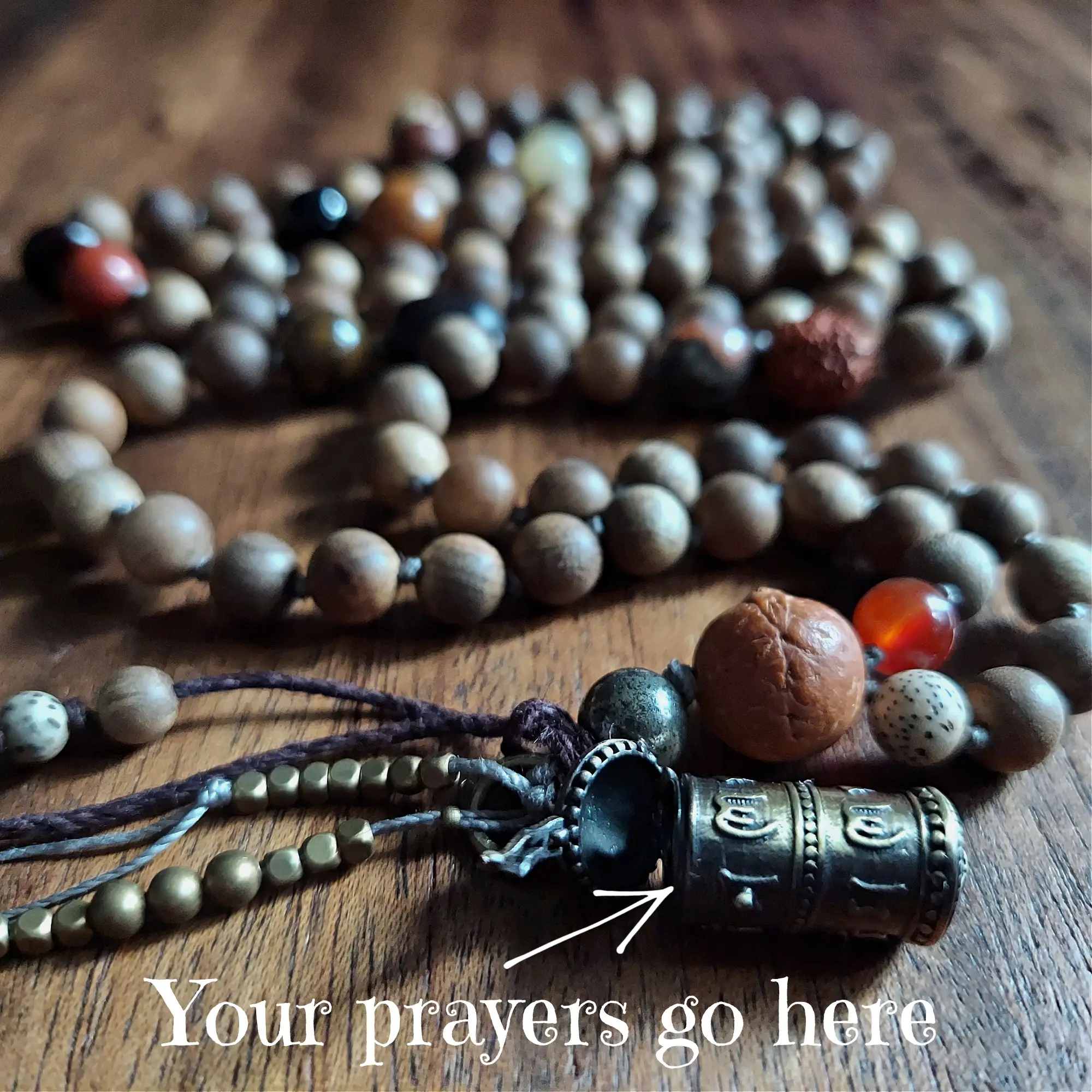 Wear your prayers and embrace true peace with this beautifully crafted Sandalwood Prayer Mala. Designed to support your spiritual journey, this mala features an empowering blend of Sandalwood, Mixed Woods, Seeds, Gemstones, and a Bronze Prayer Box that holds your prayers and blessings.